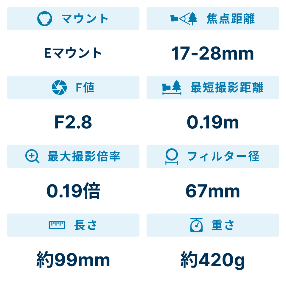 もっと日常的に大口径超広角を使っていただきたい。そのため、ユーザビリティにこだわりました。ズーム域をあえて焦点距離17-28mmとすることで、長さ99mm、質量420gという驚異的な軽量・コンパクト化を実現。