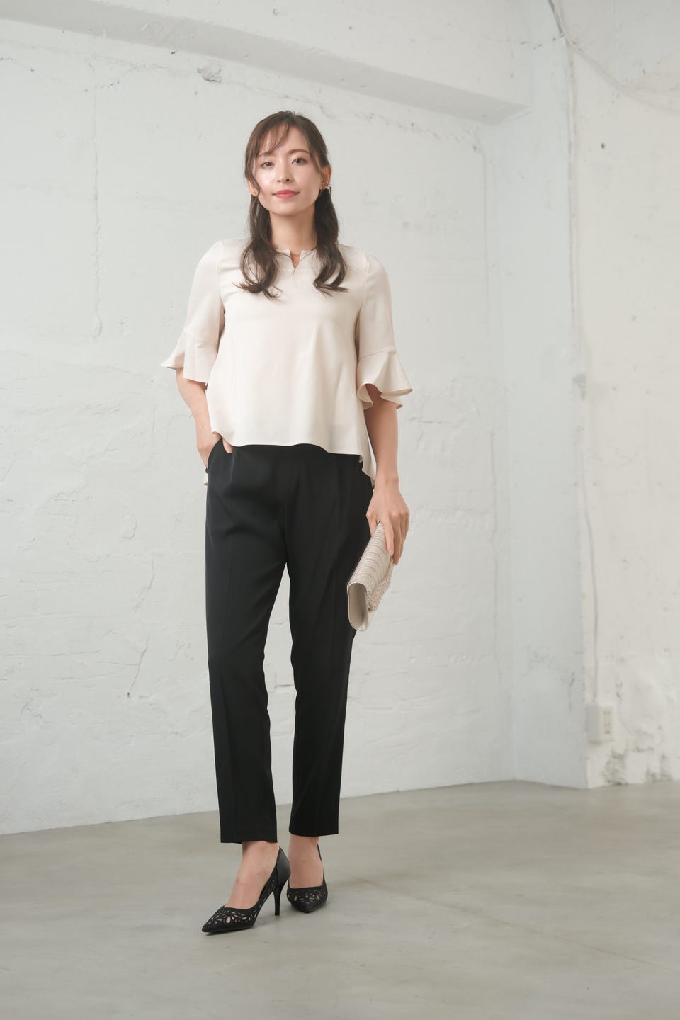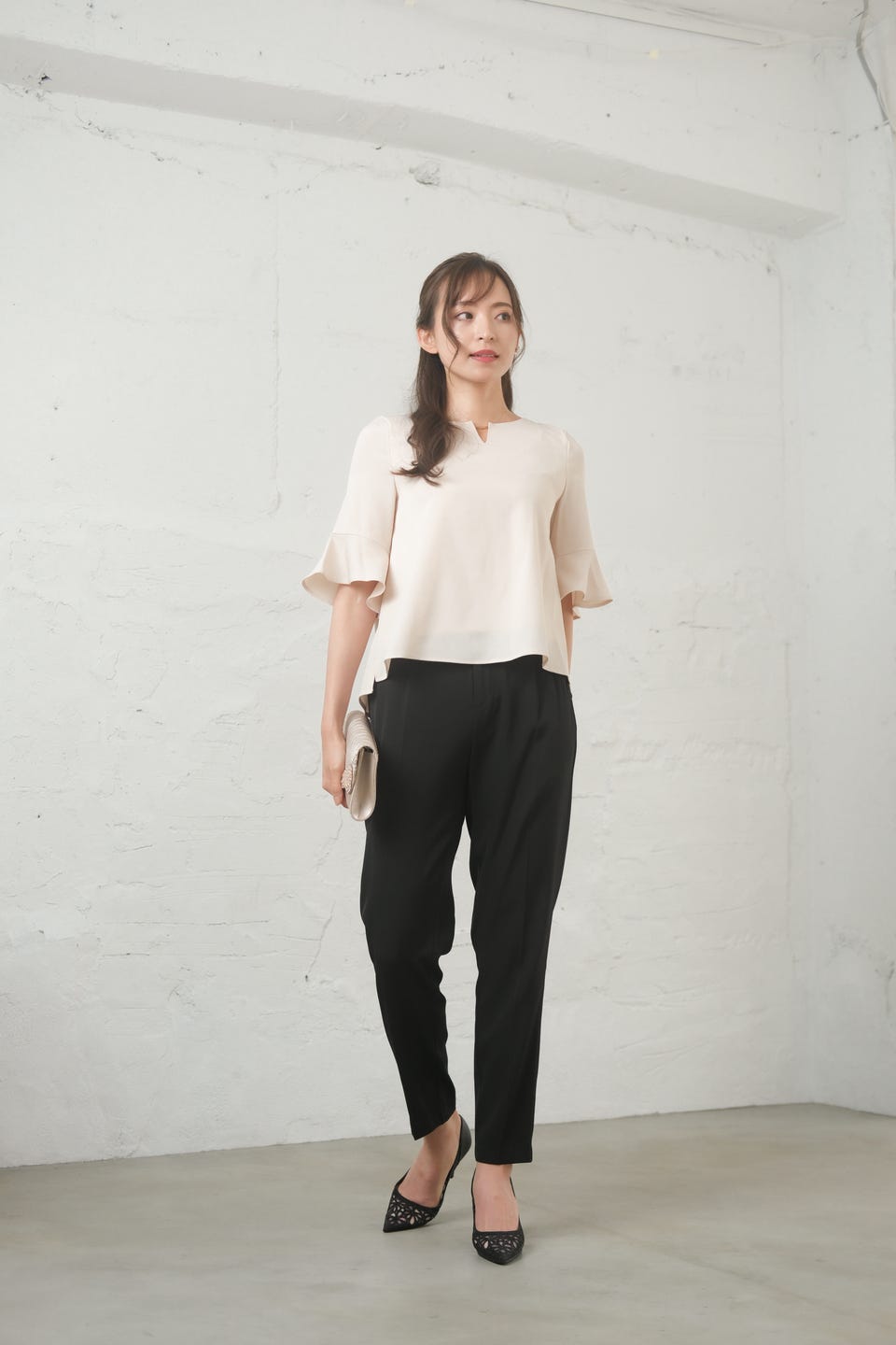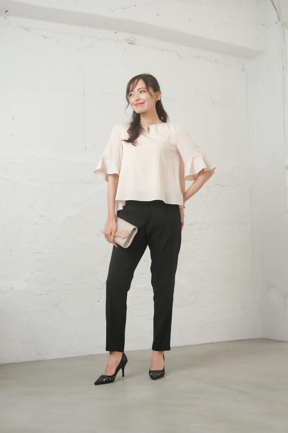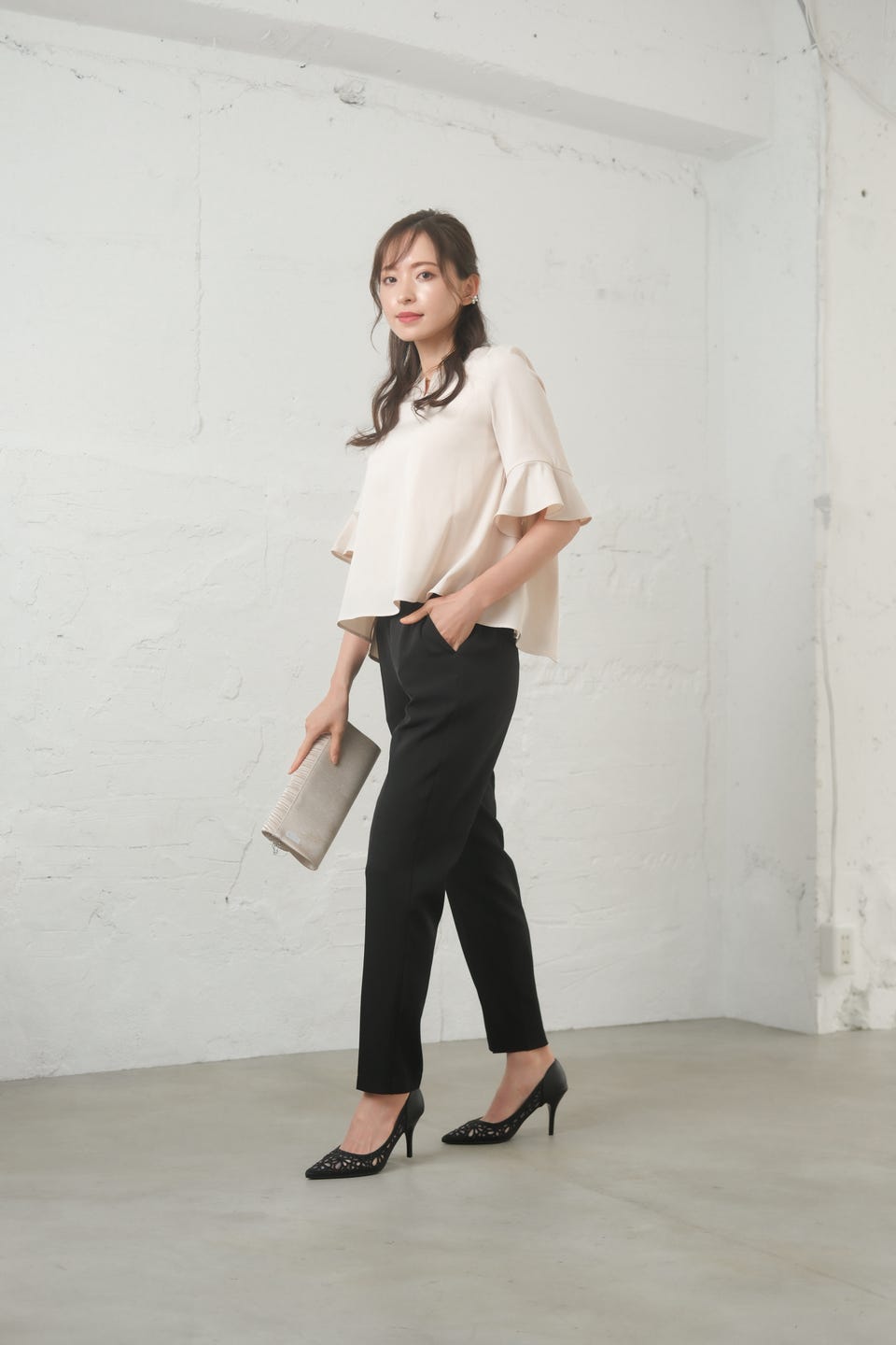ブラウスのバックスタイルはフラワーレースが覗き、奥行きのある着こなしができる大人のセットアップ
