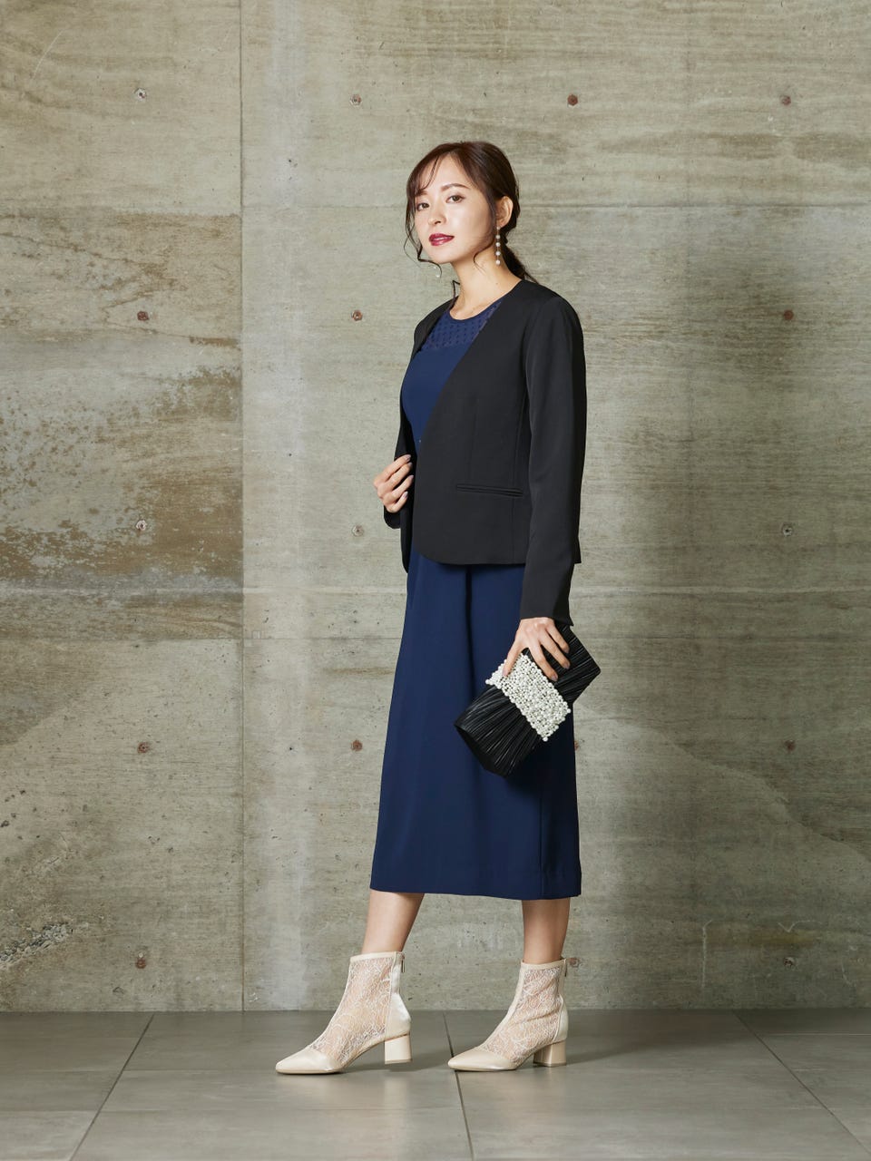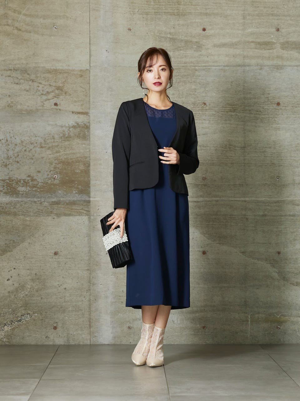 首元をスッキリみせ、上品な印象を作れるノーカラージャケット