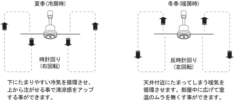 回転を変更する事で、下方向にも上方向にも風を送ることができ、冷暖房効率を上げ、お部屋の空気を循環させます。