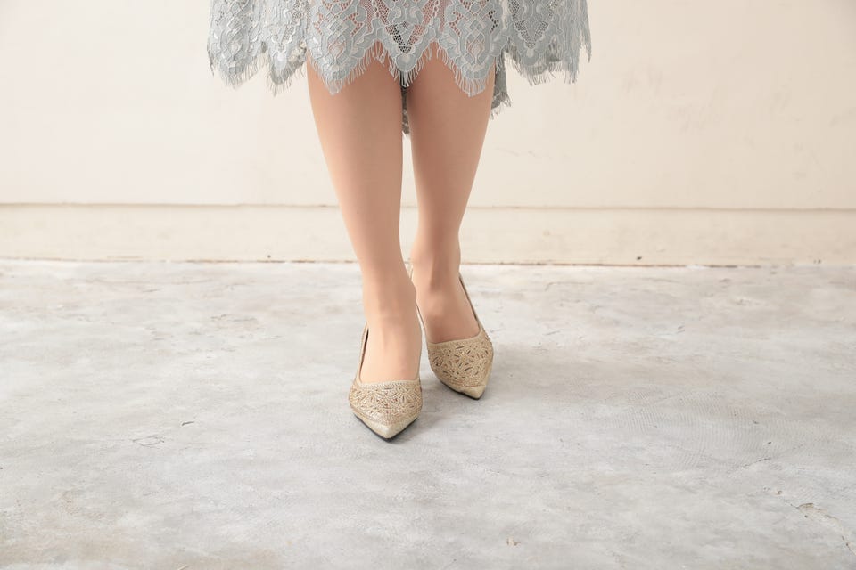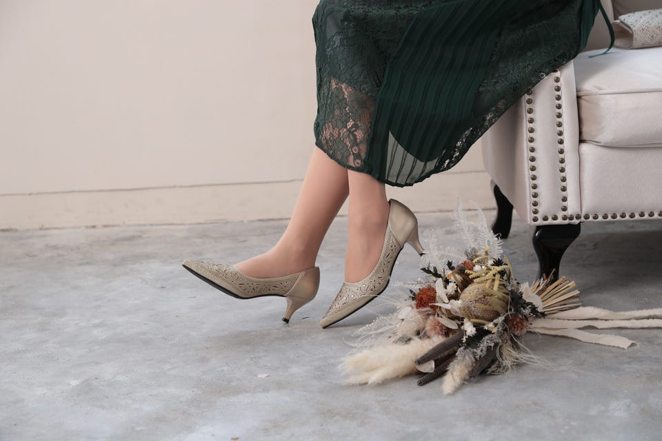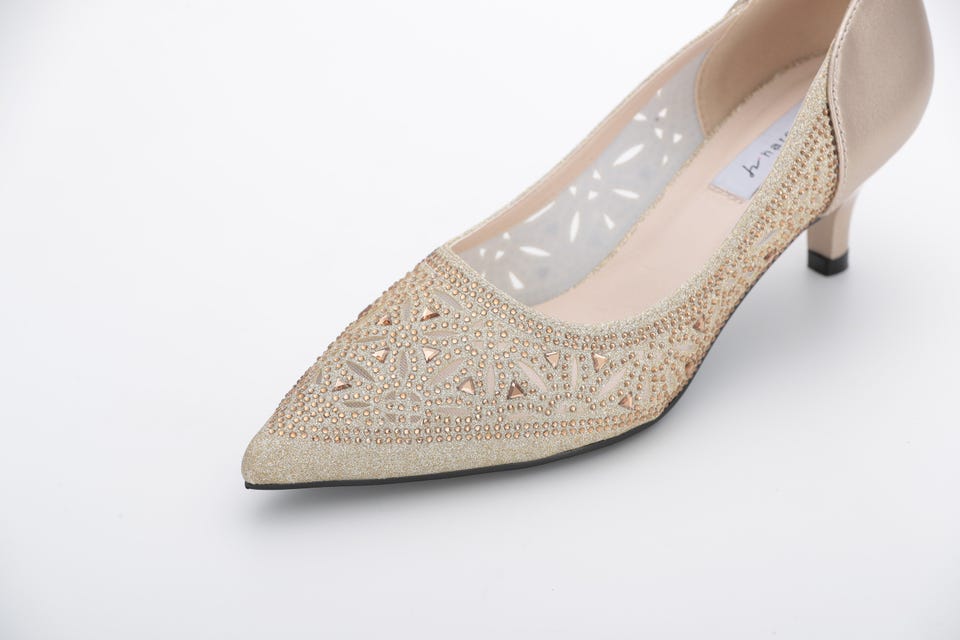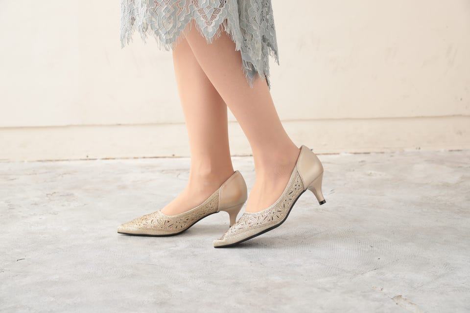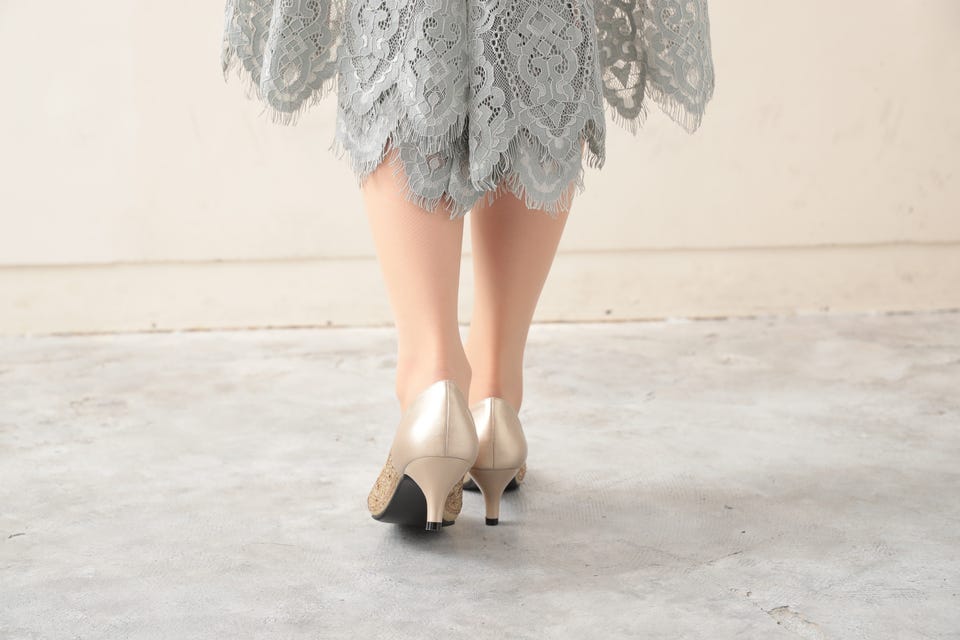 深めの履き口で、しっかりとホールド感もあり、安定感のある5cmヒールだから長時間のパーティーシーンでも無理せず履いてられます。 中敷は低反発クッションが入っています。