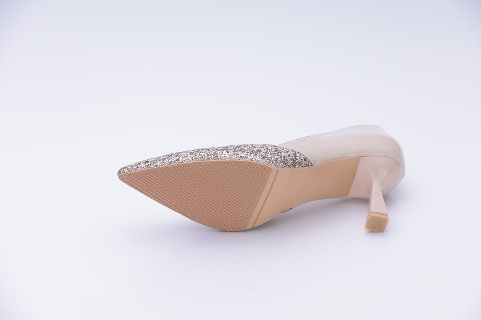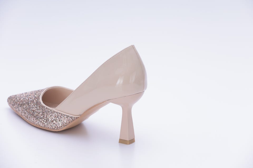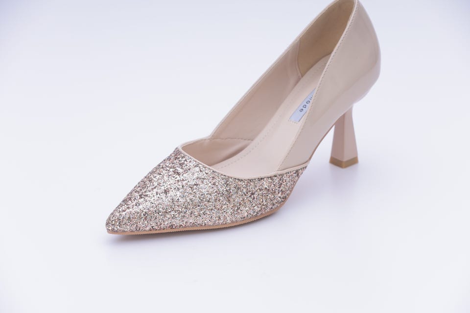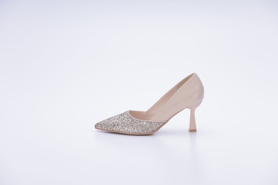 きらきら輝くグリッター(ラメ)生地を全体的にほどこした華やかなパンプス。