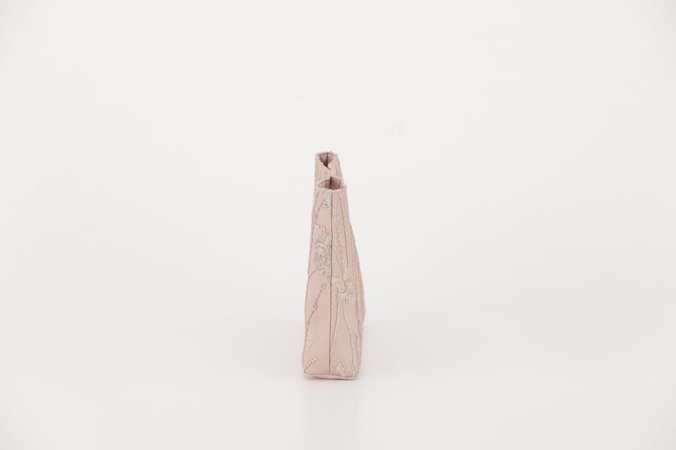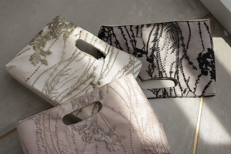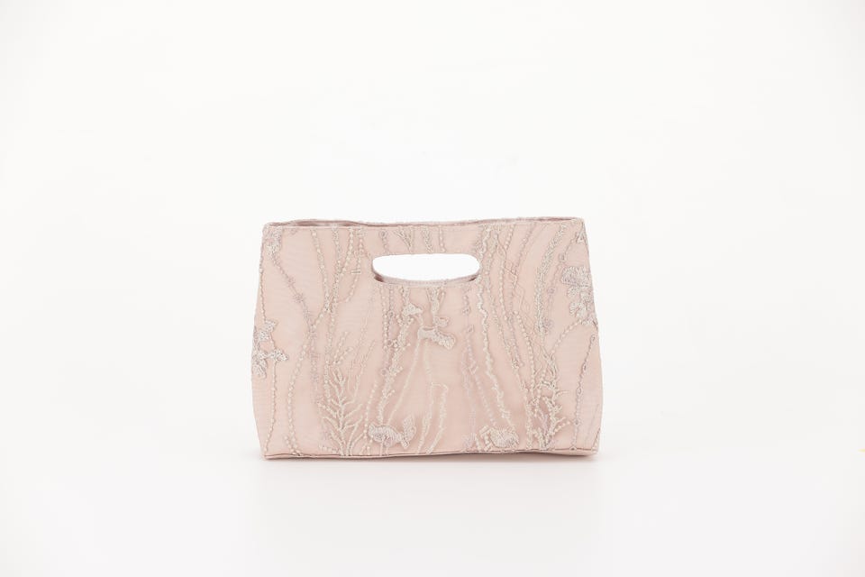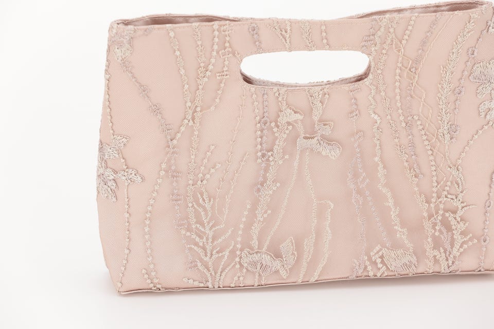 エンブロイダリーチュールドレスと同じデザインの刺繍生地を使用したハンドル一体型のパーティバッグです。ミニマムサイズながらもマチは6cmとしっかり荷物が収納できる嬉しいサイズ。
