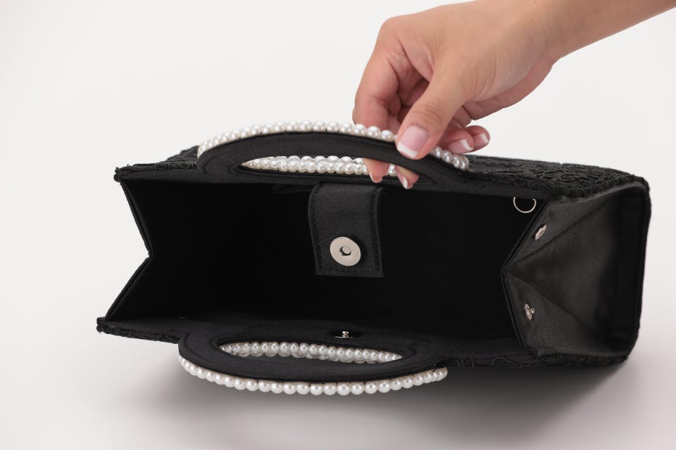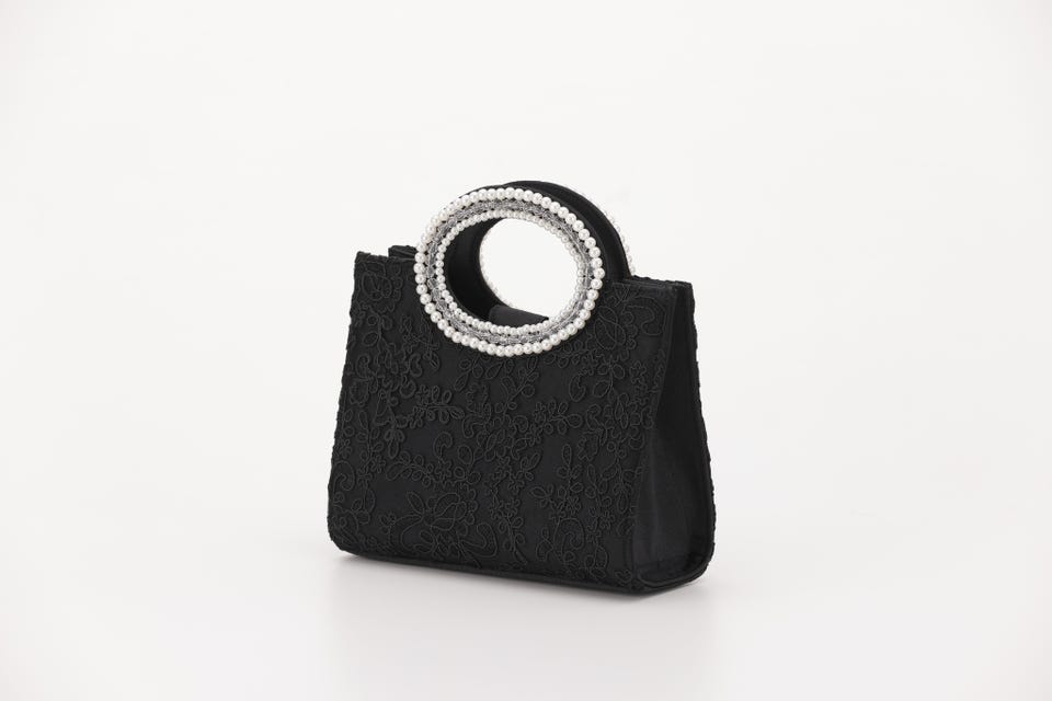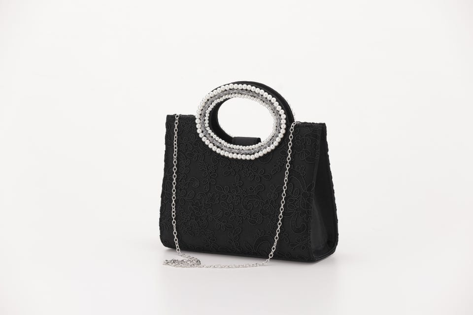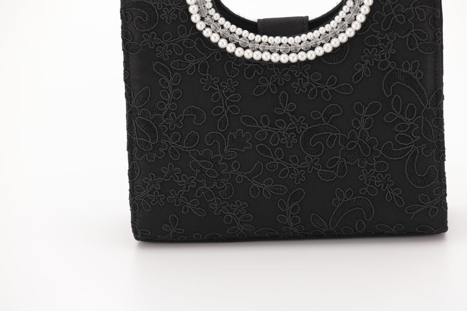 パールと刺繍で女性らしさをアップさせてくれるパーティバッグ。口が大きく開き、収納力も抜群なので荷物が多くなりがちな日も安心して出かけられます。