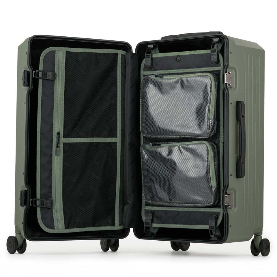 滑らかな走行と静音性を備えた独自開発のキャスターを搭載。荷造りが便利な奥行のあるデザインにスリムフレームが荷物をガード。