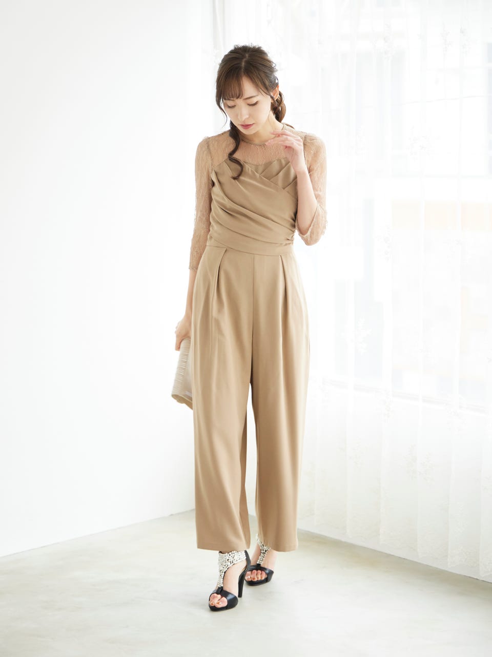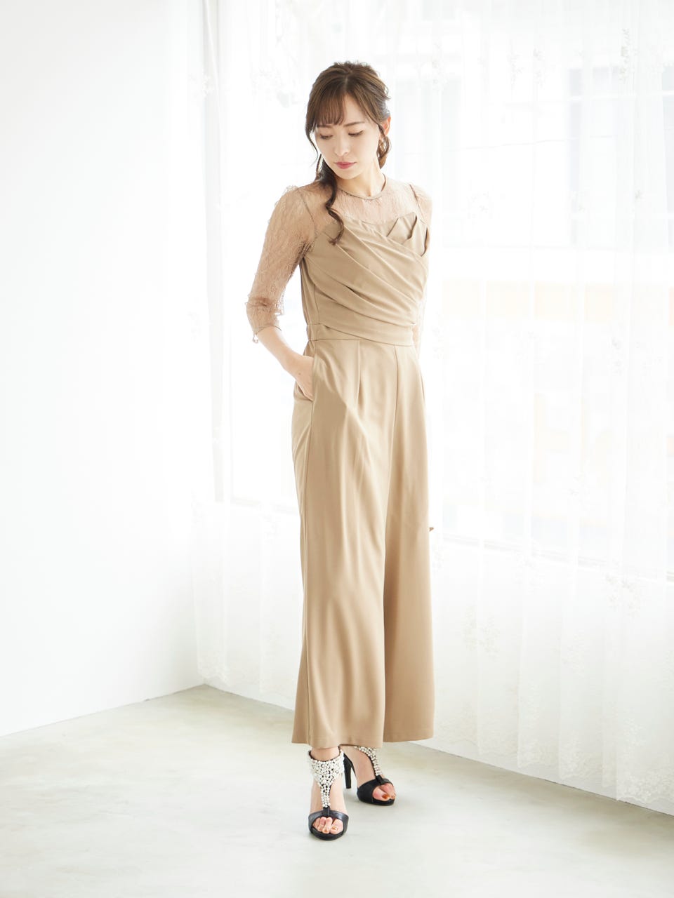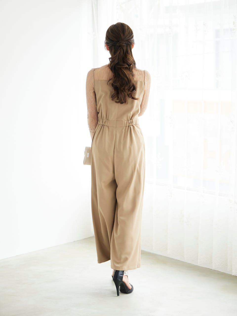 花柄のレースでスッキリ感もあるシルエットが魅力のオールインワンタイプのパンツドレスです。