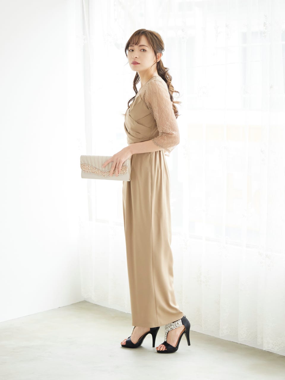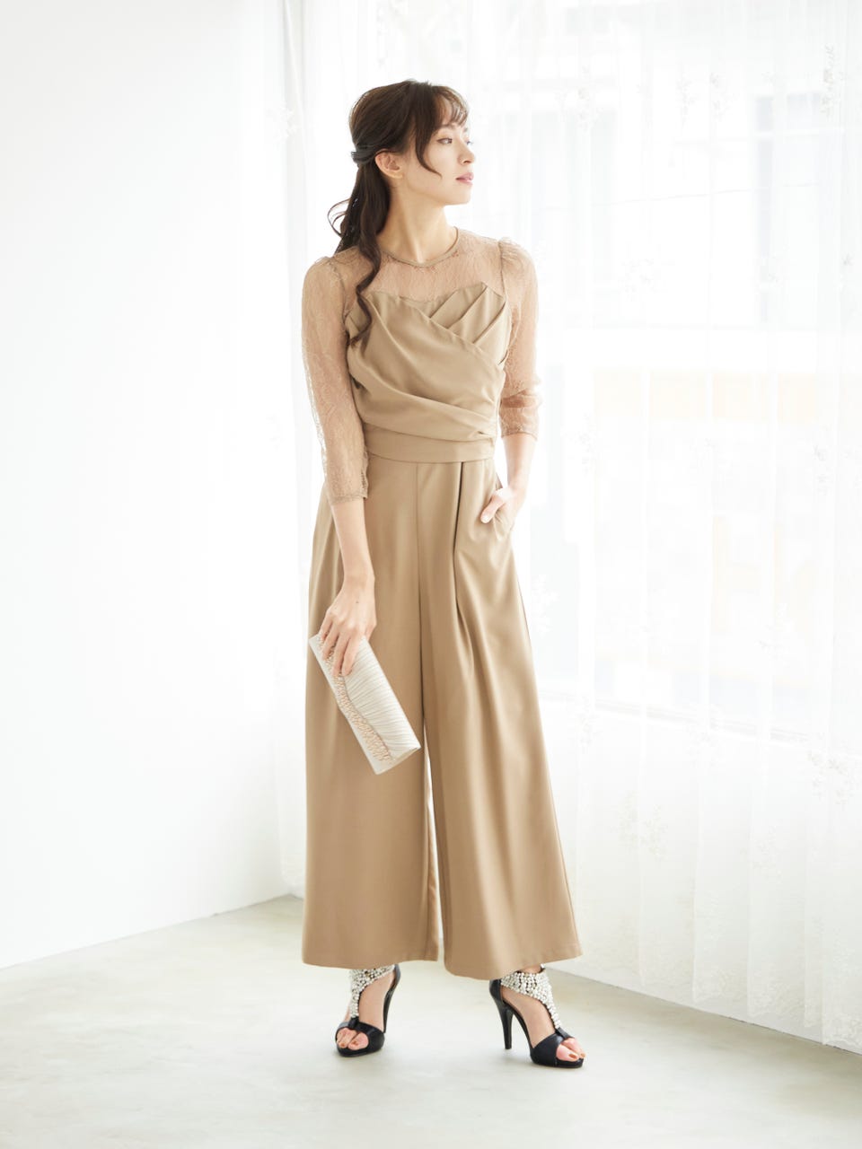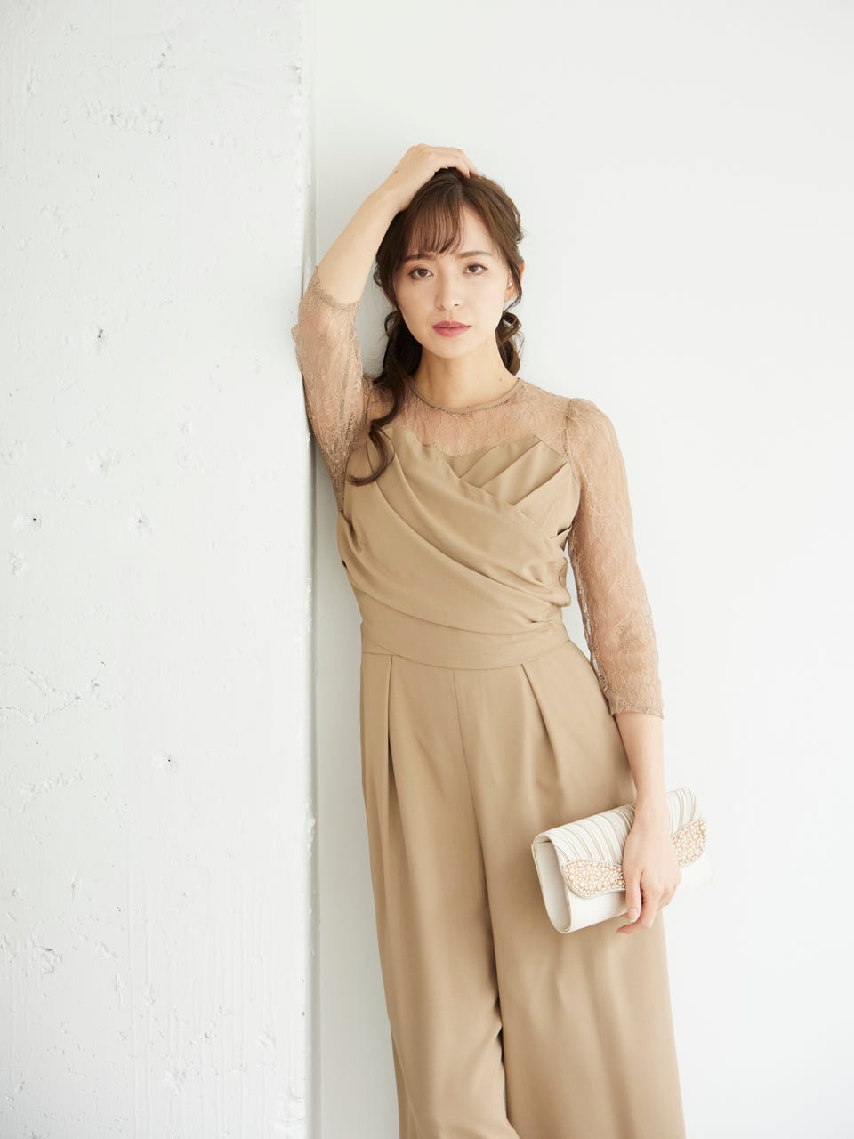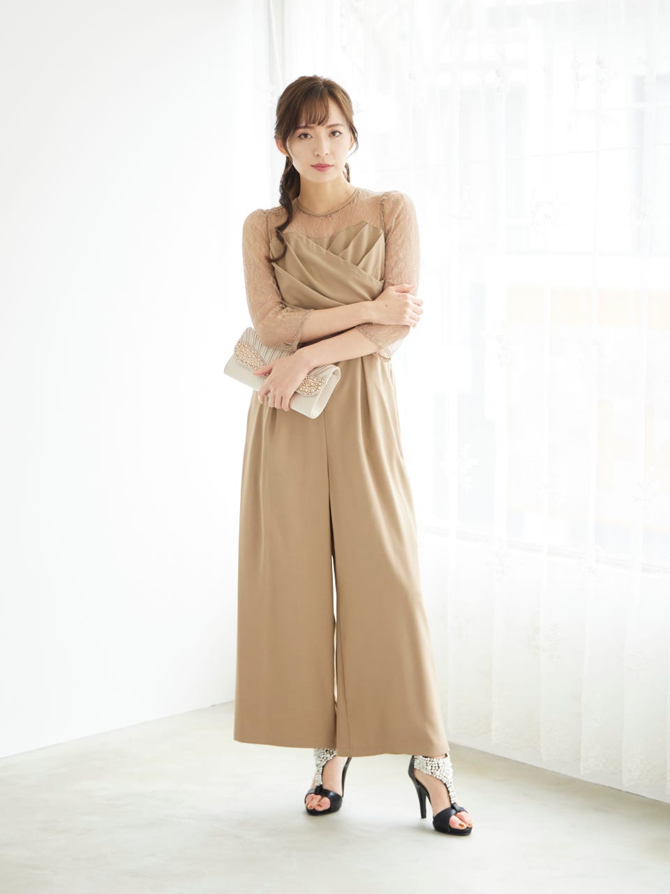 花柄のレースでスッキリ感もあるシルエットが魅力のオールインワンタイプのパンツドレスです。