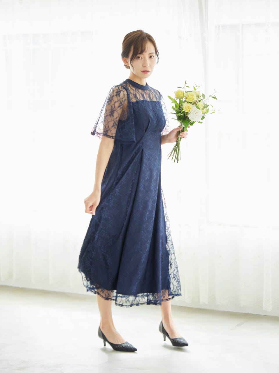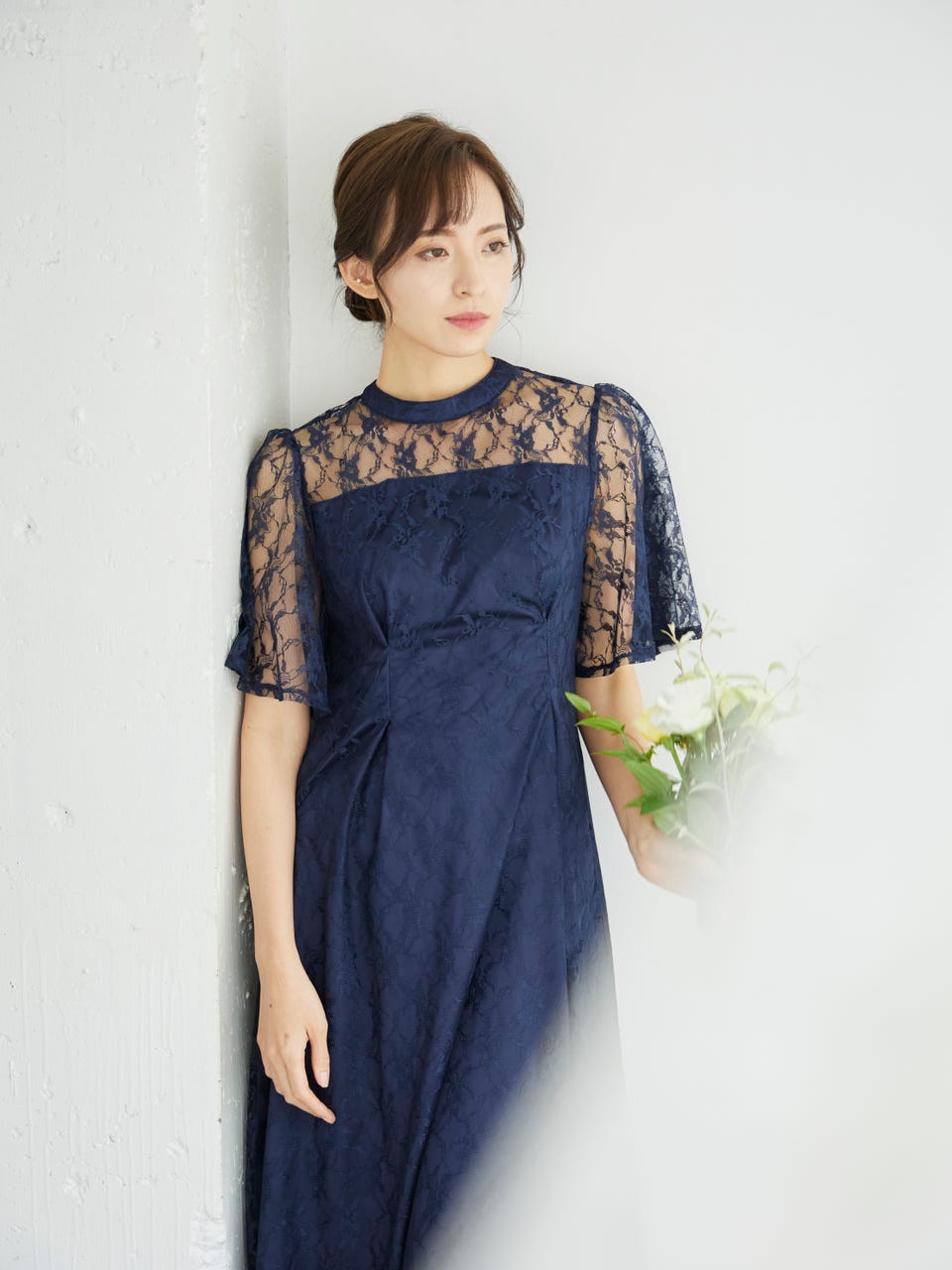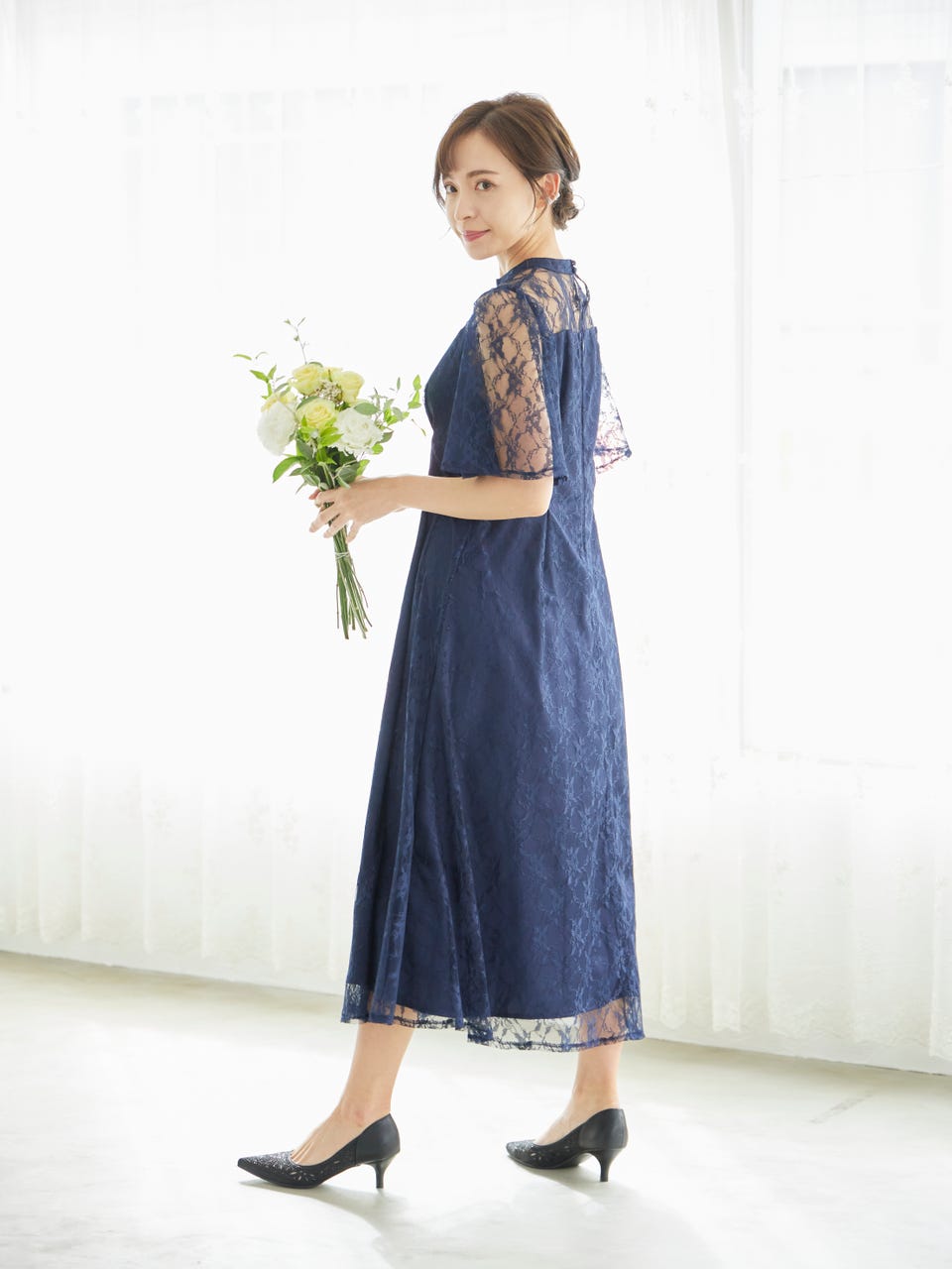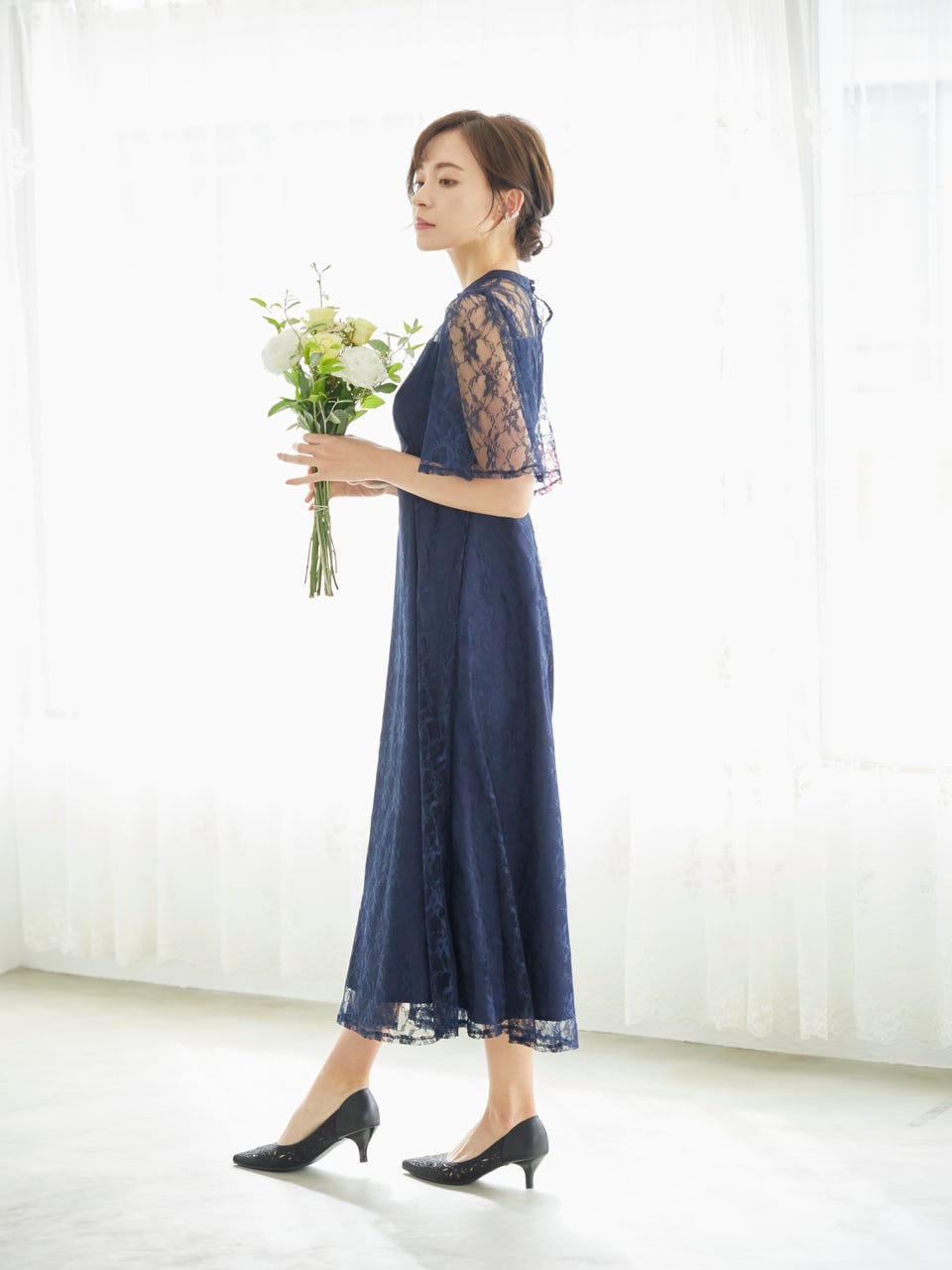 BELINDA DE CAPRIS 総レースフレア袖 ハイネック ワンピースドレス ネイビー Lサイズ
