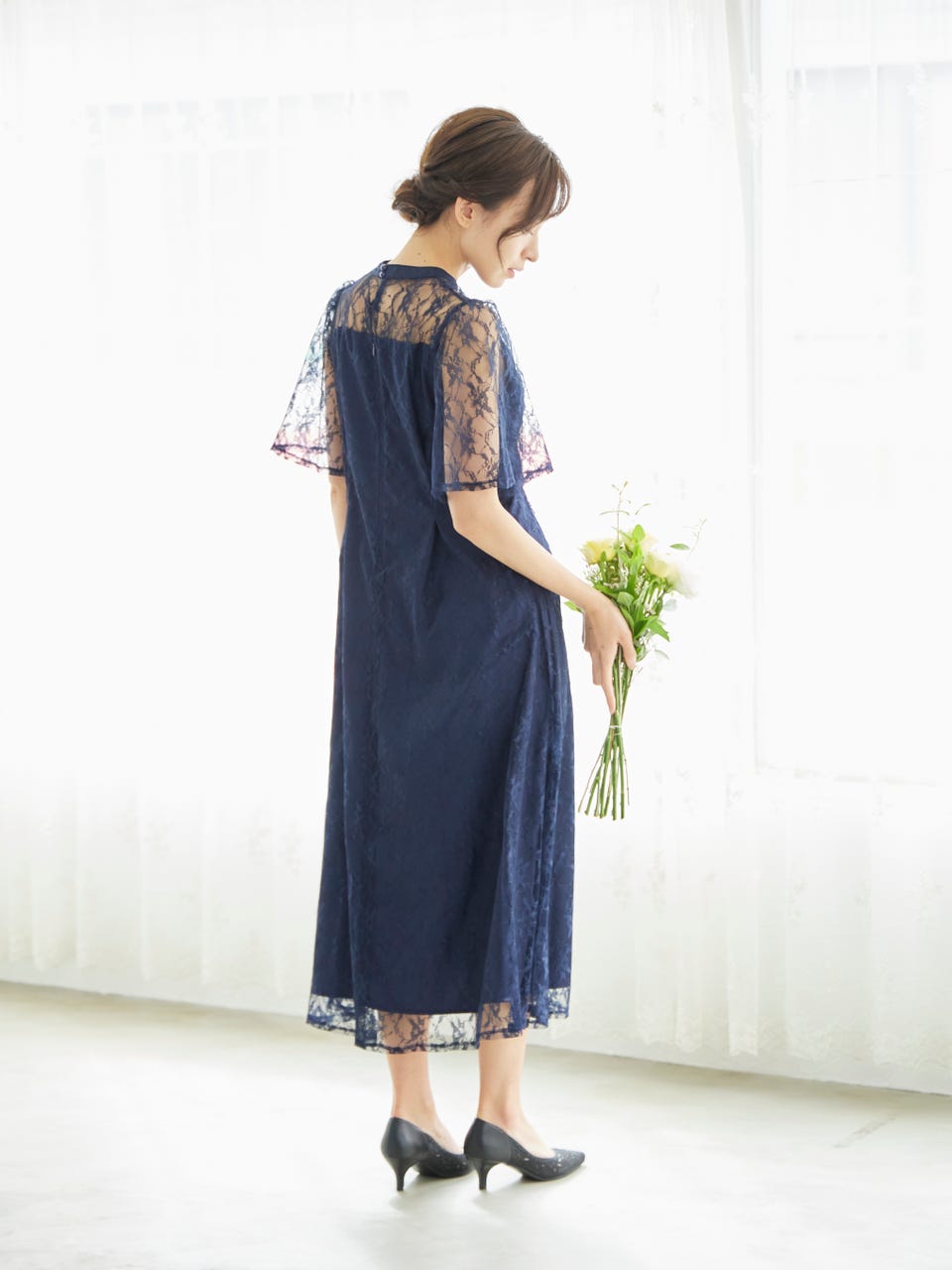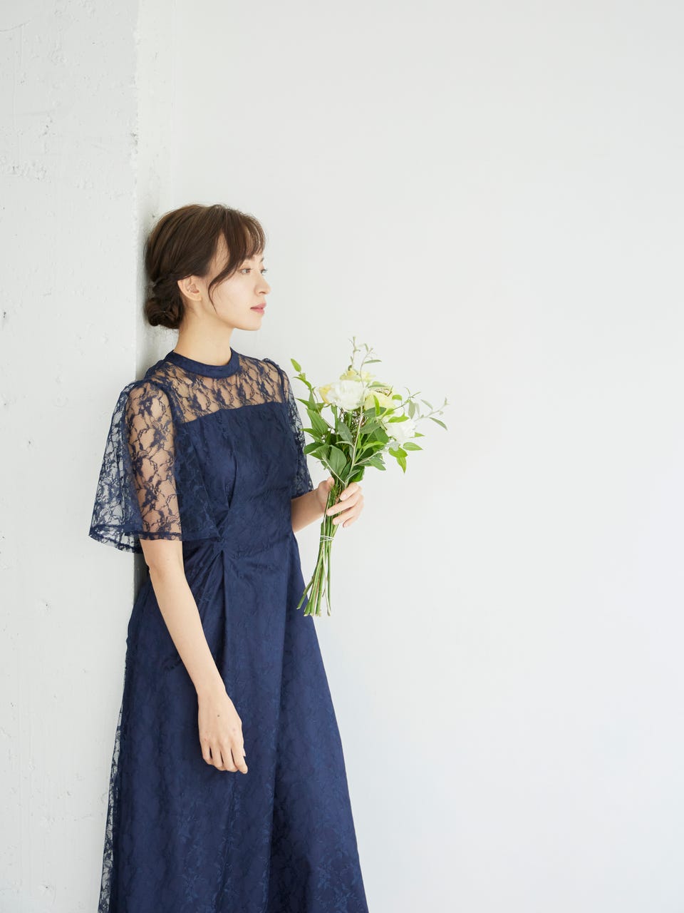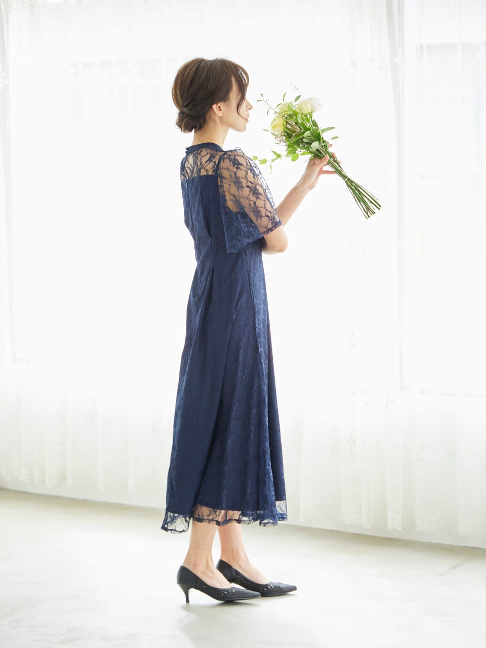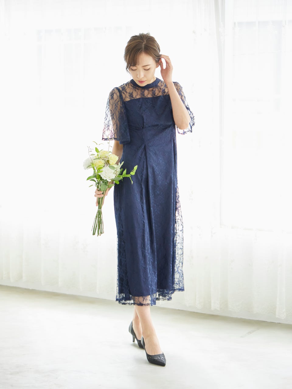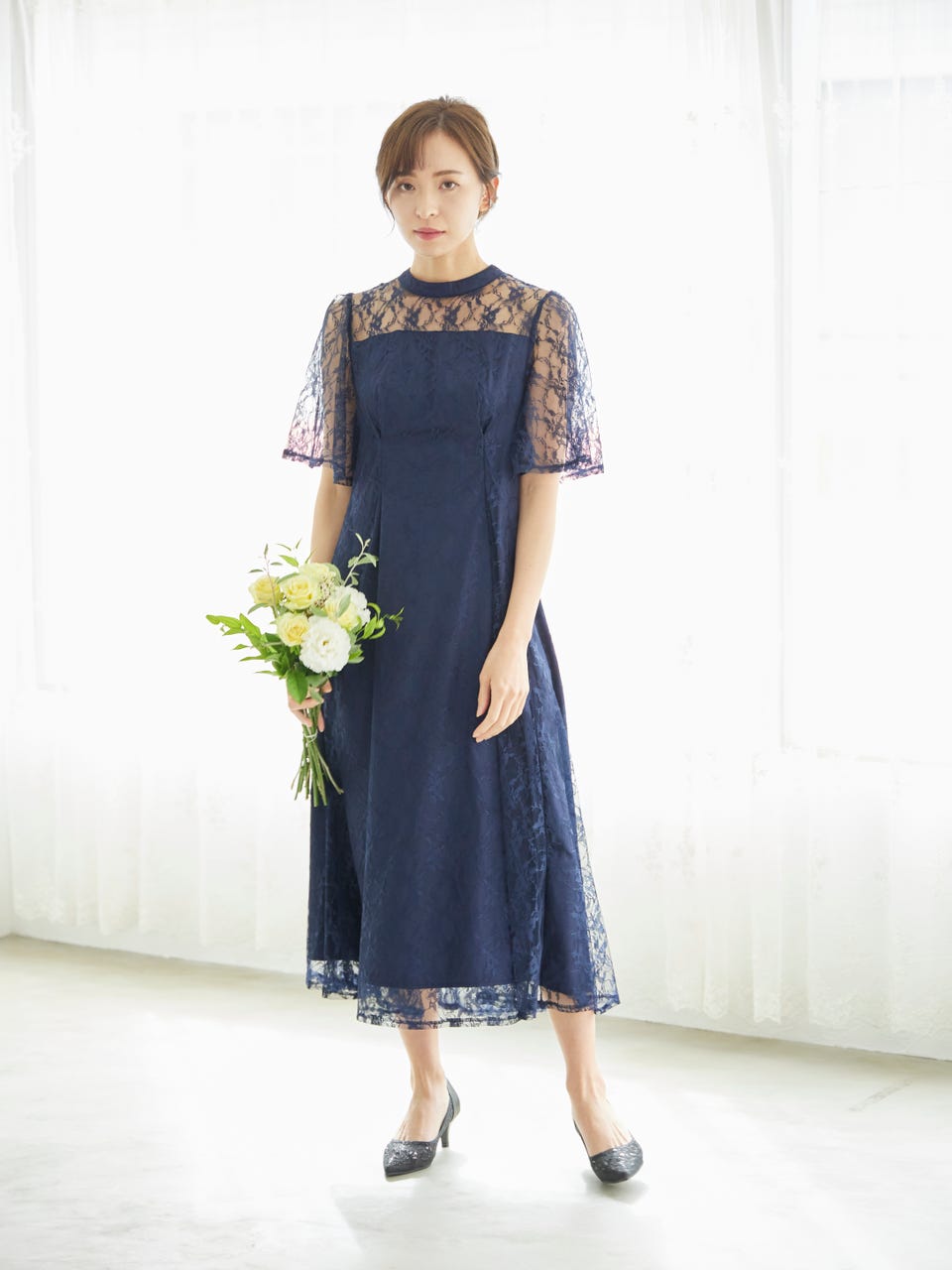 BELINDA DE CAPRIS 総レースフレア袖 ハイネック ワンピースドレス ネイビー Lサイズ