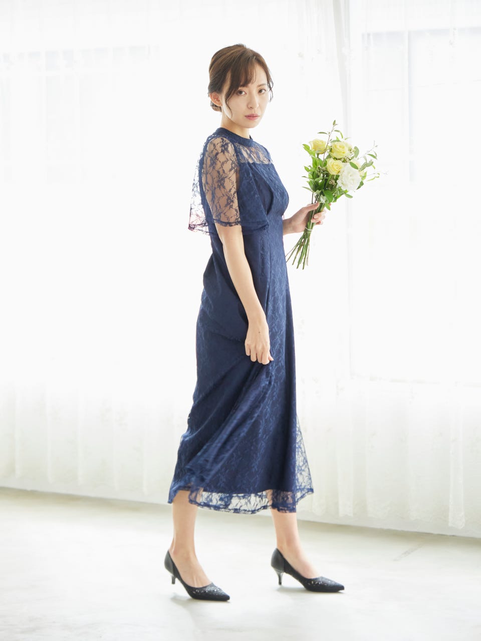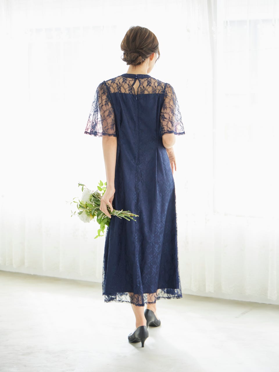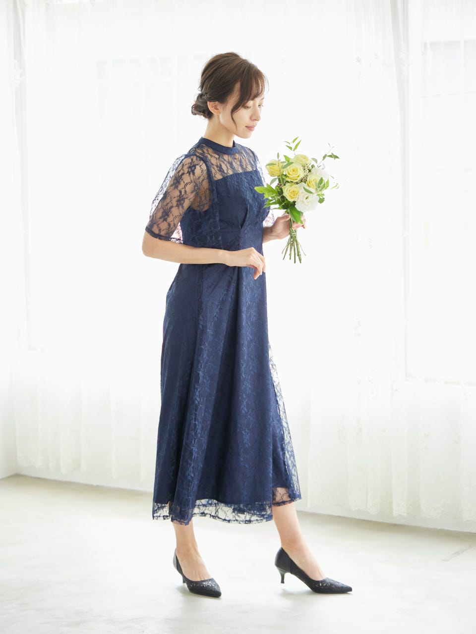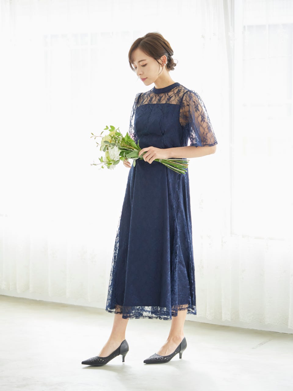 BELINDA DE CAPRIS 総レースフレア袖 ハイネック ワンピースドレス ネイビー Lサイズ