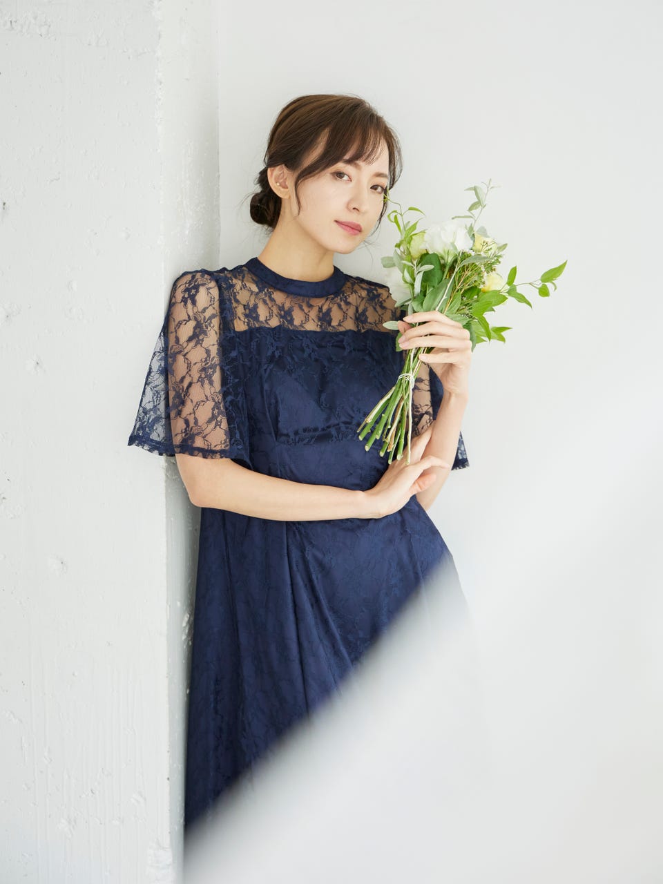 程よい透け感のレースとフレアスリーブの袖で二の腕が隠れ、