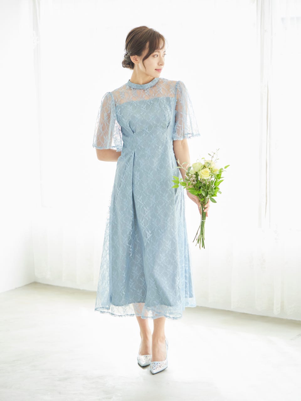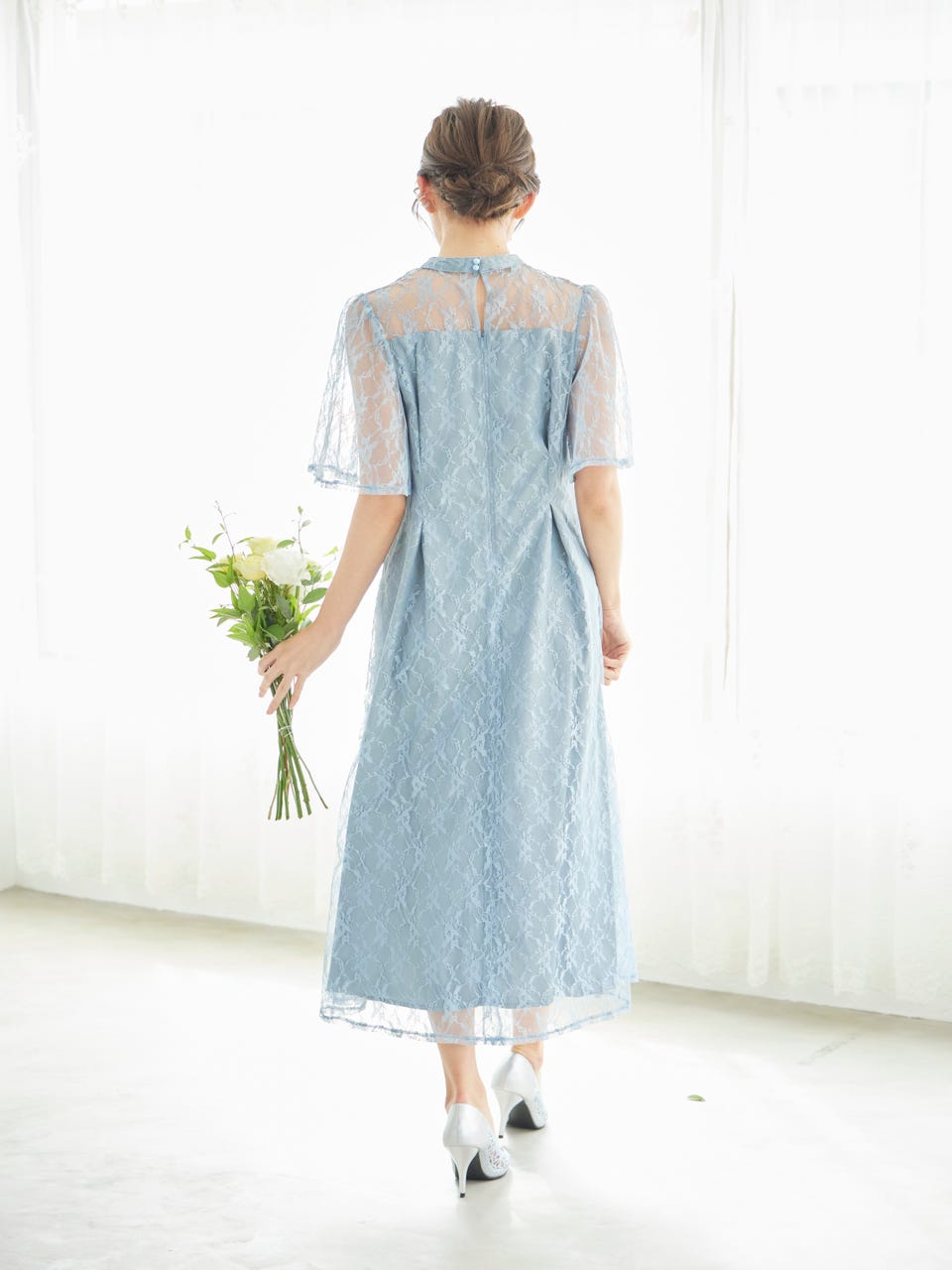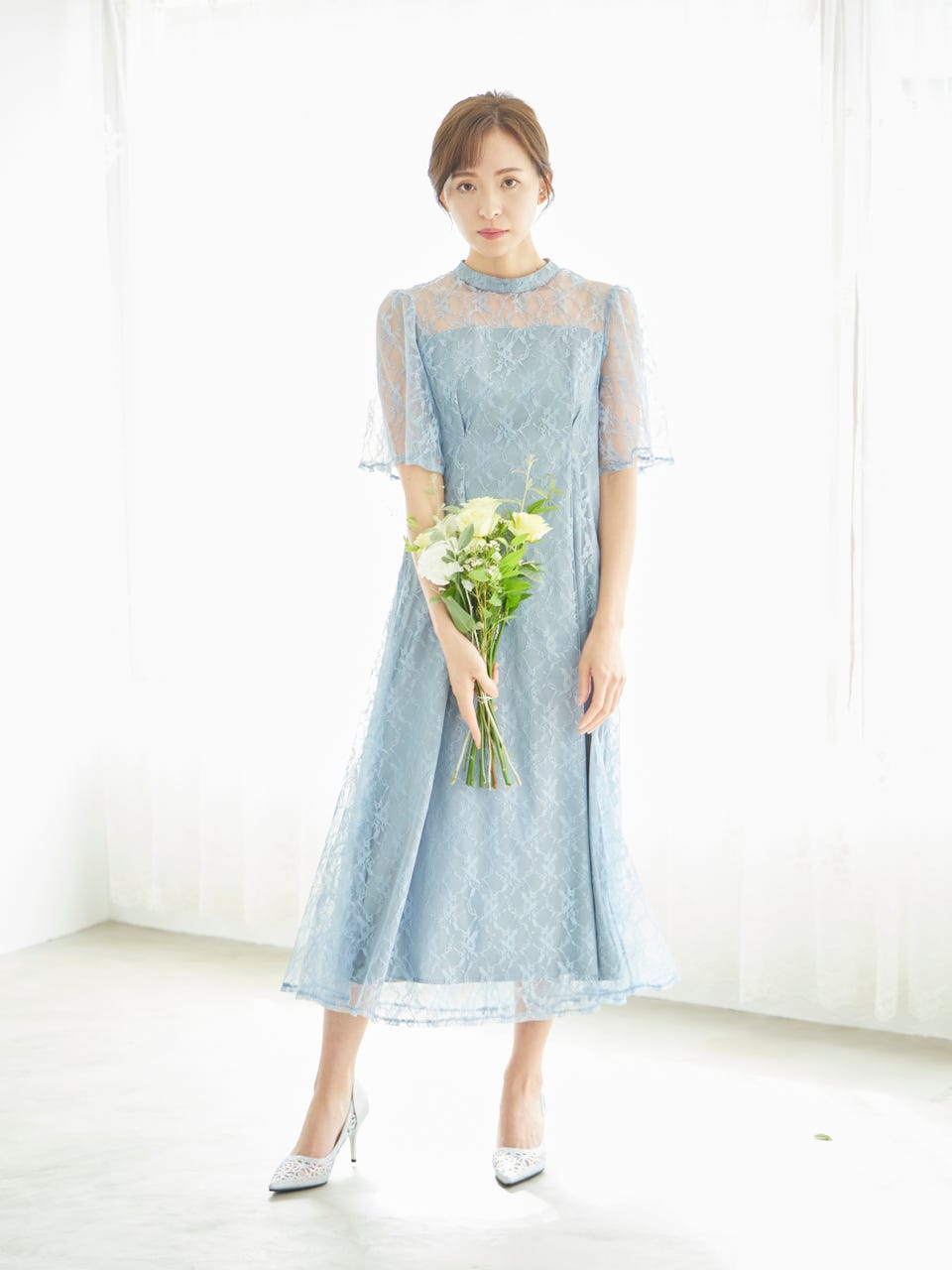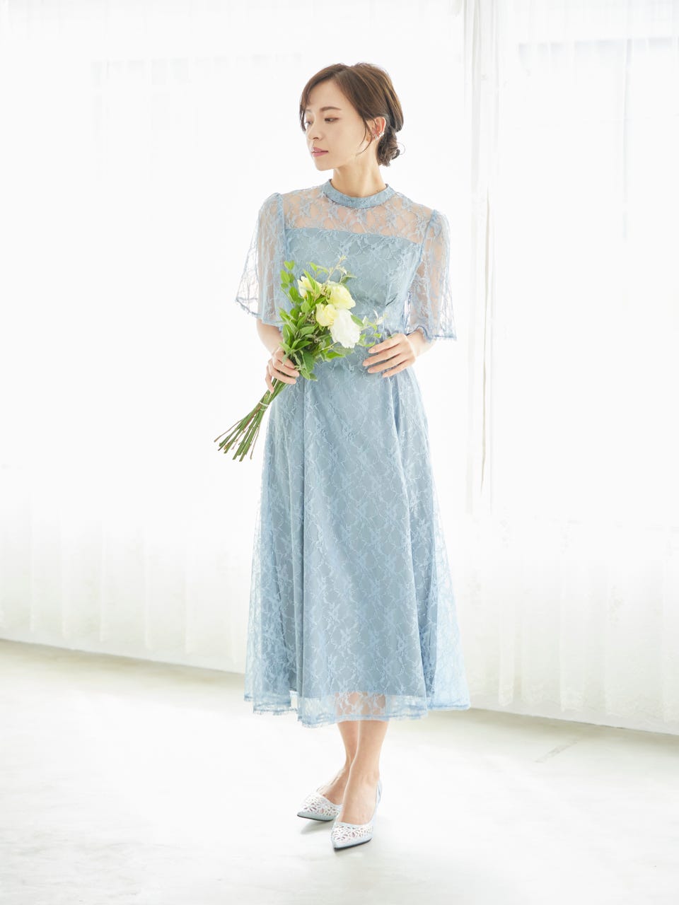 BELINDA DE CAPRIS 総レースフレア袖 ハイネック ワンピースドレス サックスブルー Sサイズ