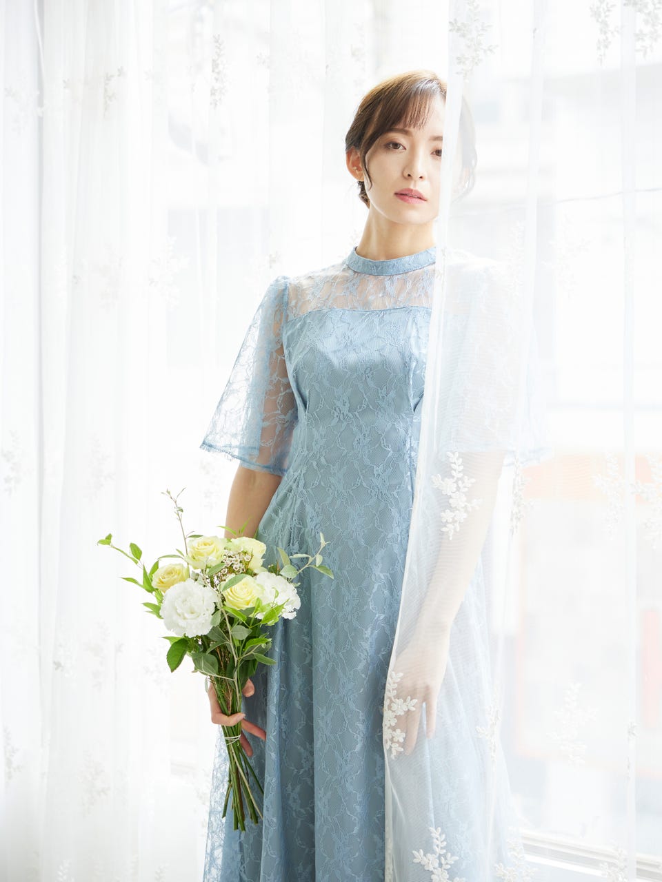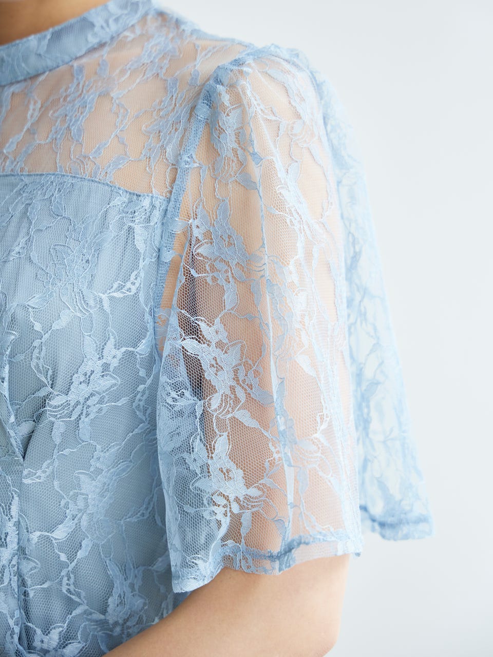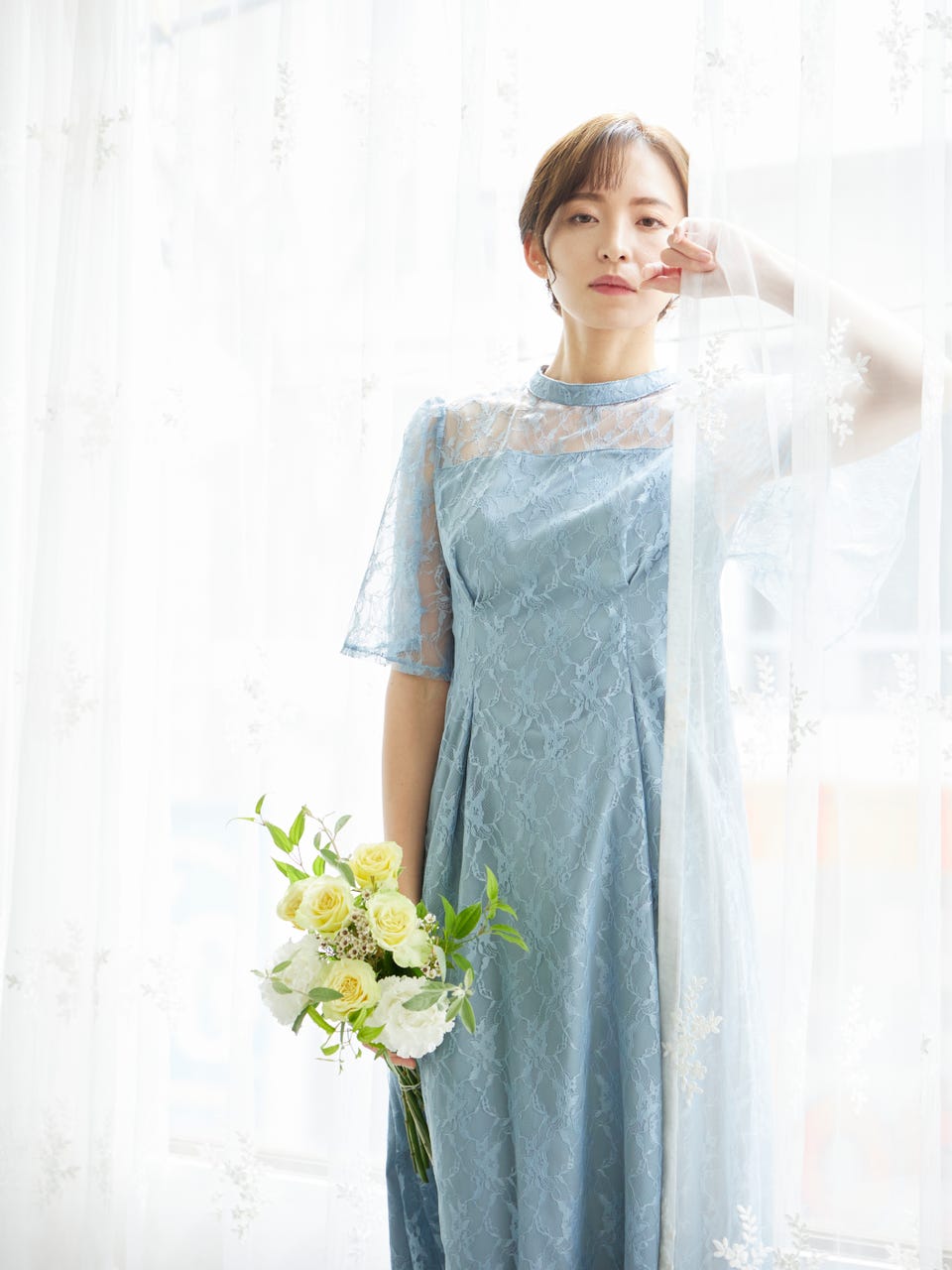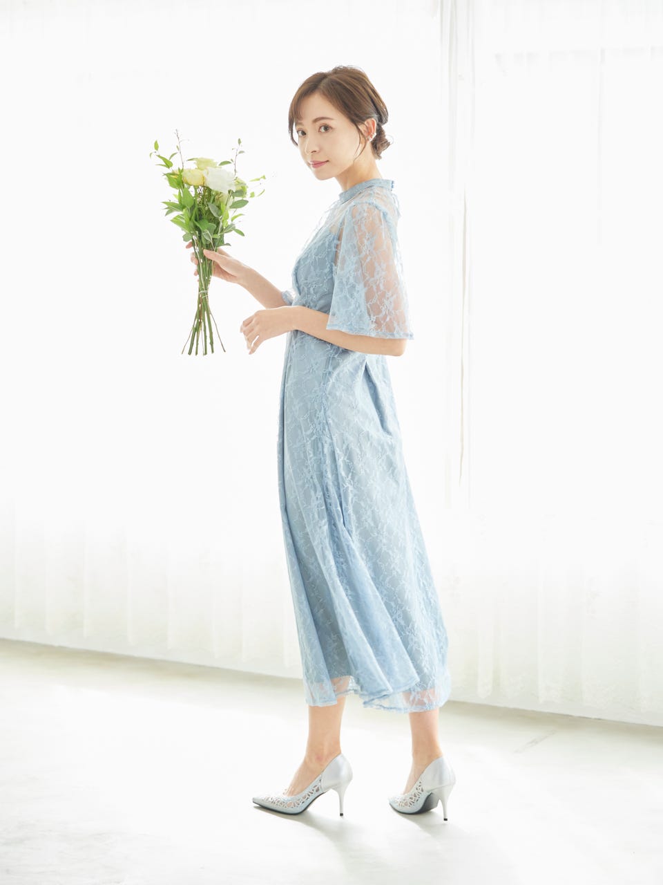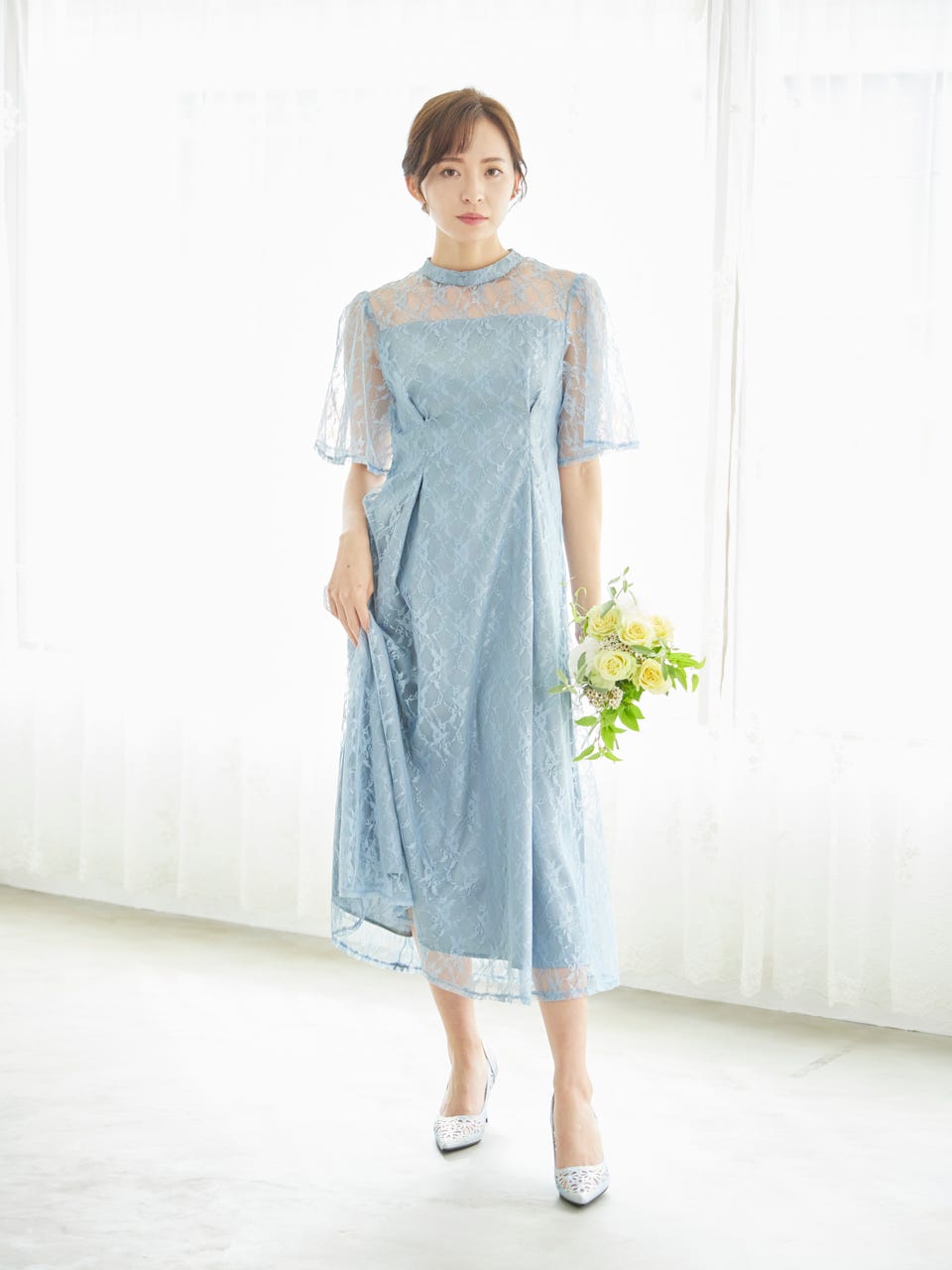 BELINDA DE CAPRIS 総レースフレア袖 ハイネック ワンピースドレス サックスブルー Sサイズ