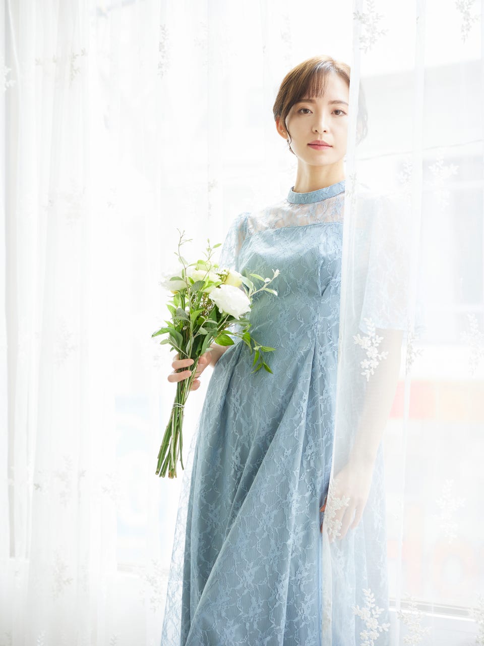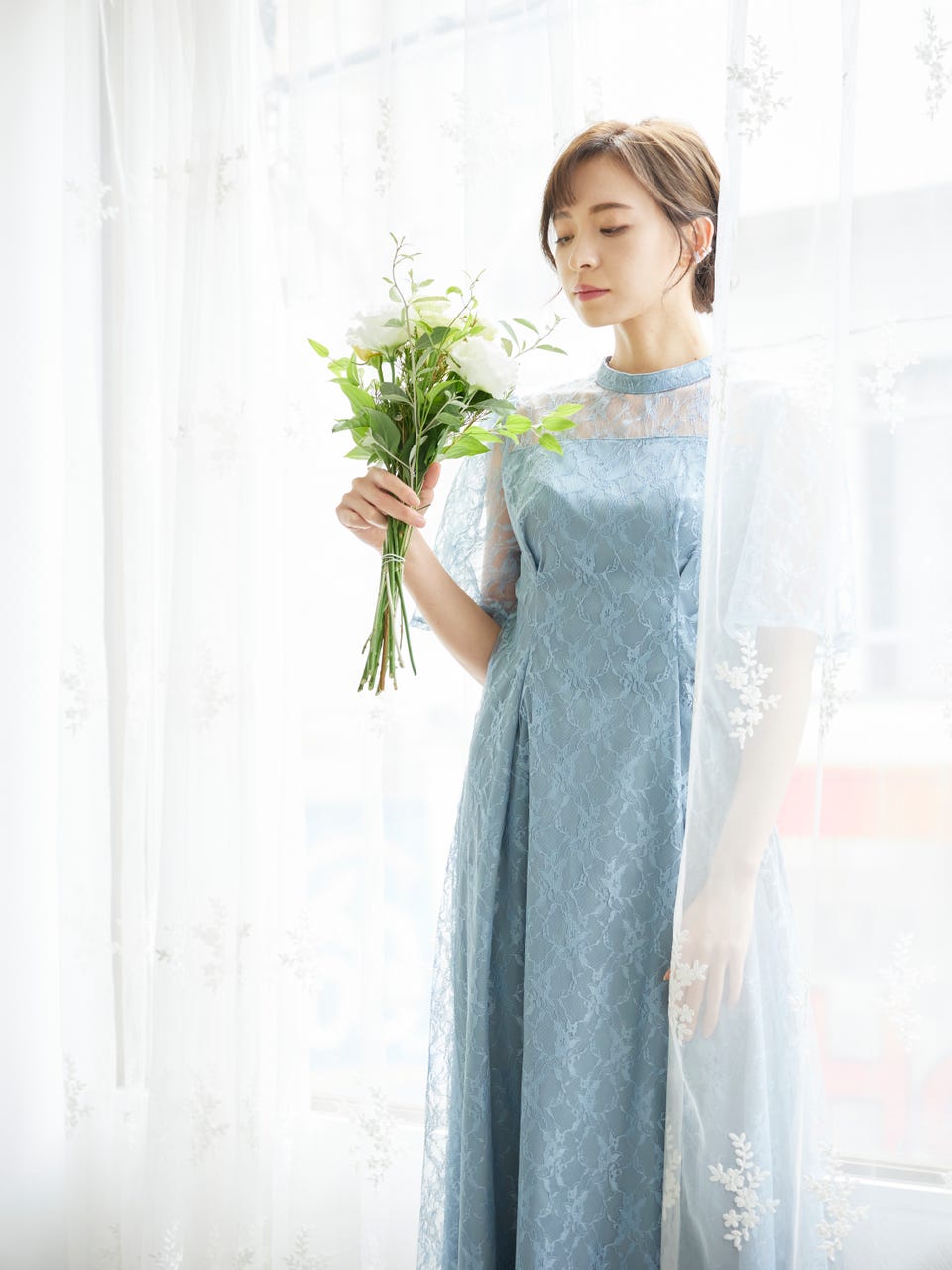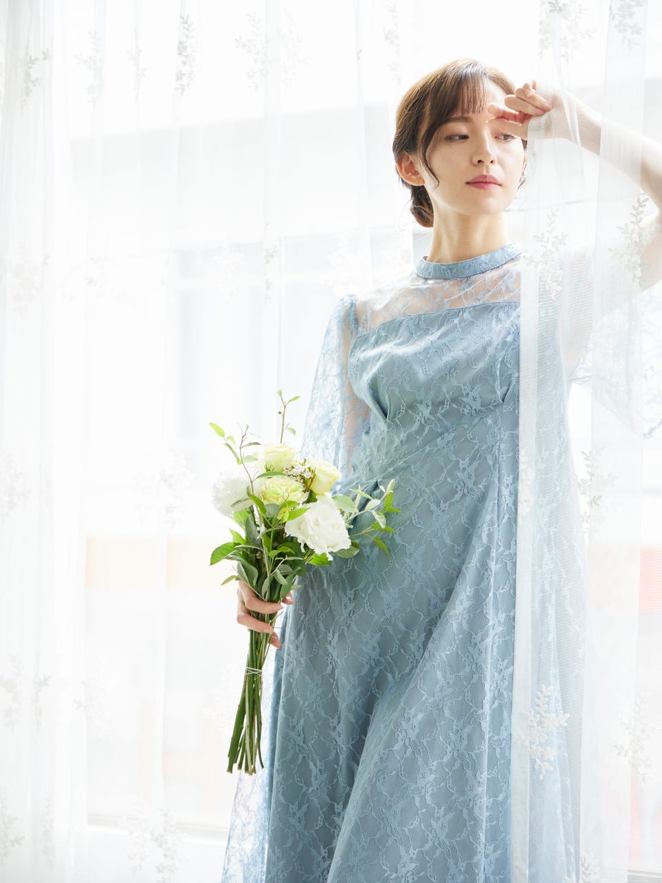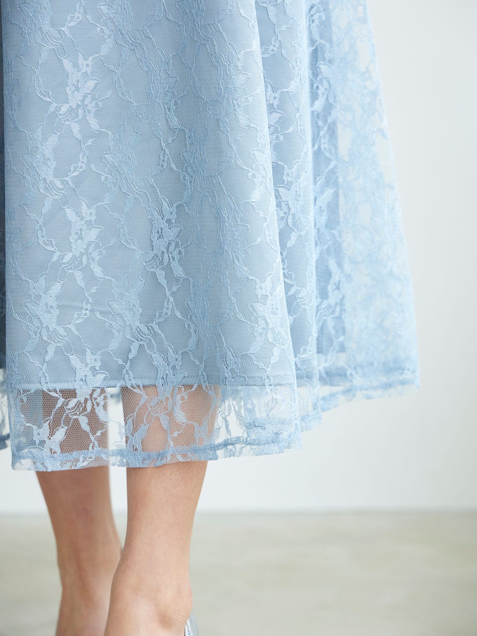 BELINDA DE CAPRIS 総レースフレア袖 ハイネック ワンピースドレス サックスブルー Sサイズ