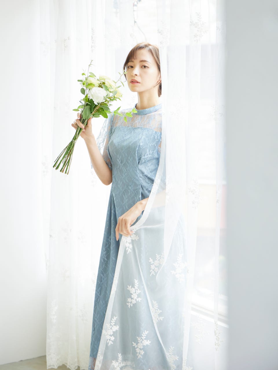 程よい透け感のレースとフレアスリーブの袖で二の腕が隠れ、