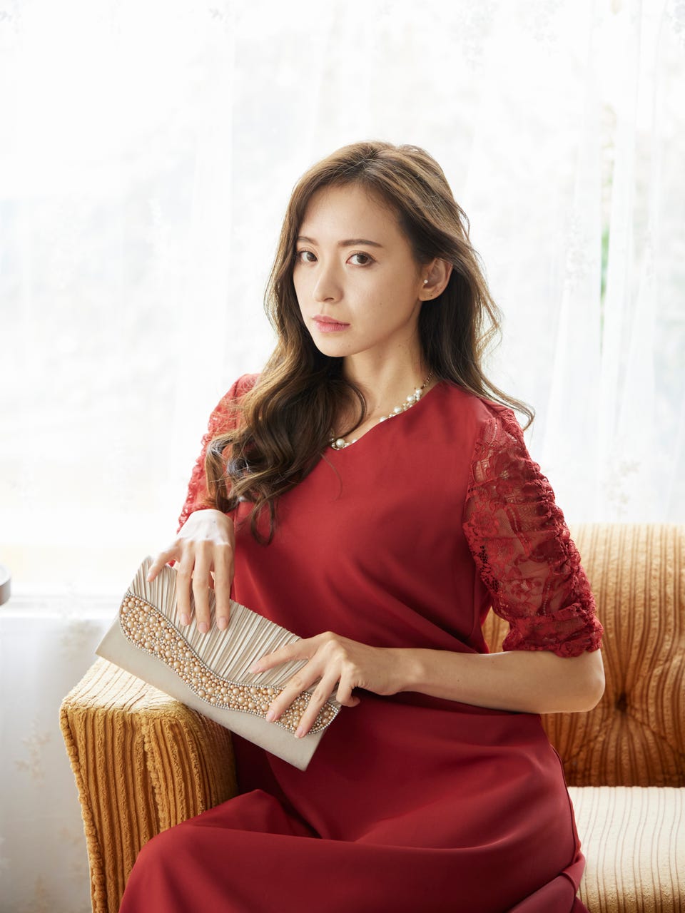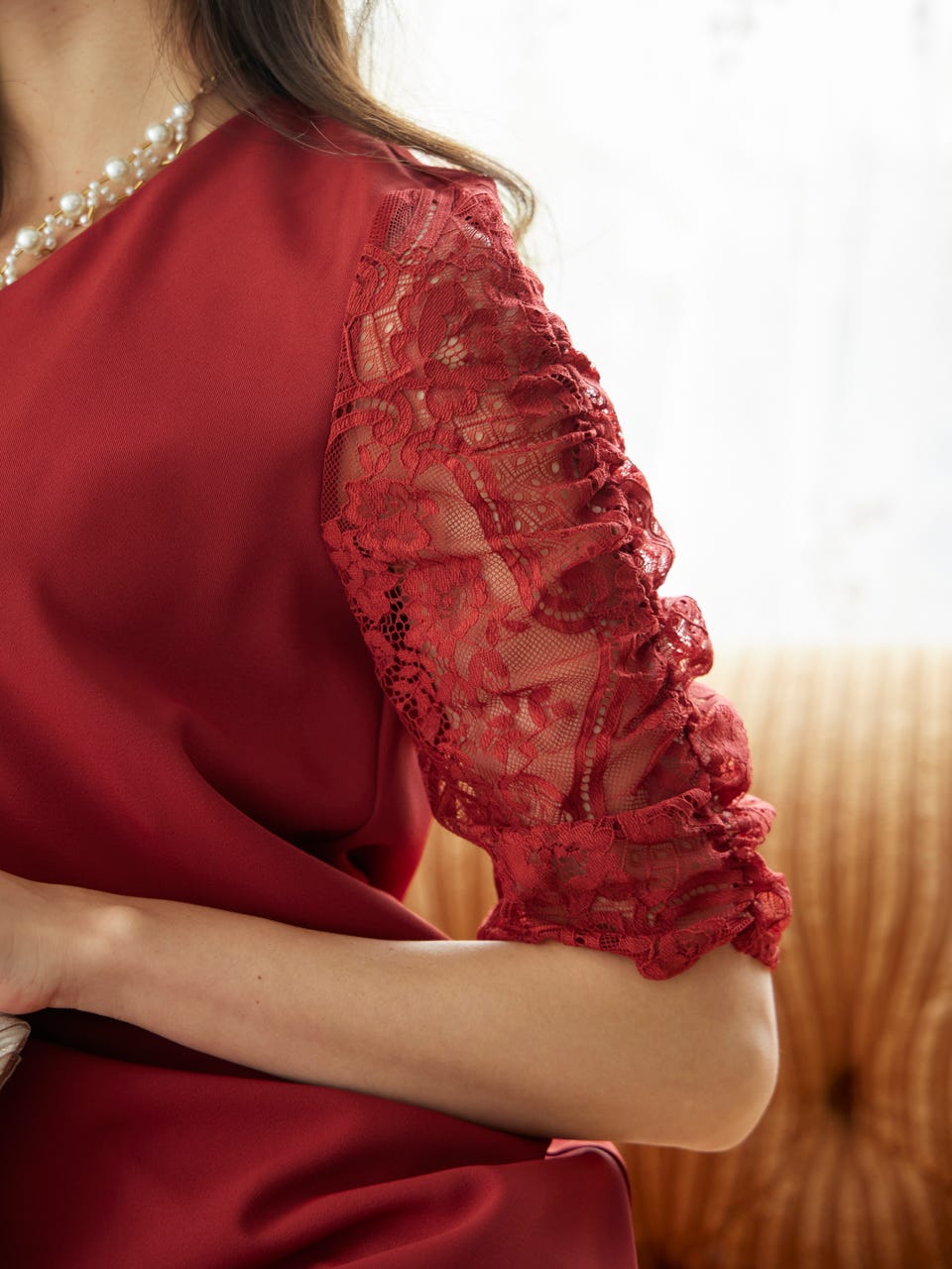 ボリューム感のあるレース袖とボディラインを拾わないシンプルなシルエットで、