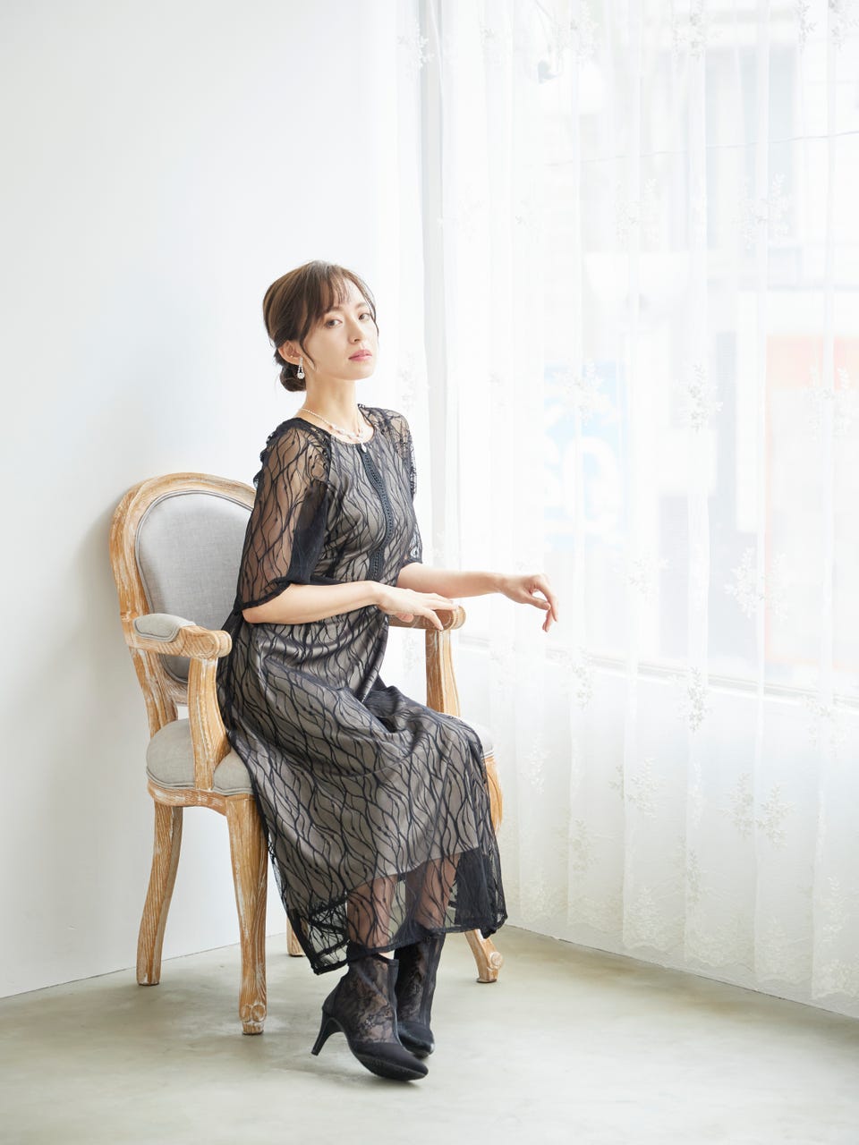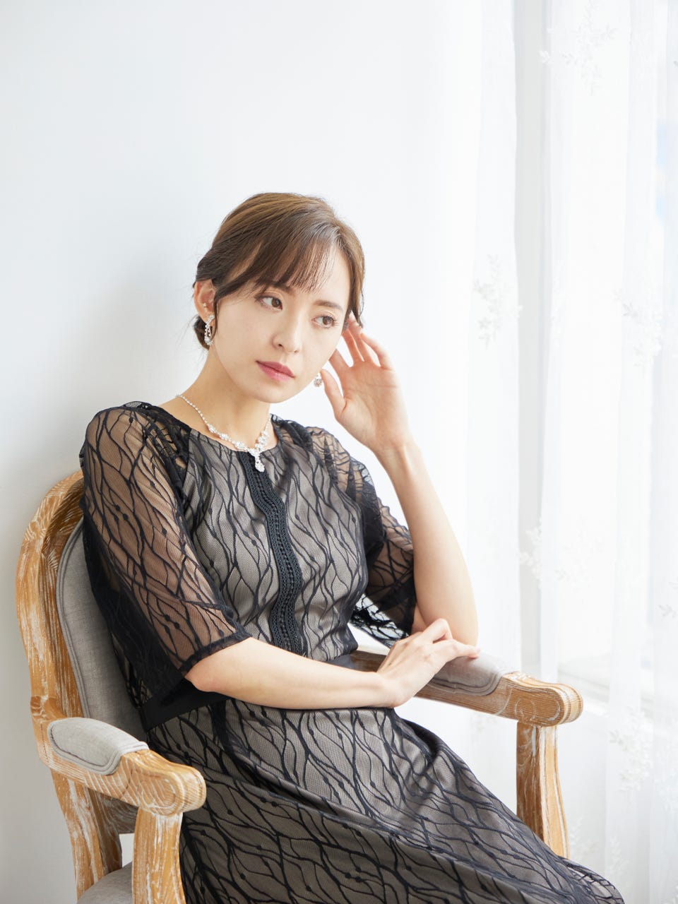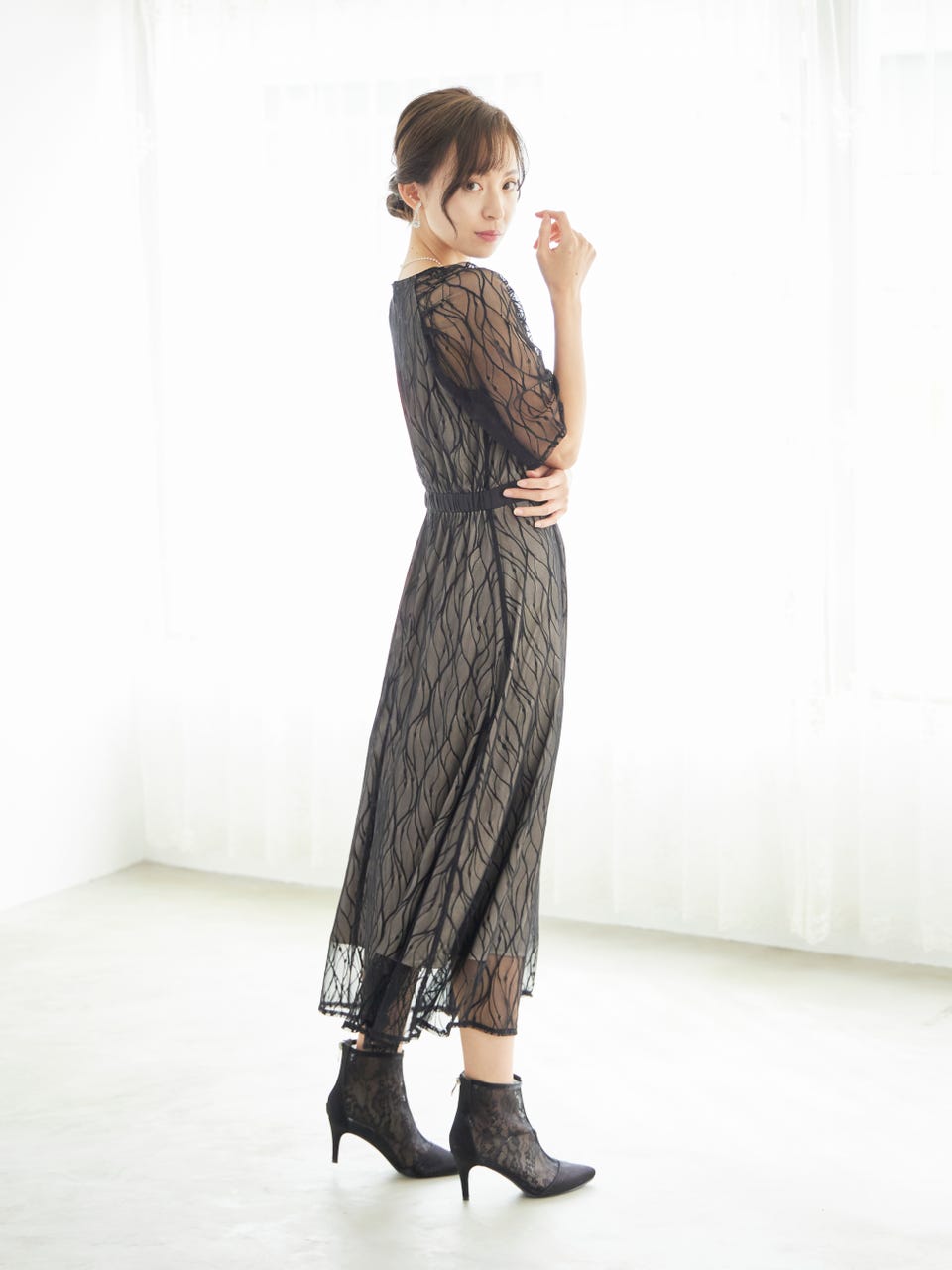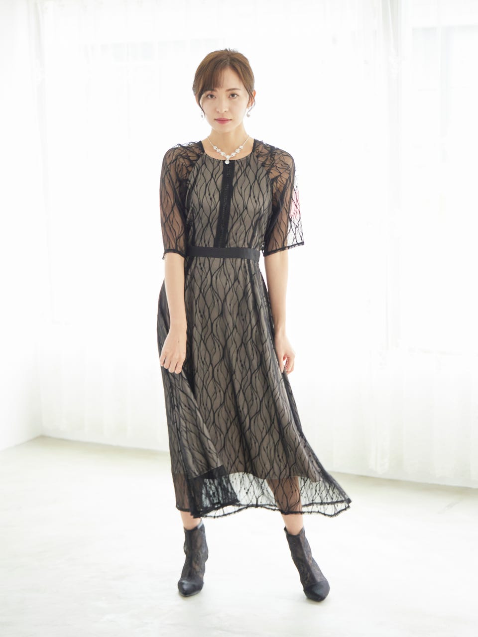 肩から袖にかけて透け感ののあるレースが大人っぽさの中にかわいらしさも演出。