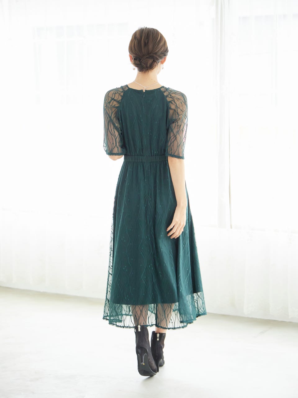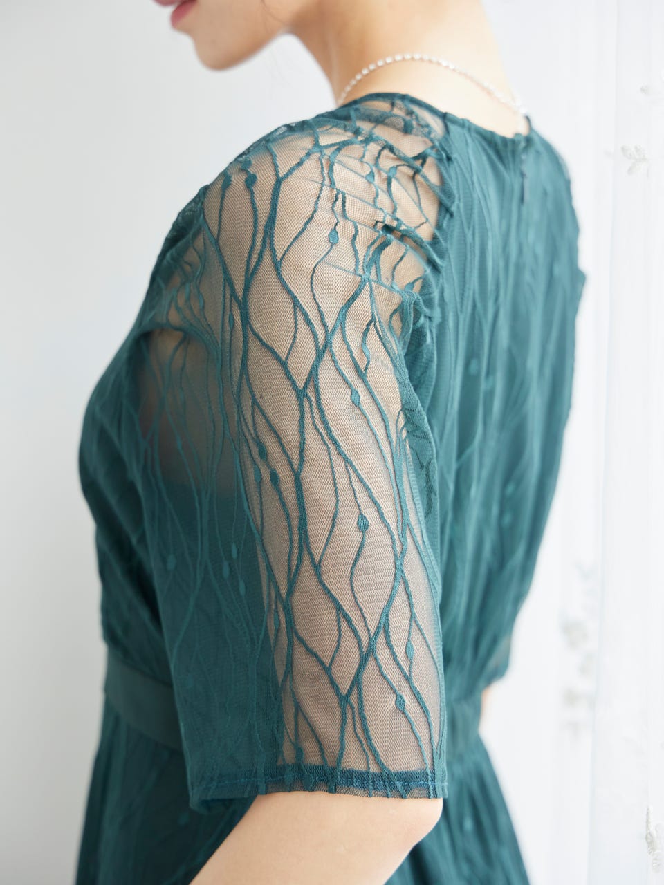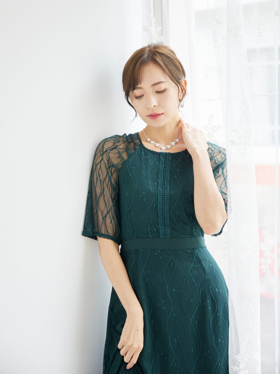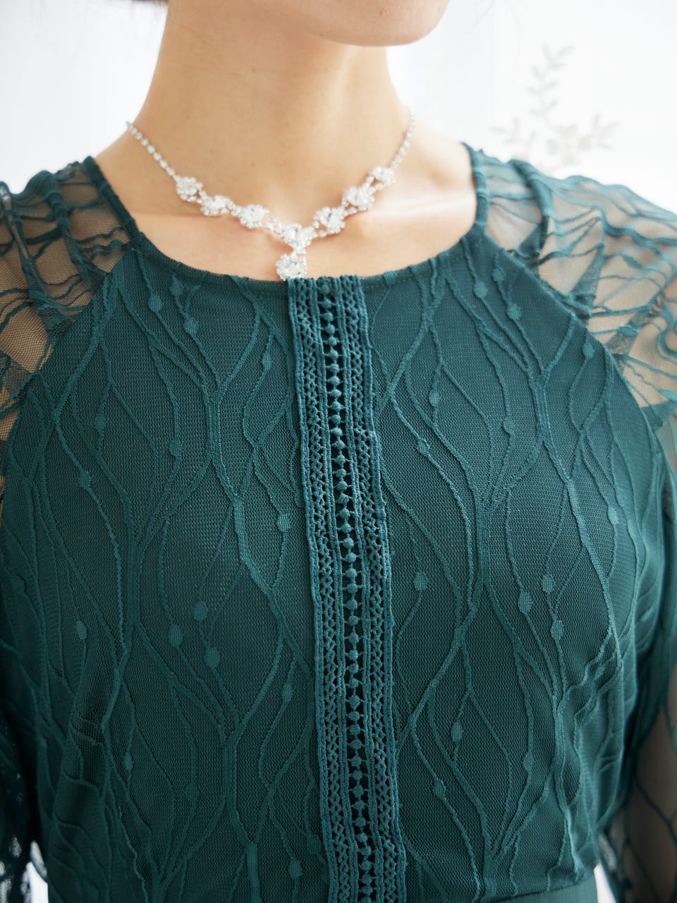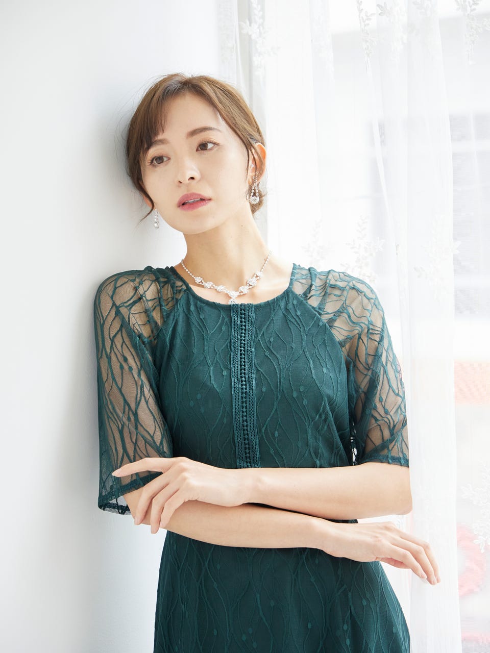 肩から袖にかけて透け感ののあるレースが大人っぽさの中にかわいらしさも演出。