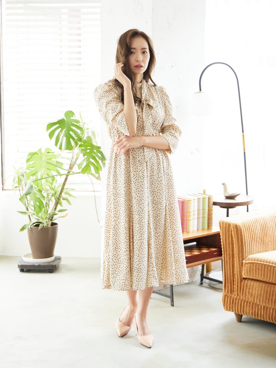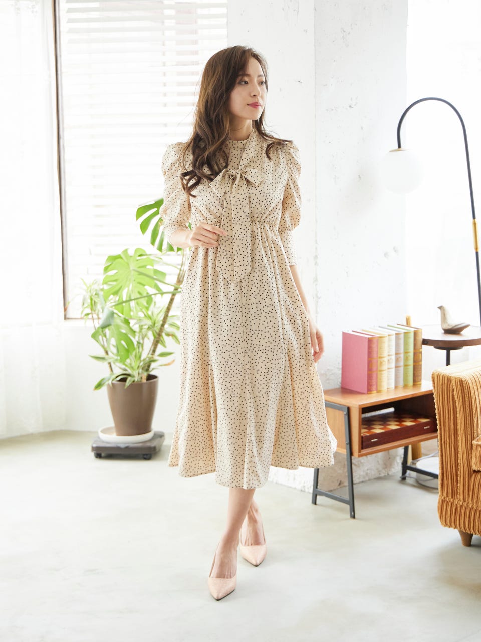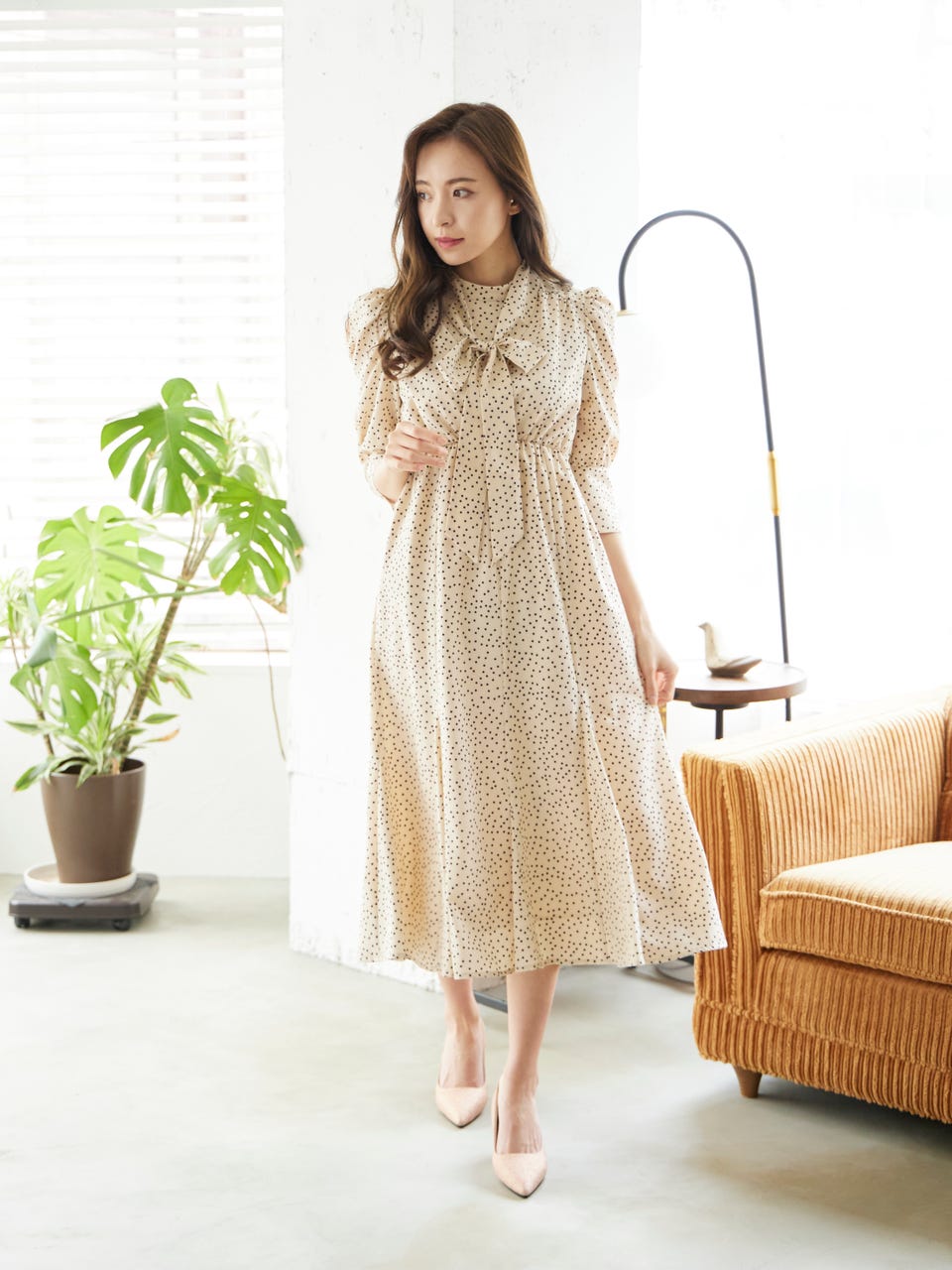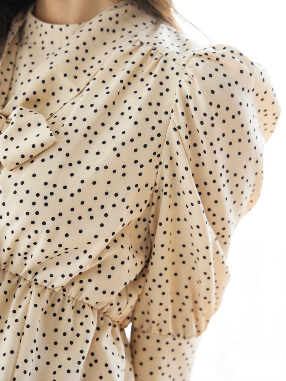 クラシカルなドットデザインと首元にあしらった取り外し可能なボウタイで華やかな印象を演出。