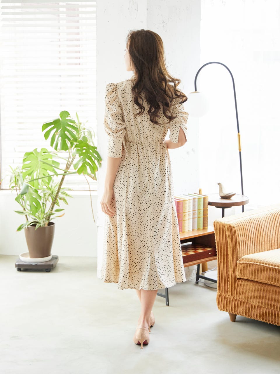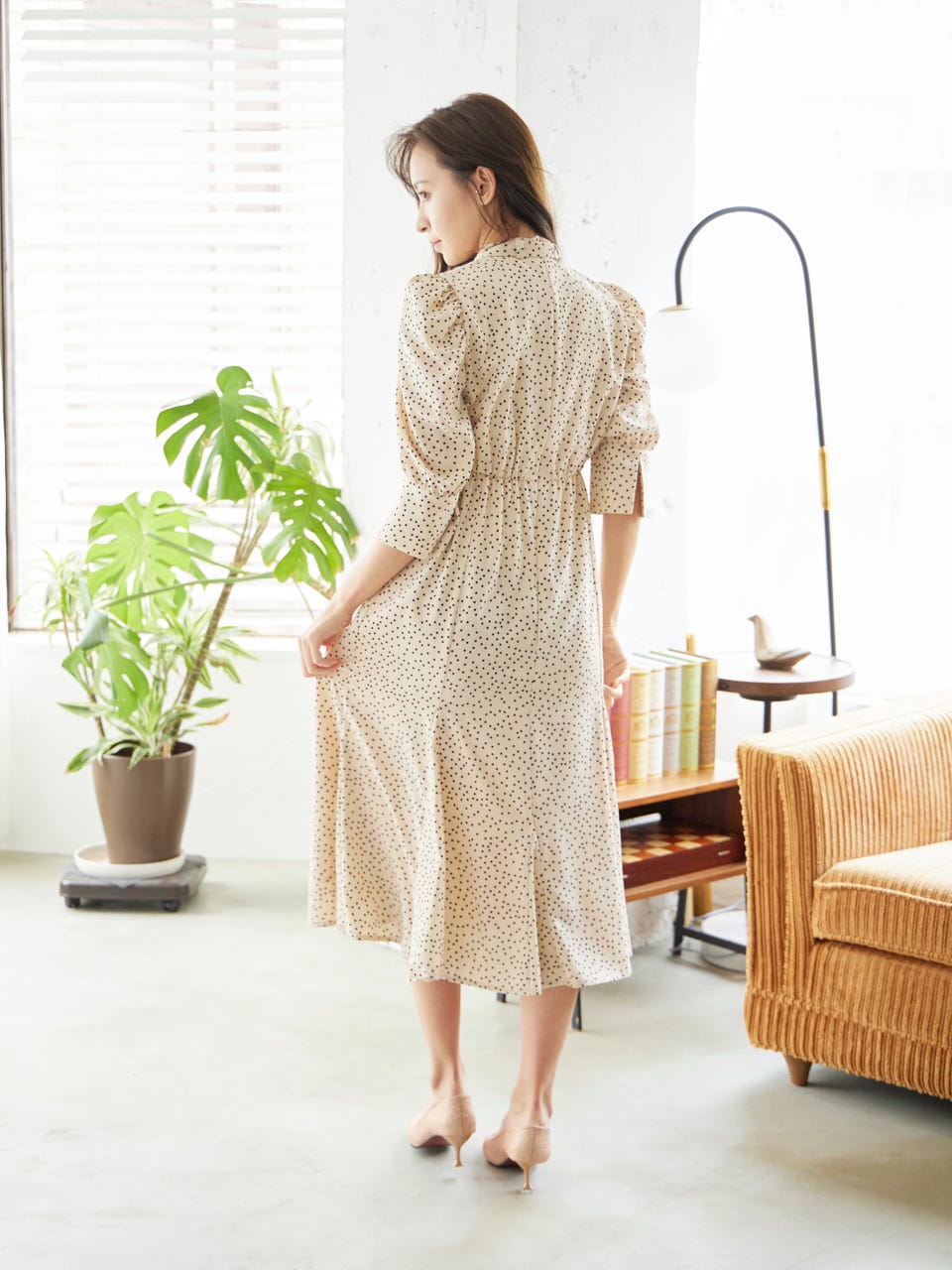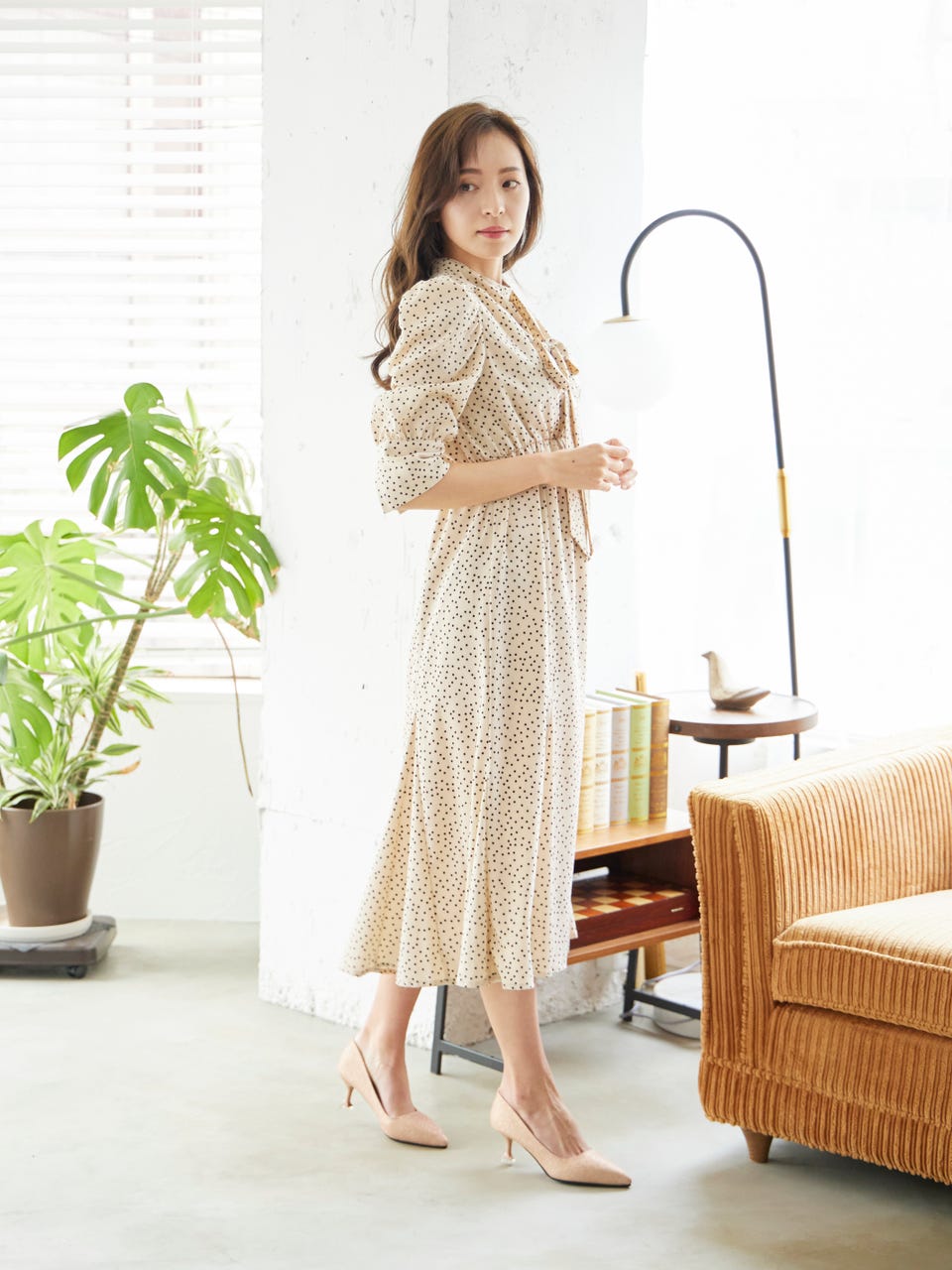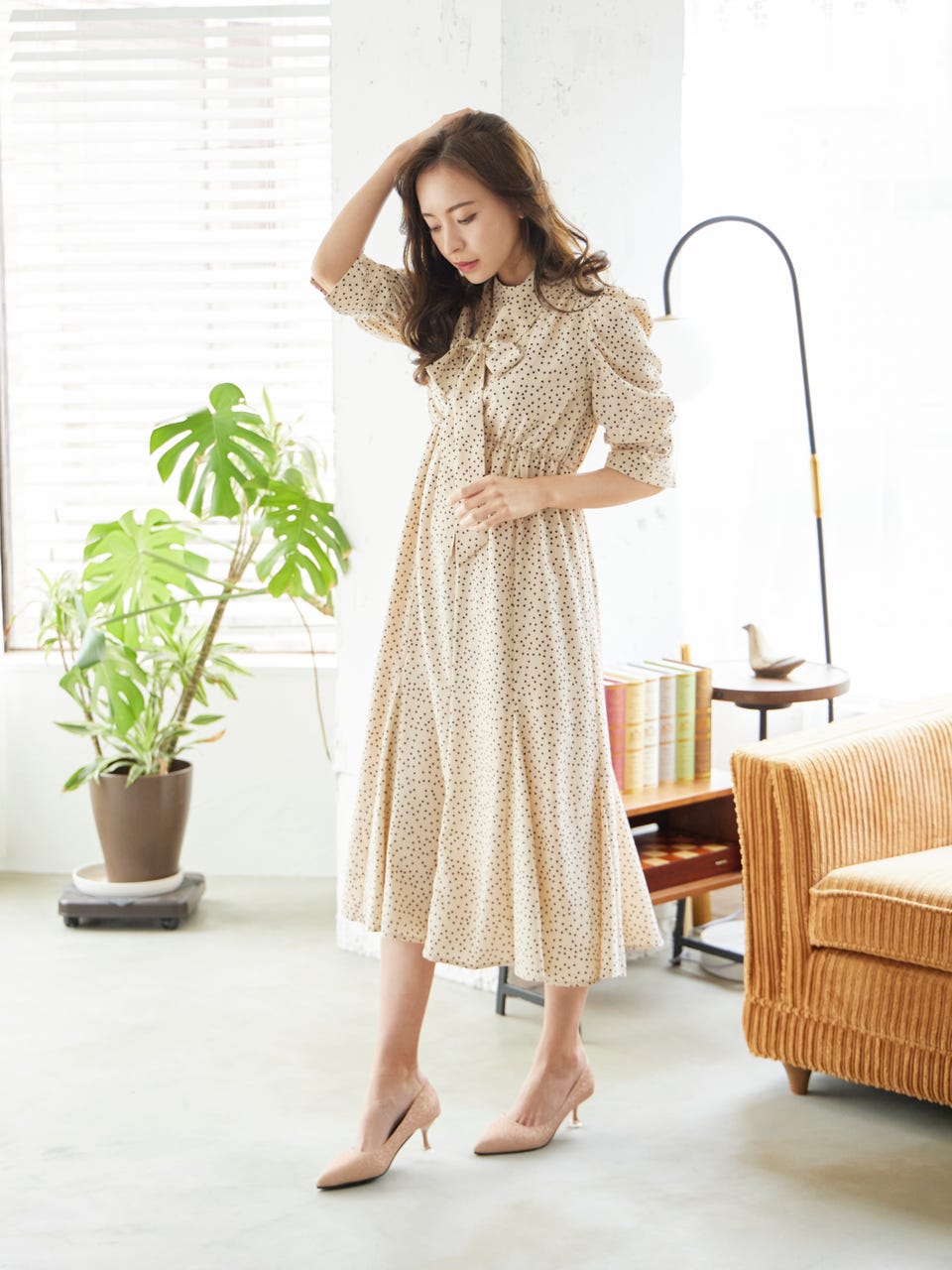 クラシカルなドットデザインと首元にあしらった取り外し可能なボウタイで華やかな印象を演出。
