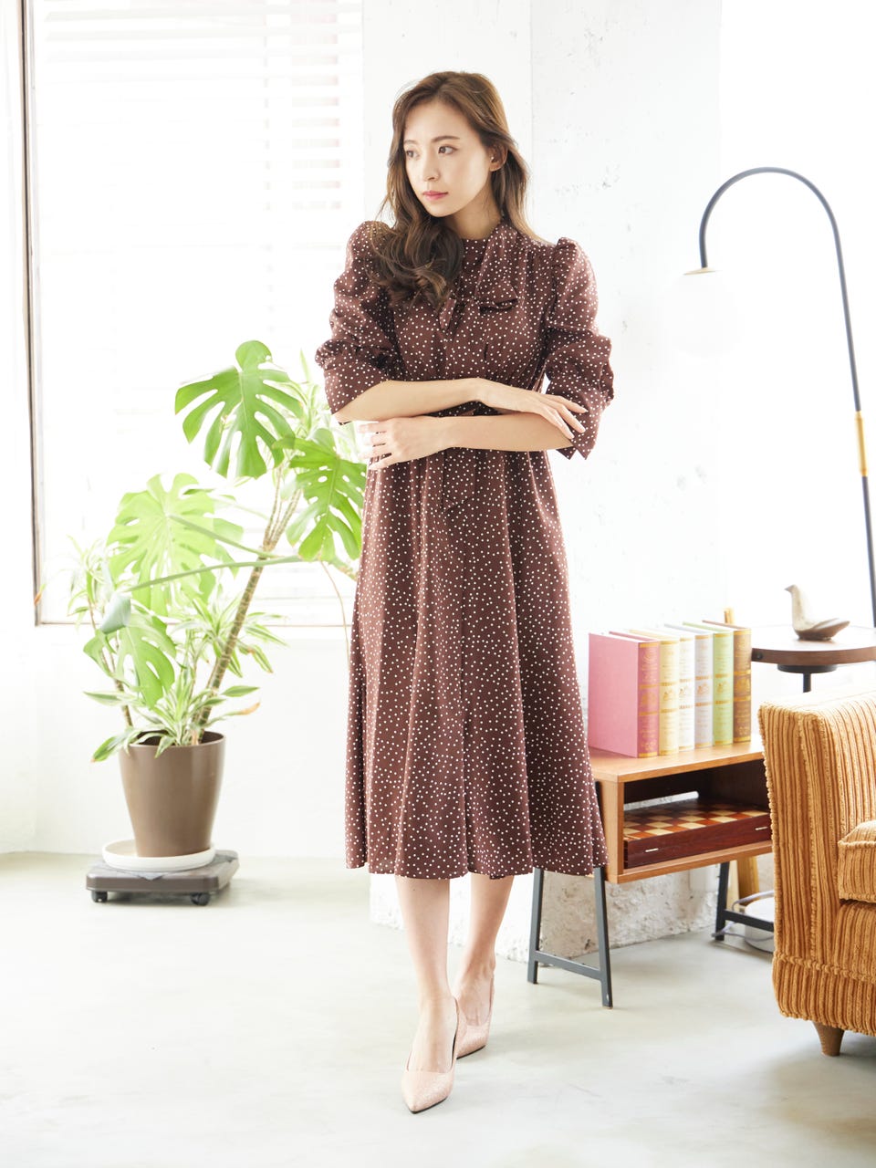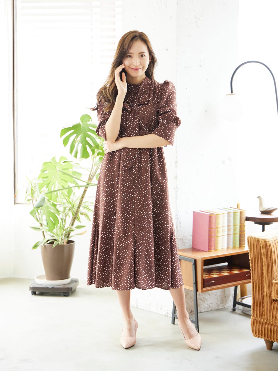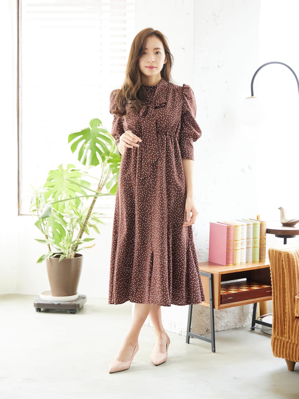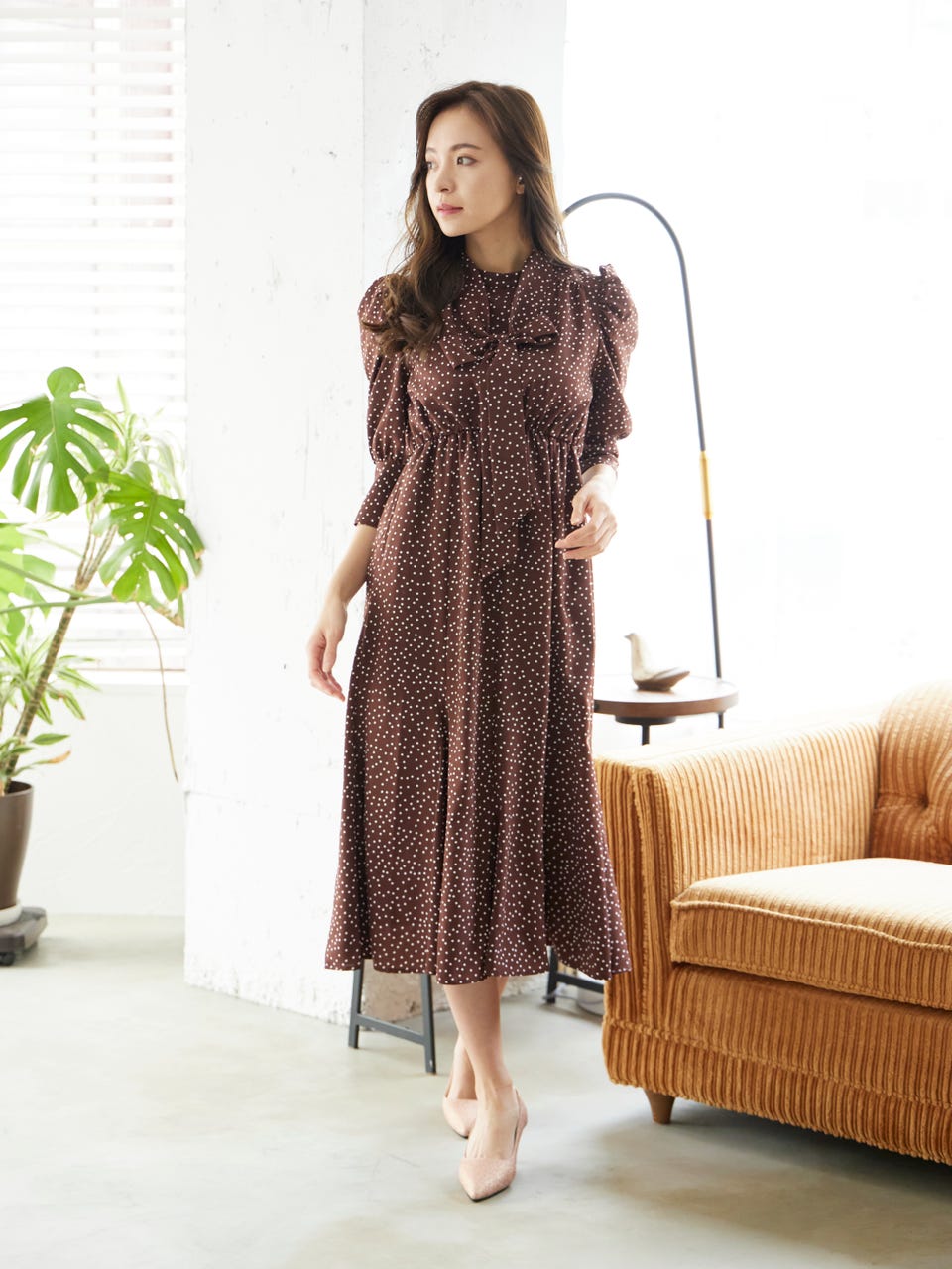 クラシカルなドットデザインと首元にあしらった取り外し可能なボウタイで華やかな印象を演出。