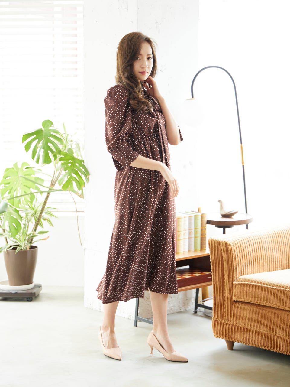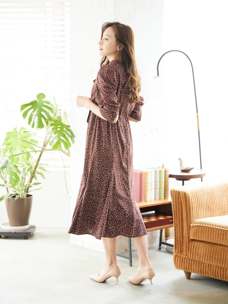 BELINDA DE CAPRIS ギャザースリーブ ドットワンピースドレス ブラウン Mサイズ