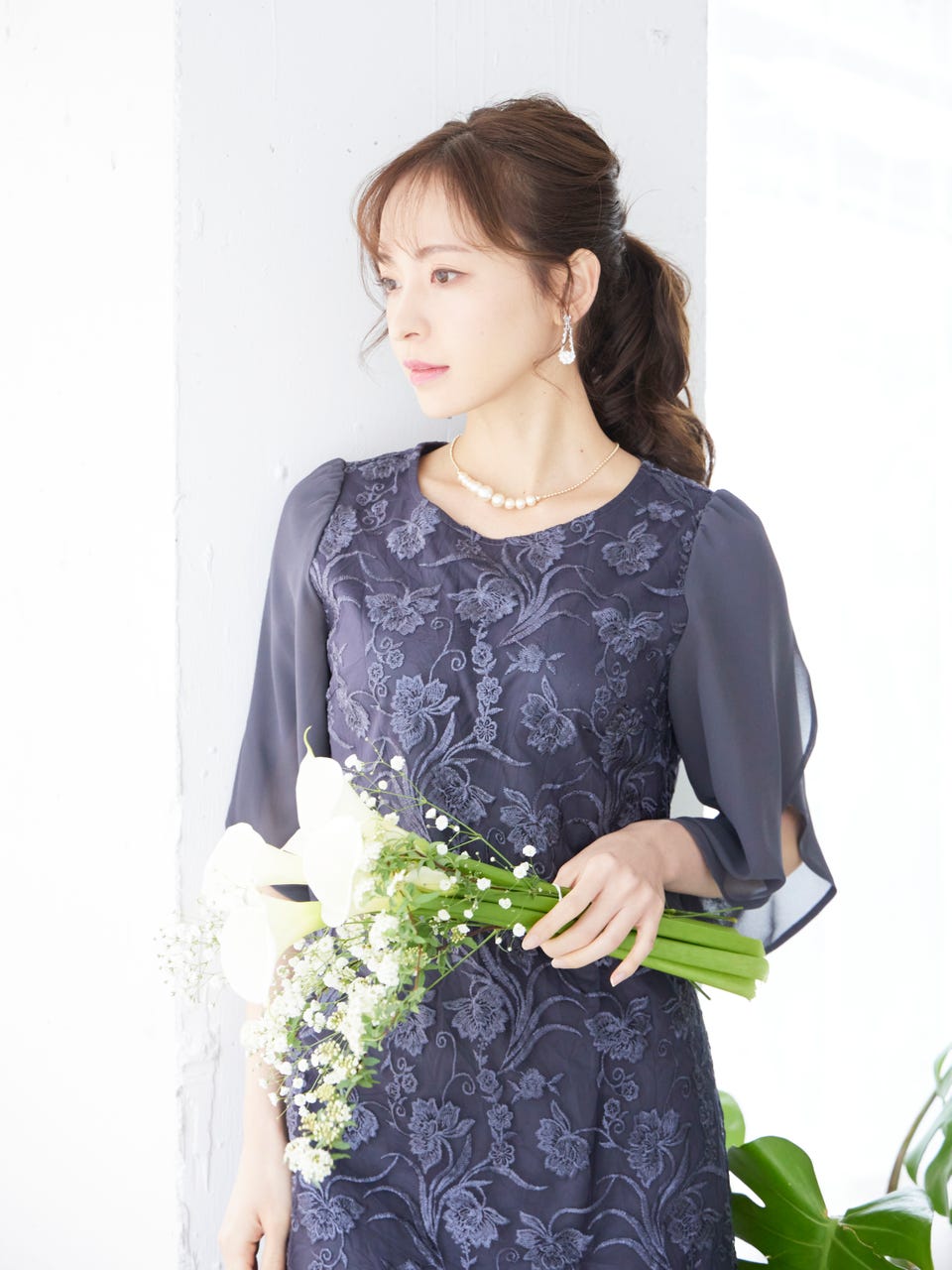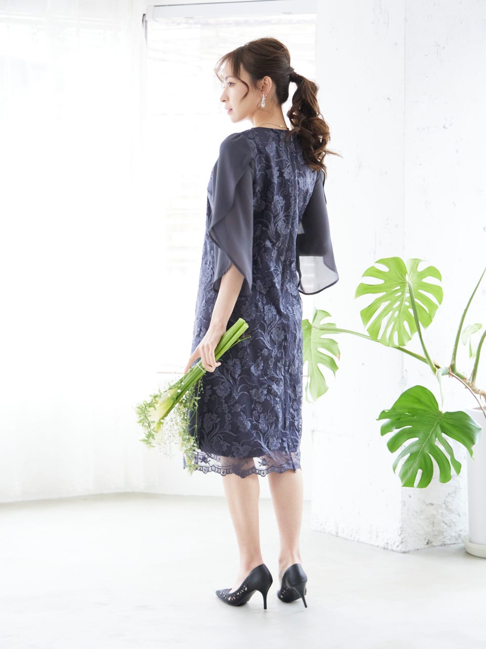 身頃部分に刺繍が施された華やかなレースが使用されており、