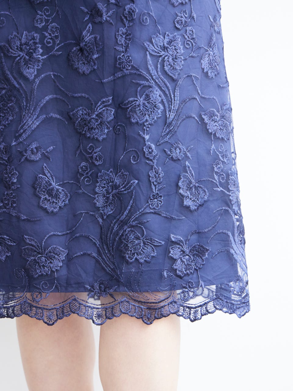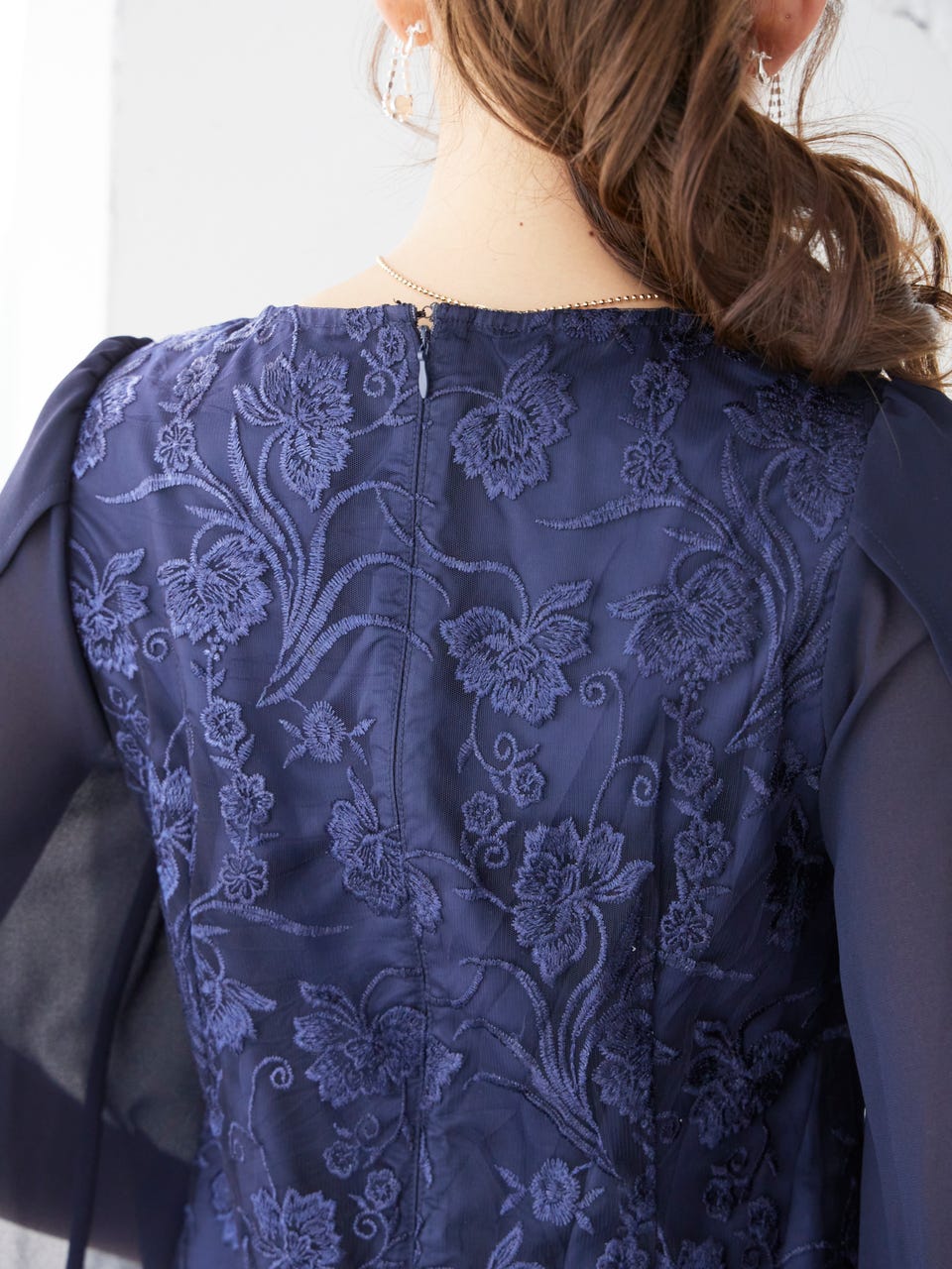 身頃部分に刺繍が施された華やかなレースが使用されており、