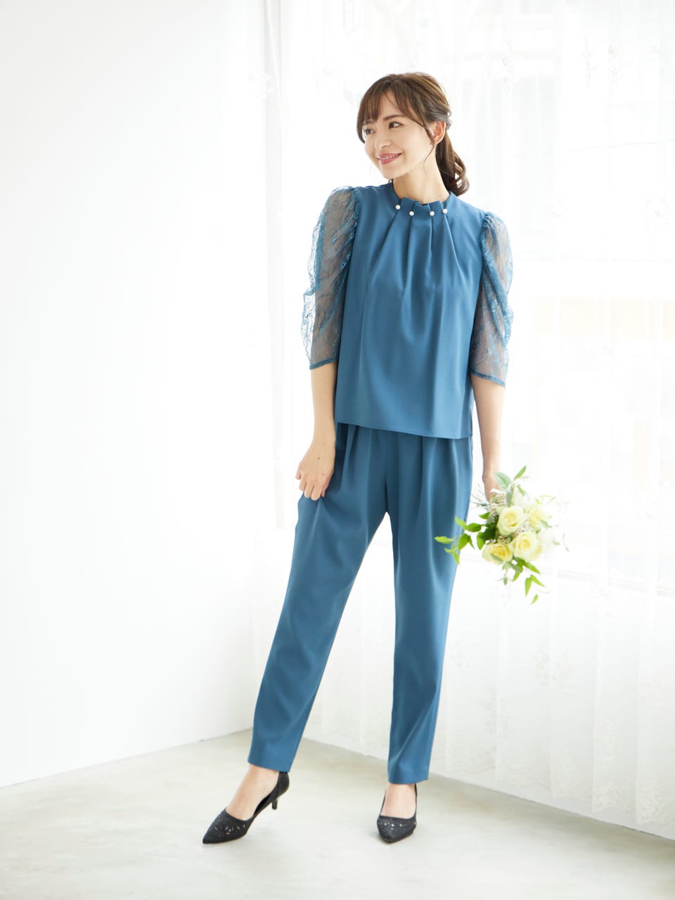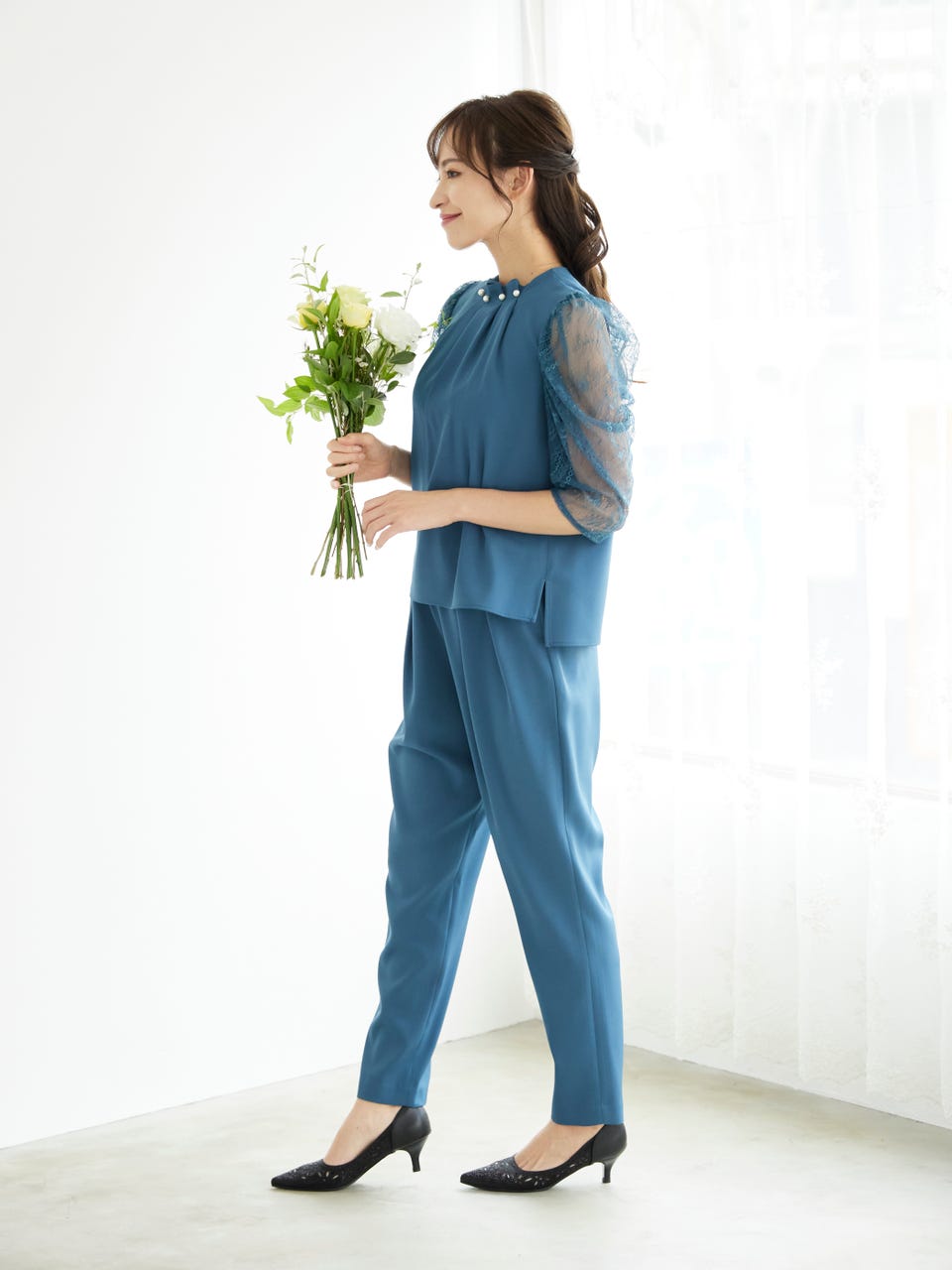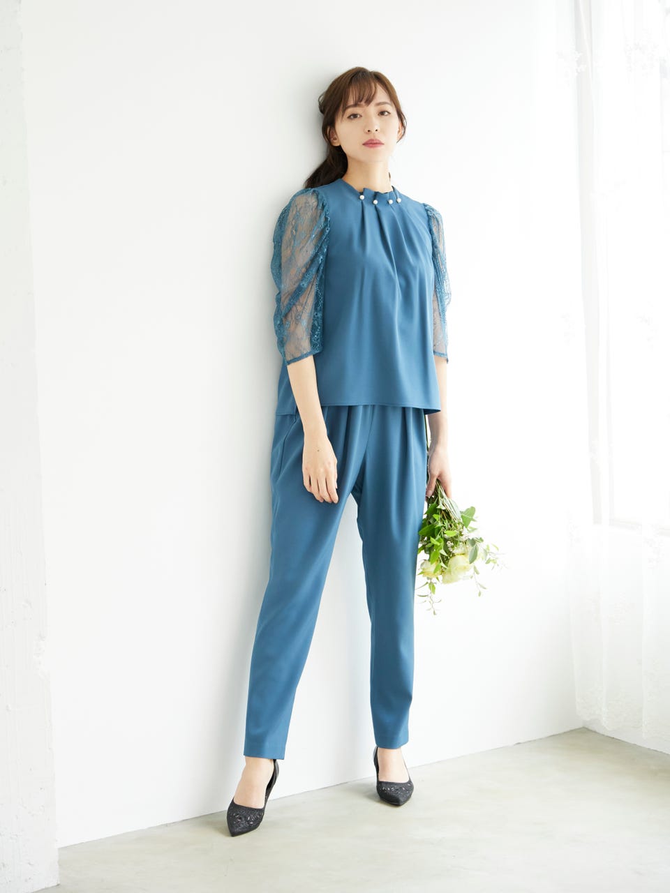 アクセサリーいらずな、上品で華やかなパンツドレスです。