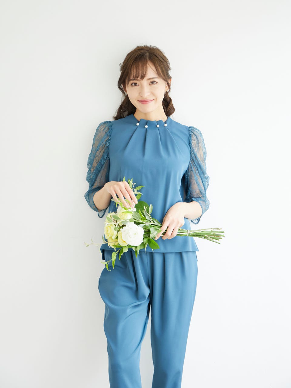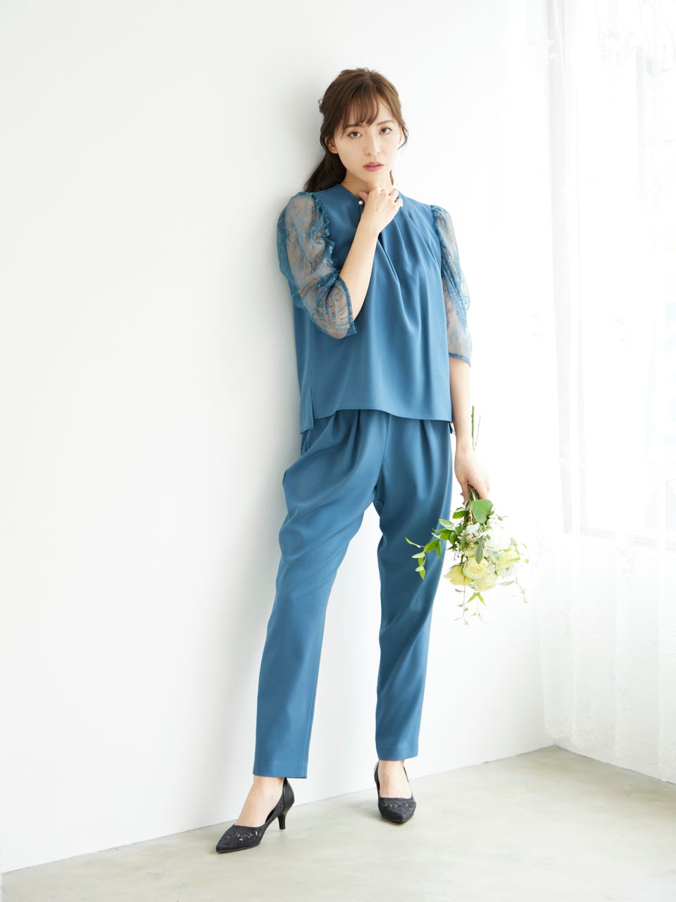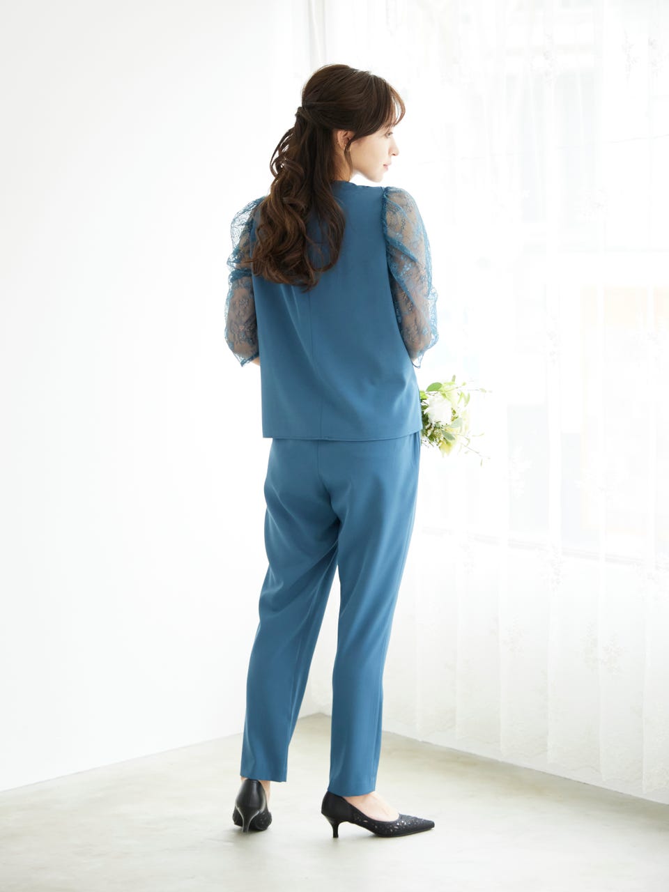 アクセサリーいらずな、上品で華やかなパンツドレスです。