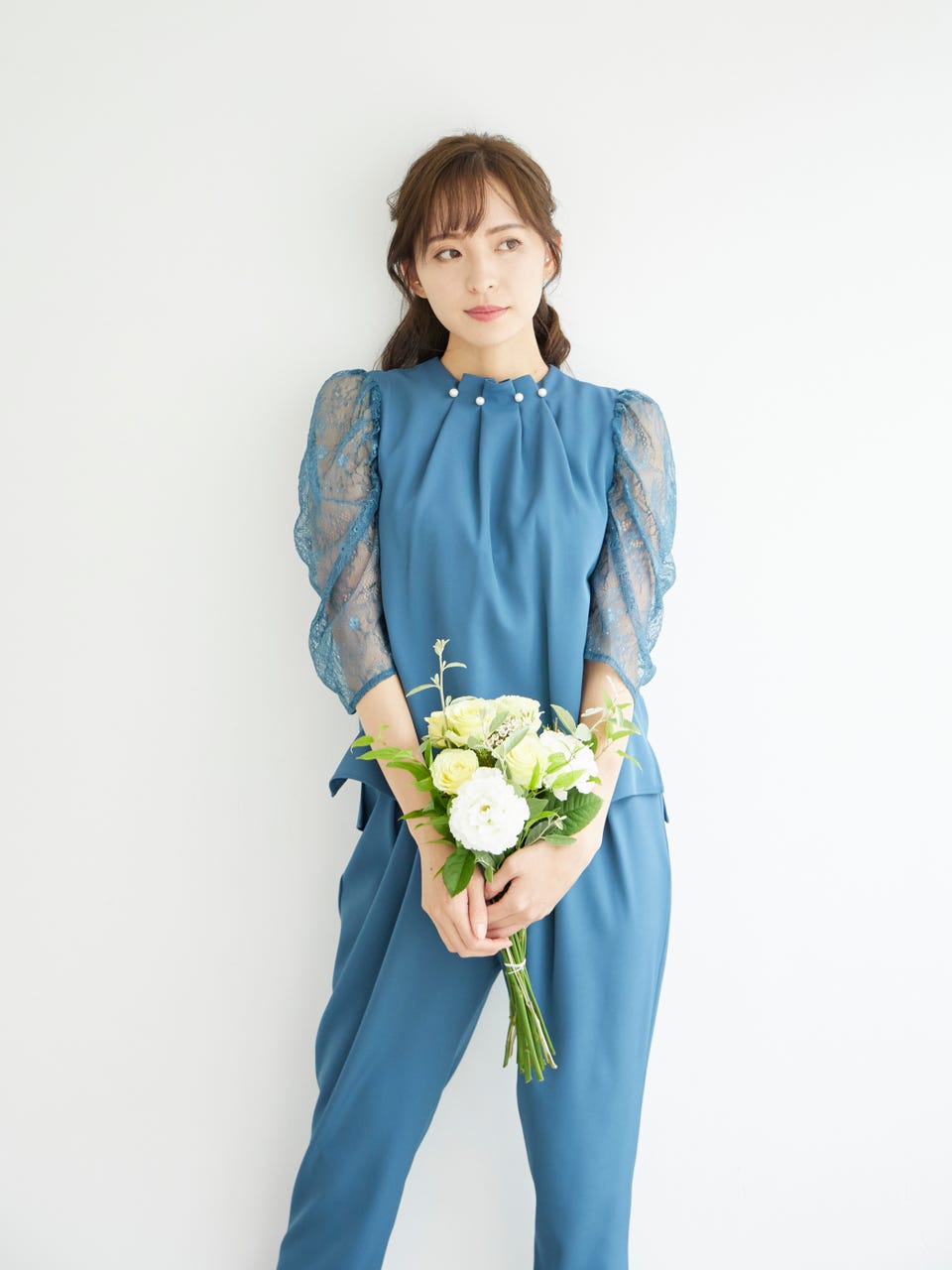 首元にあしらったパールとシャーリングのレースにより、