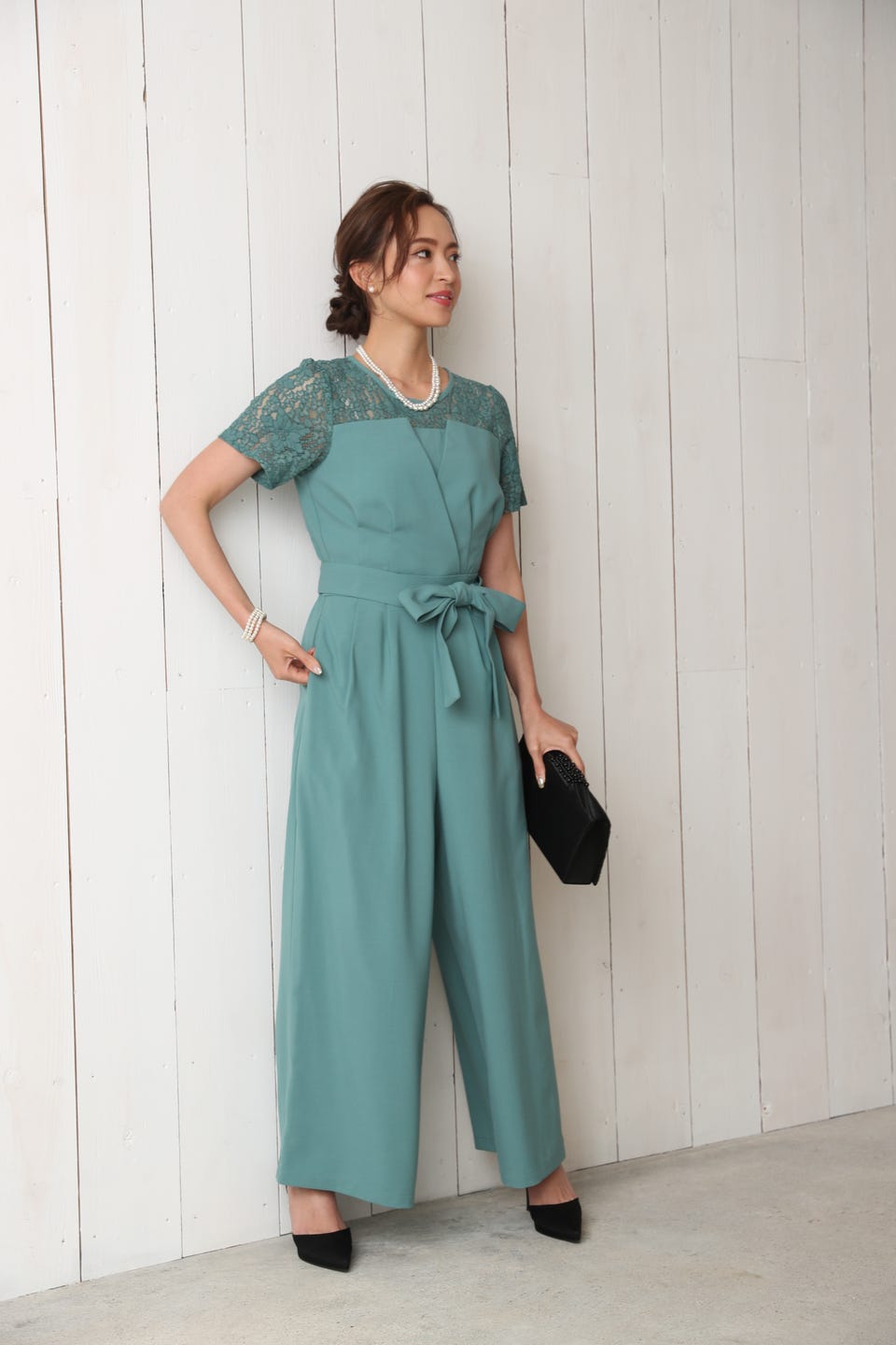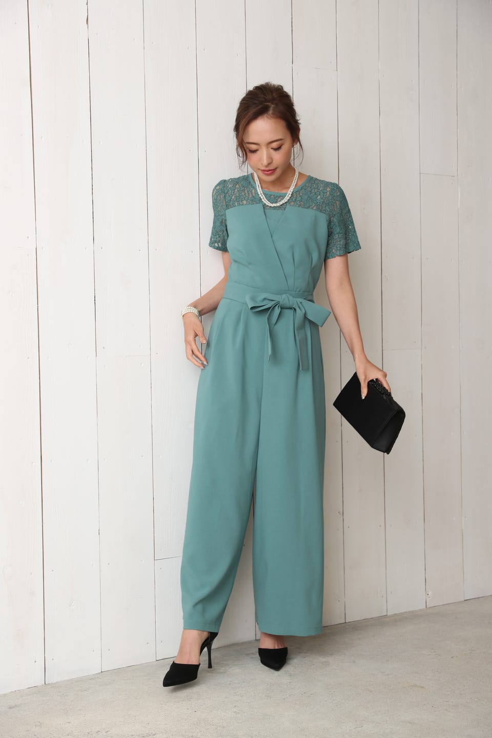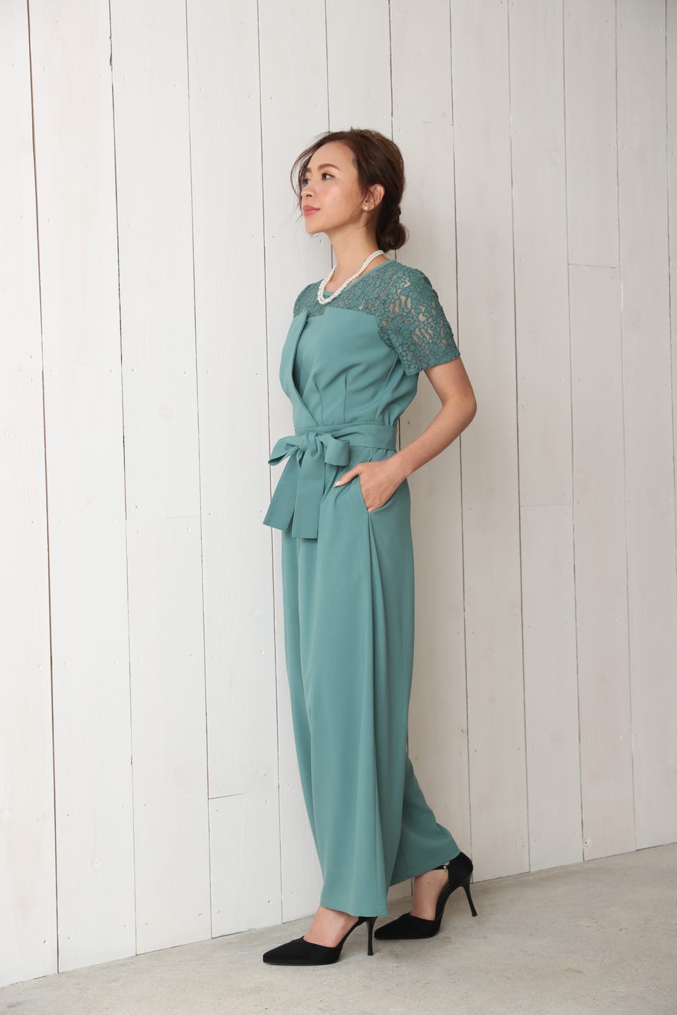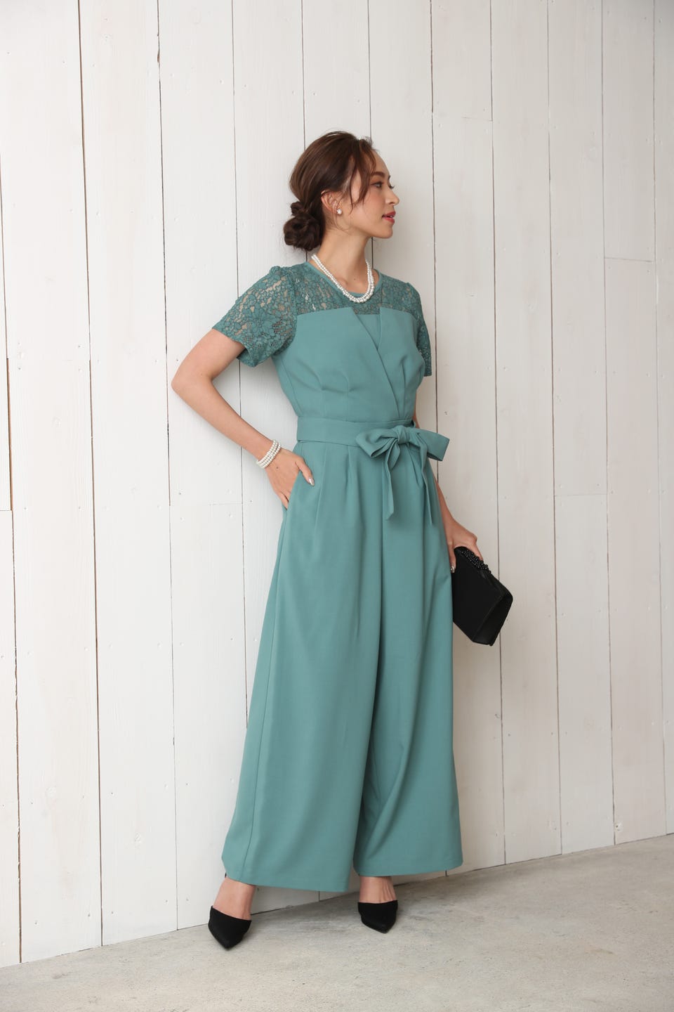 デコルテ部分から袖までレースであしらったエレガントでお洒落なオールインワンタイプのワイドパンツドレス。