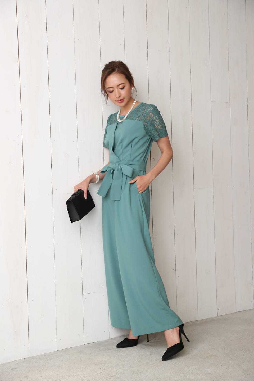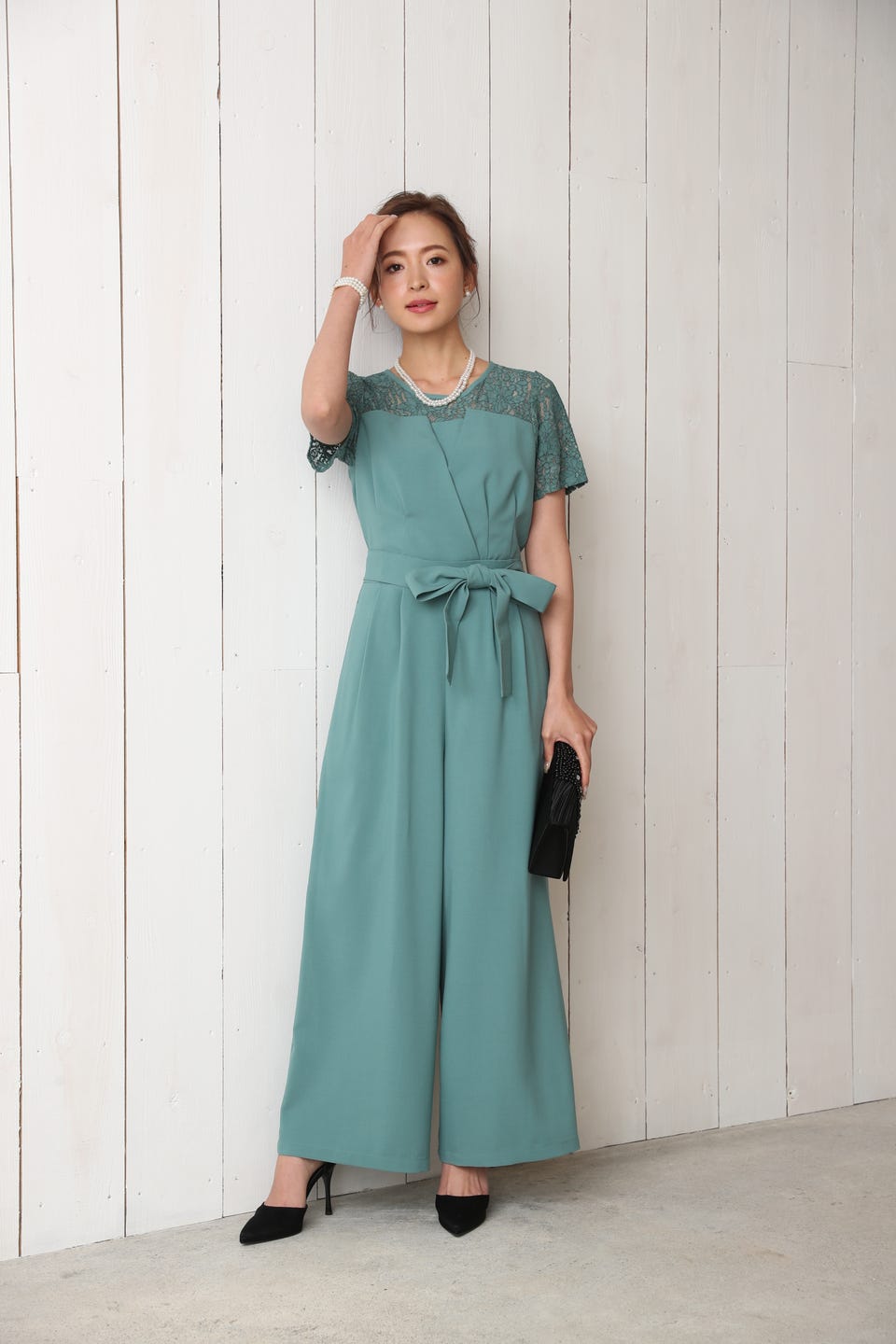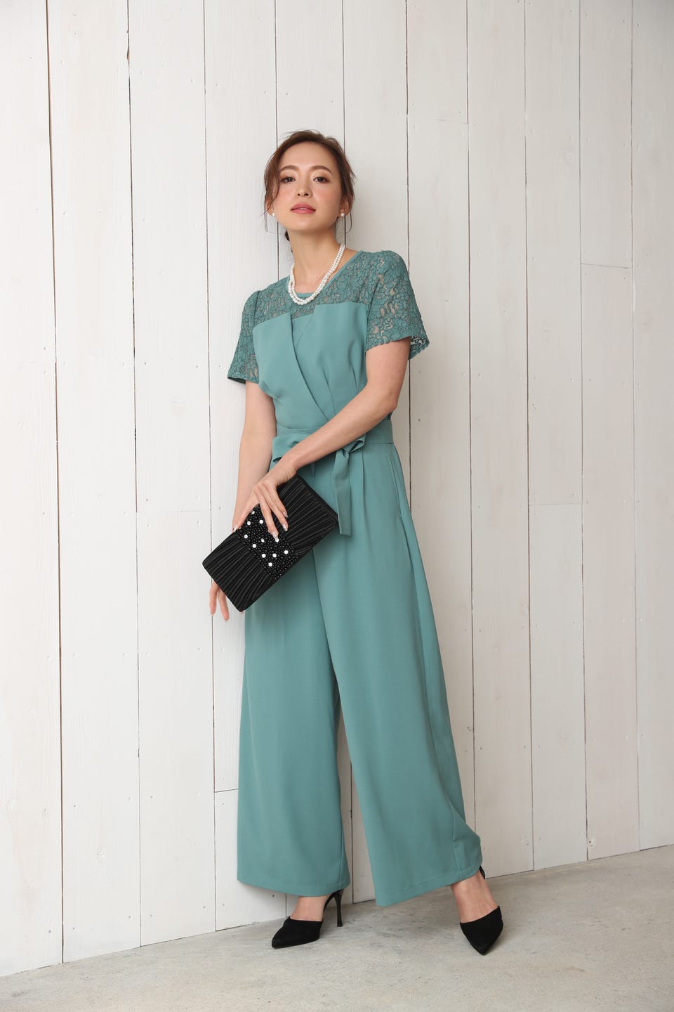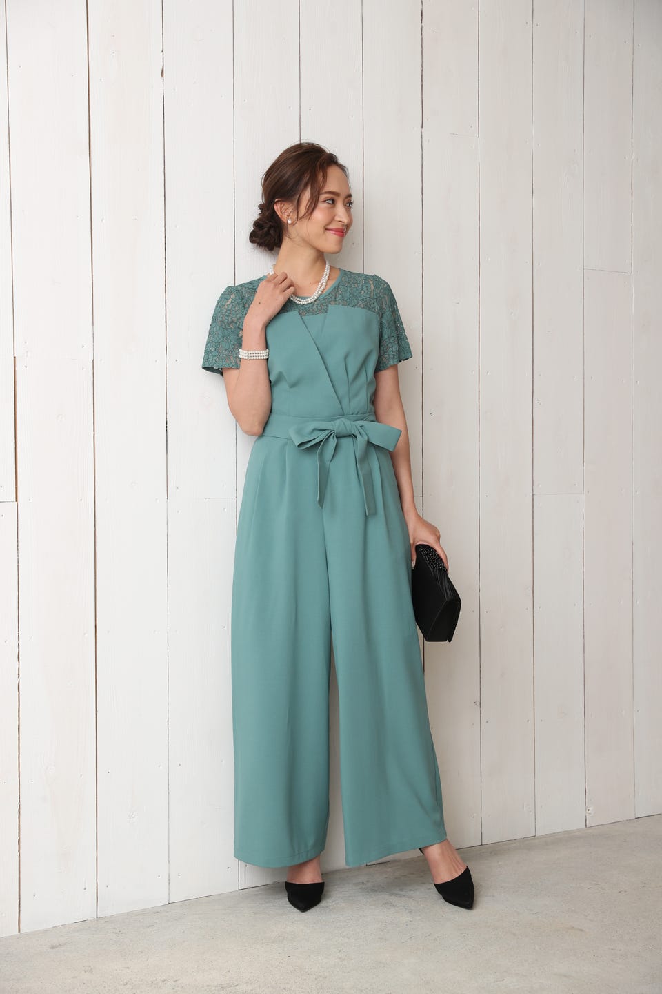 デコルテ部分から袖までレースであしらったエレガントでお洒落なオールインワンタイプのワイドパンツドレス。
