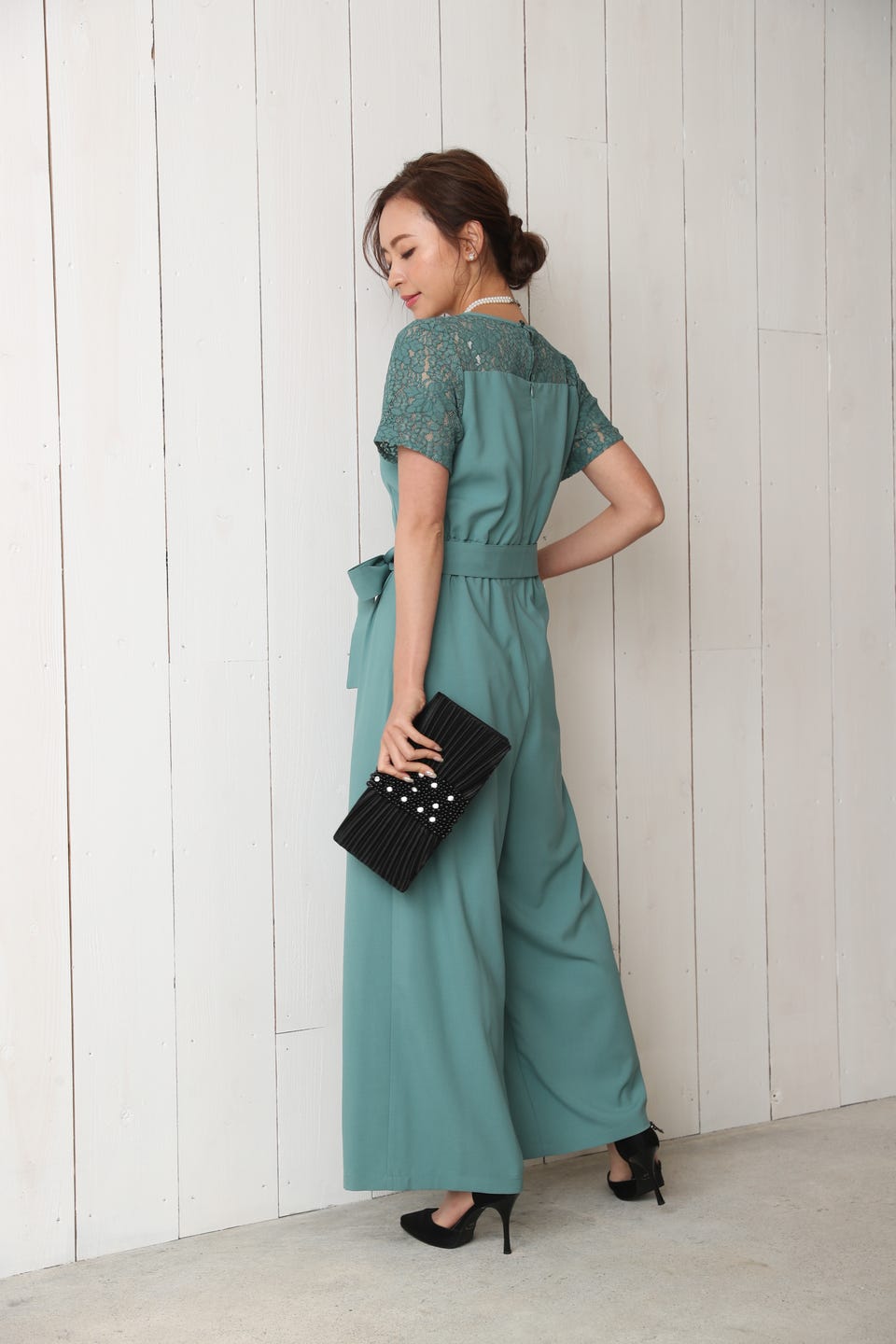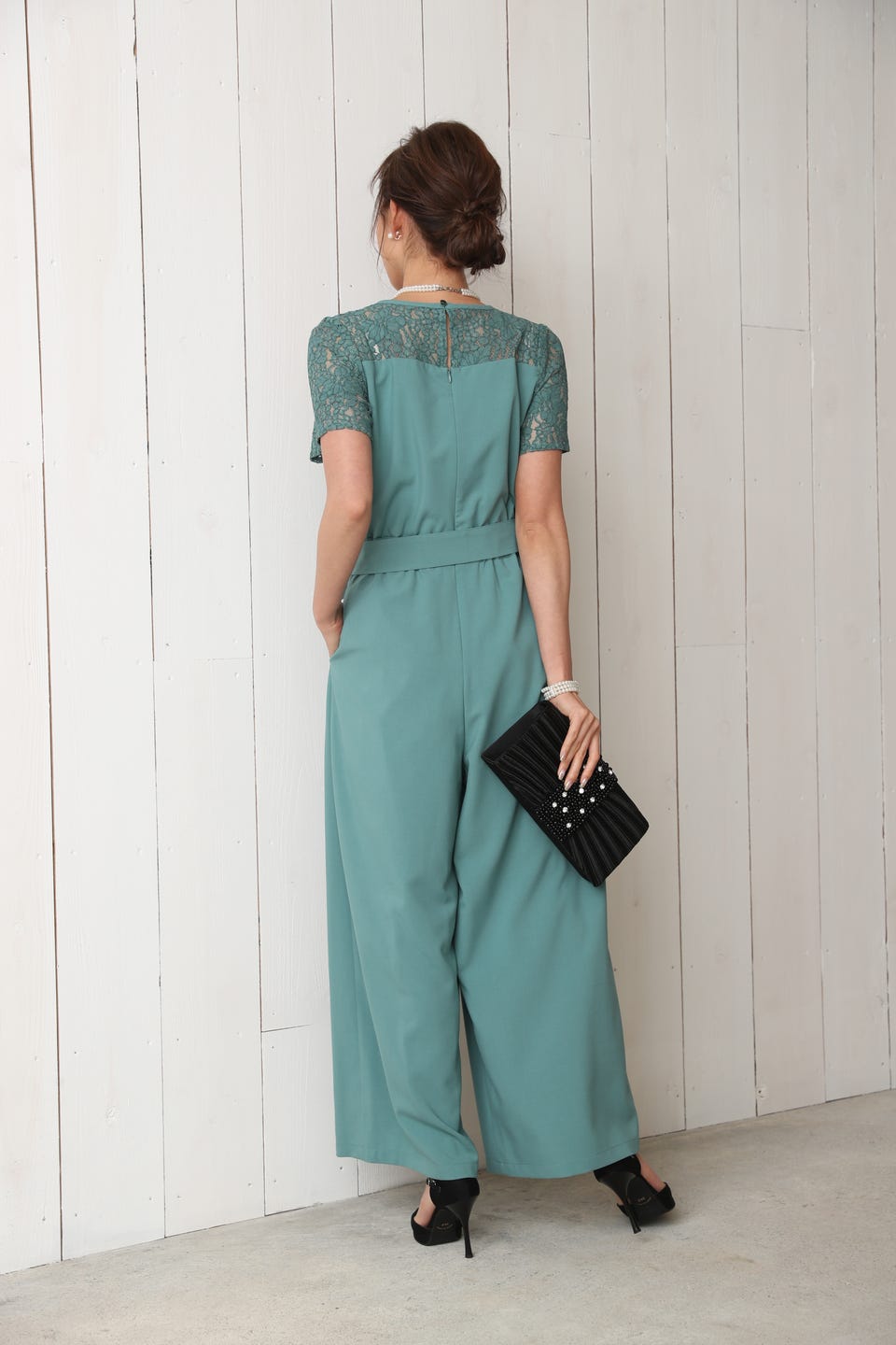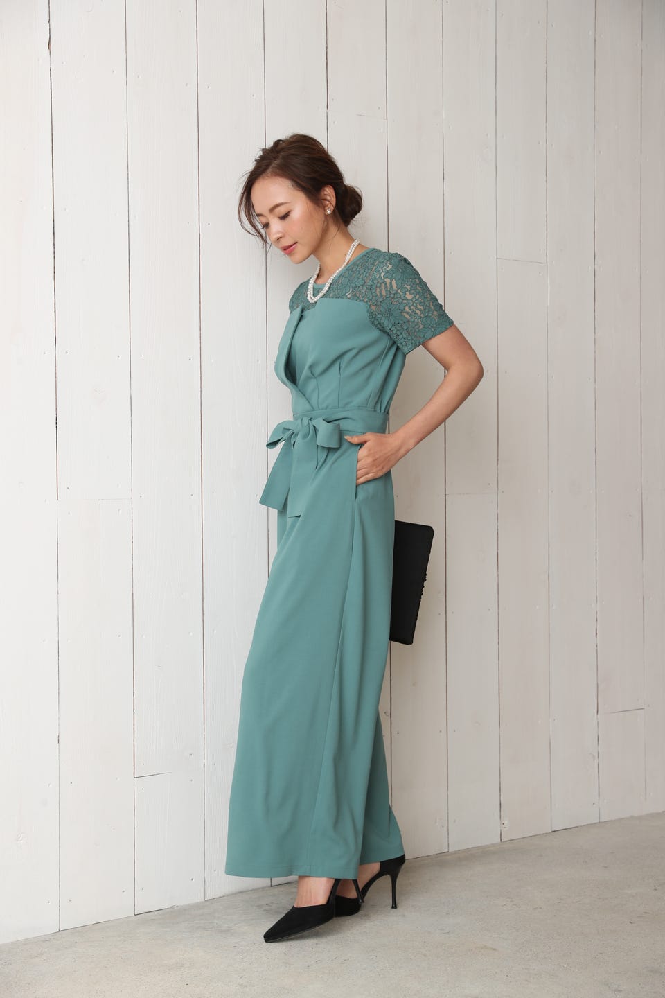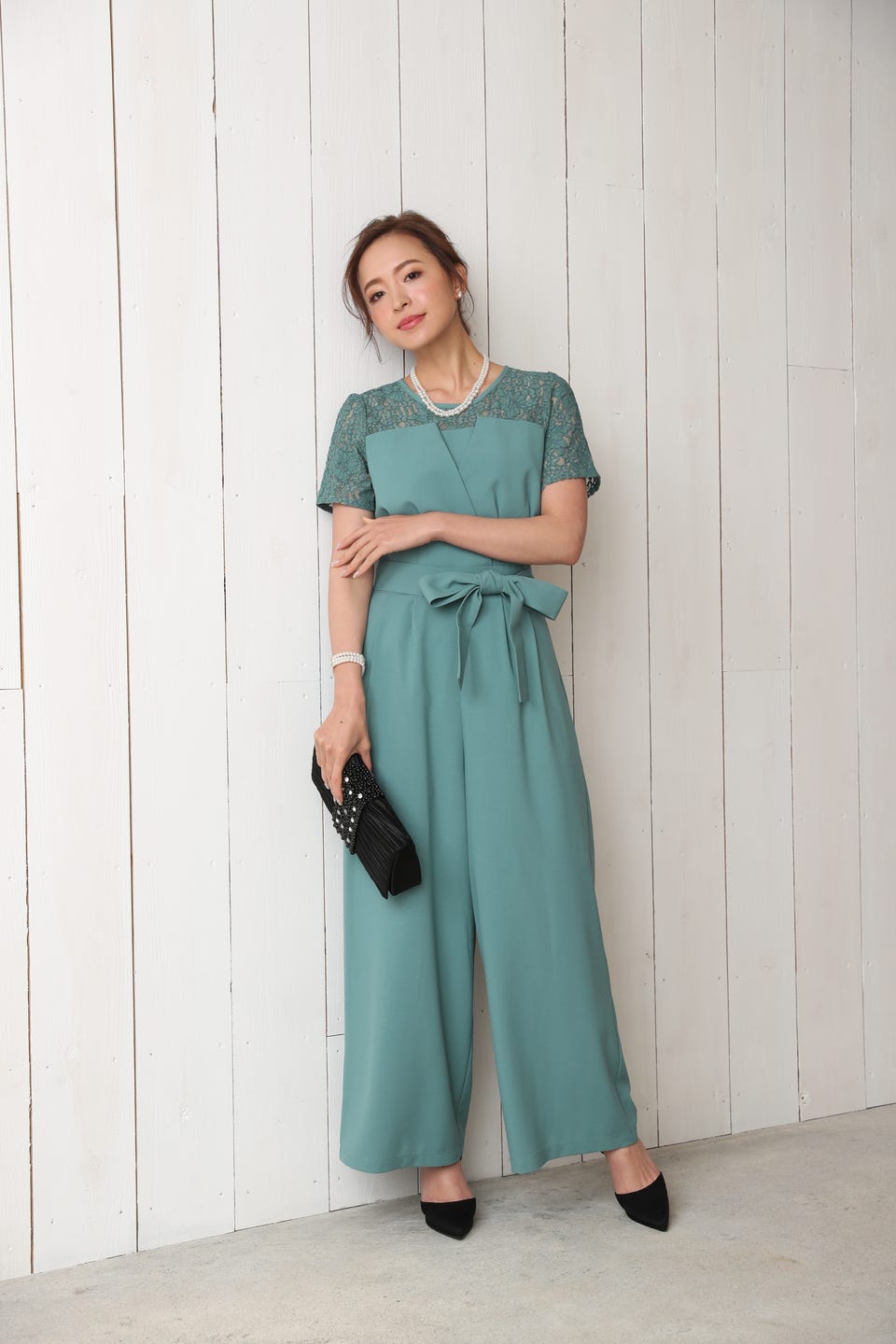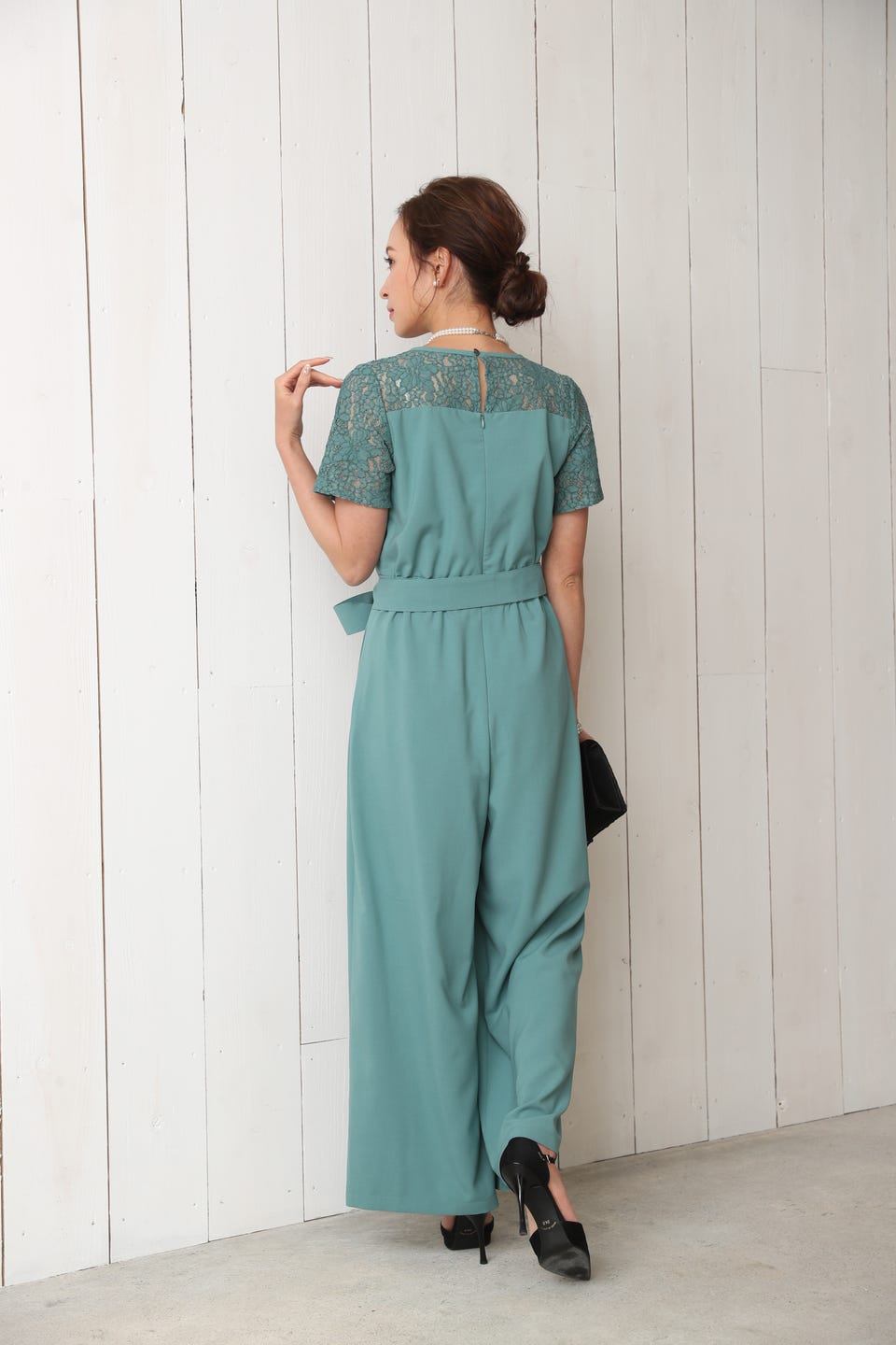 デコルテ部分から袖までレースであしらったエレガントでお洒落なオールインワンタイプのワイドパンツドレス。
