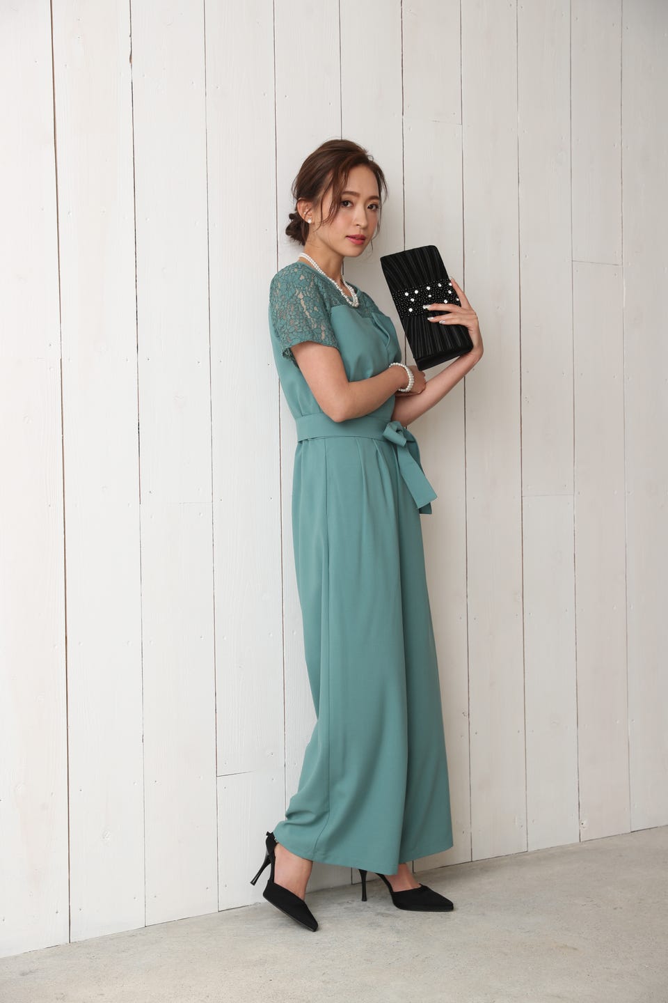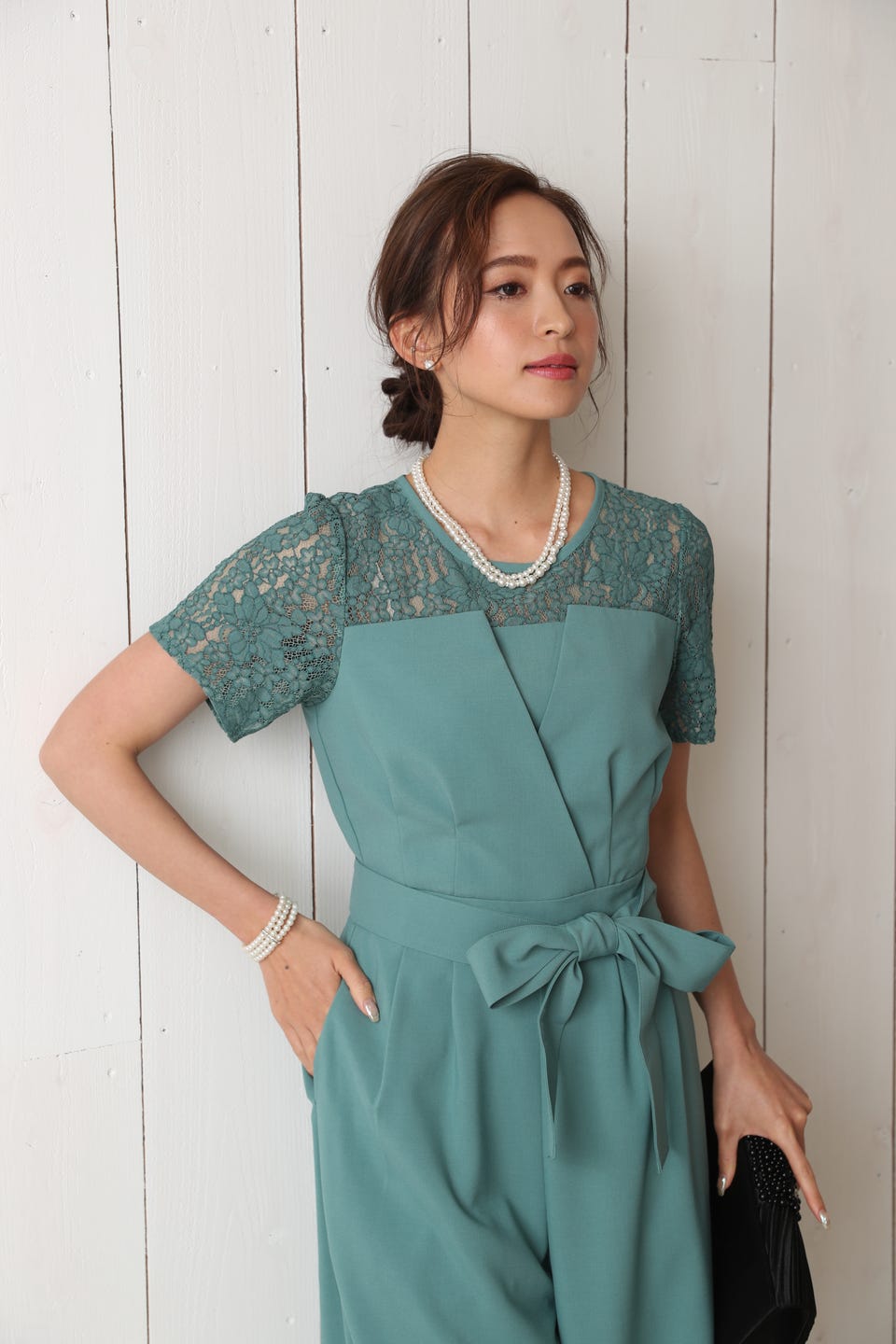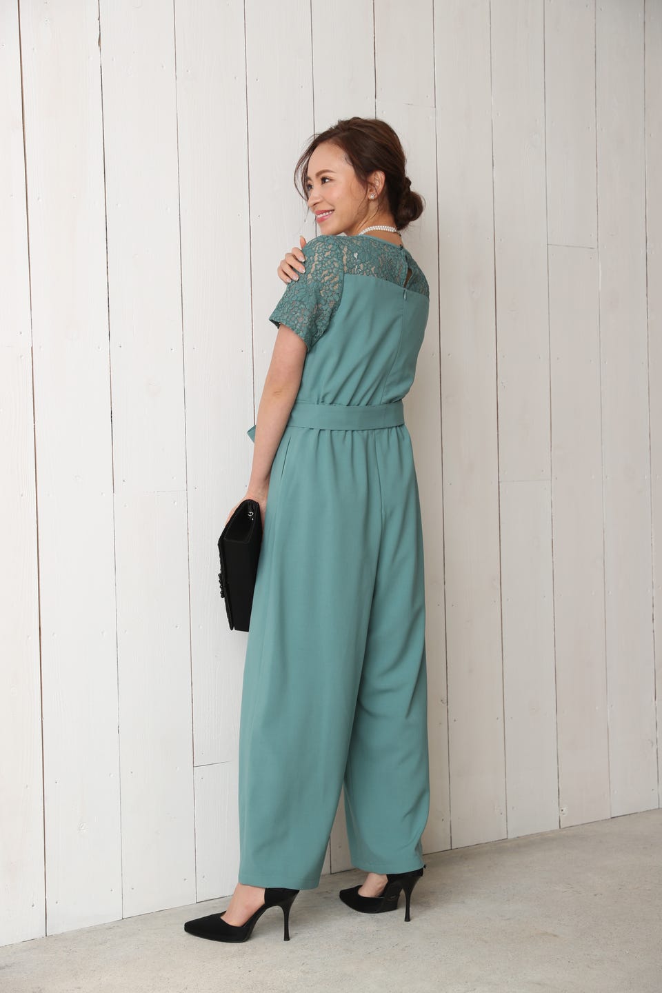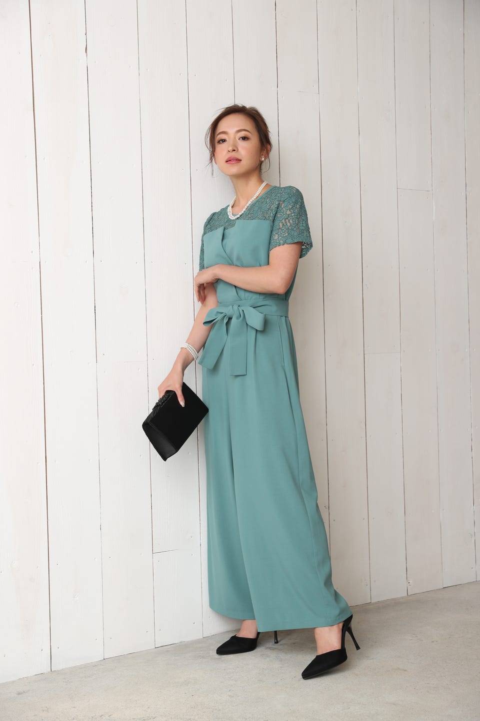デコルテ部分から袖までレースであしらったエレガントでお洒落なオールインワンタイプのワイドパンツドレス。