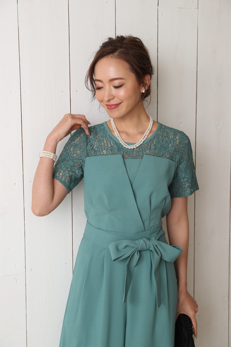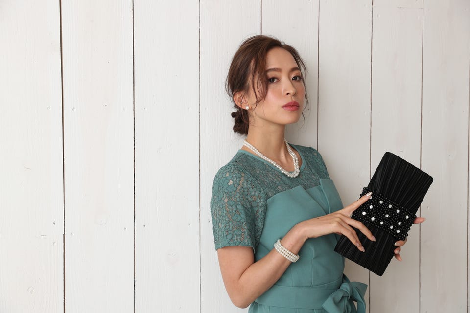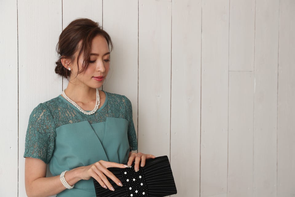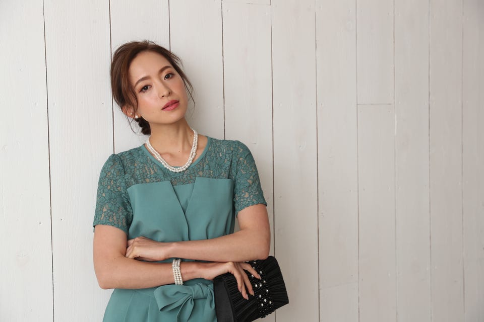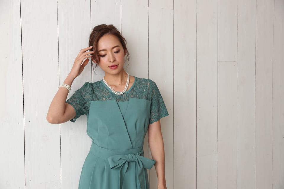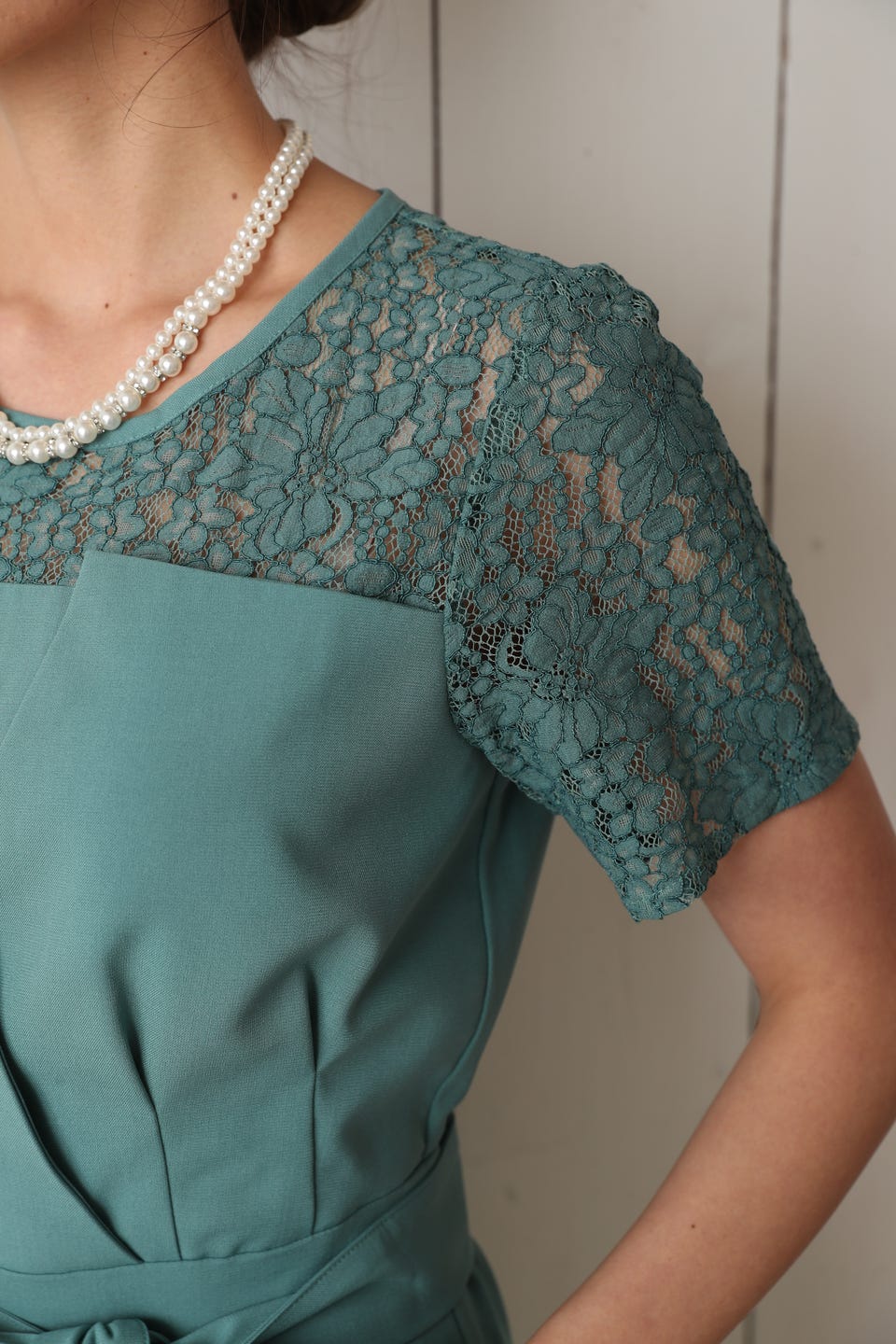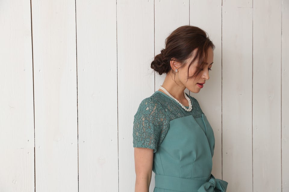 胸元のレースの透け感により、スッキリ感を演出し袖のレースで二の腕もカバー