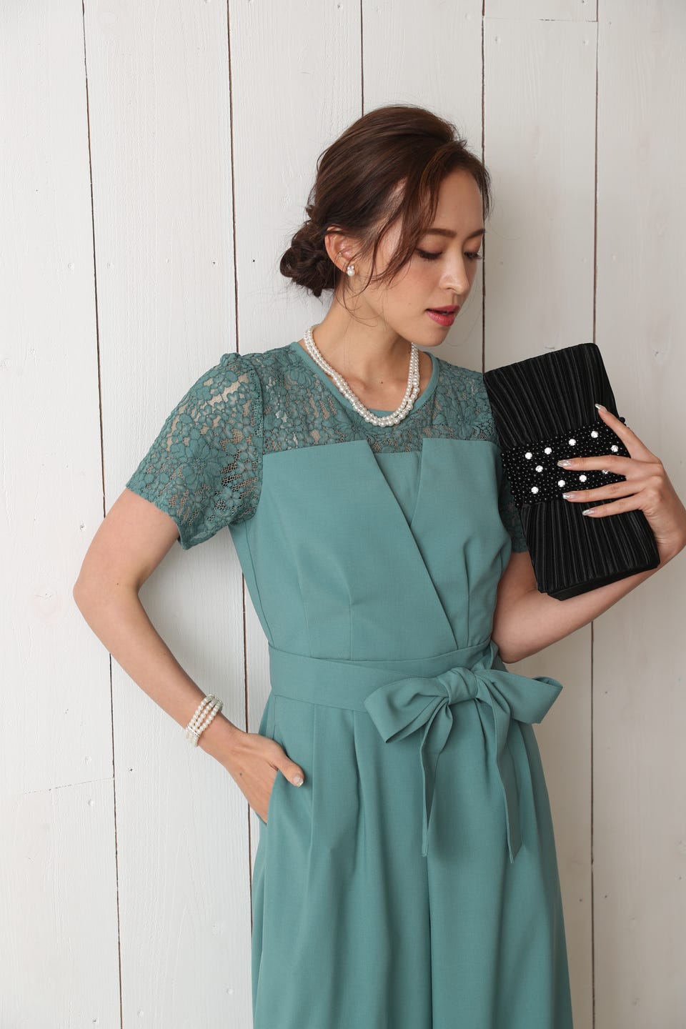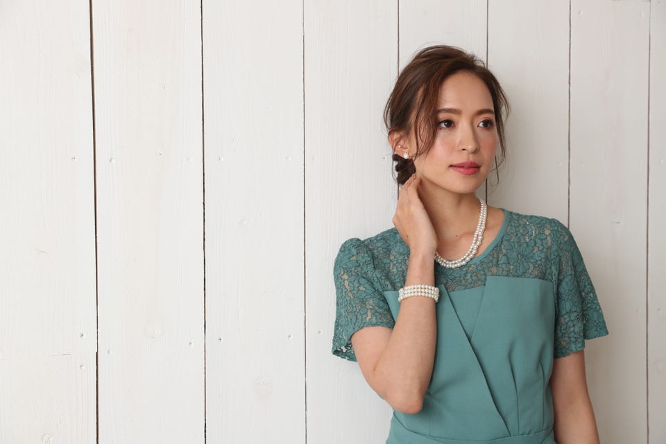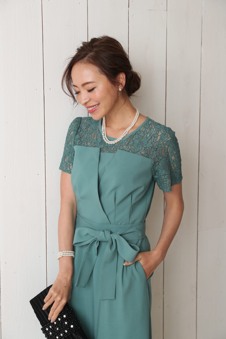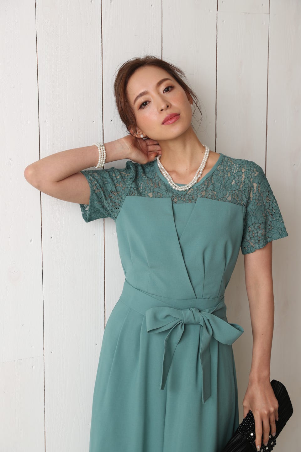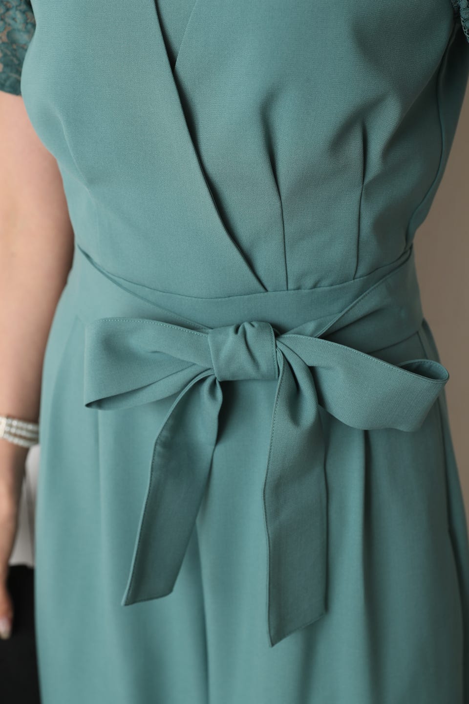 胸元のレースの透け感により、スッキリ感を演出し袖のレースで二の腕もカバー