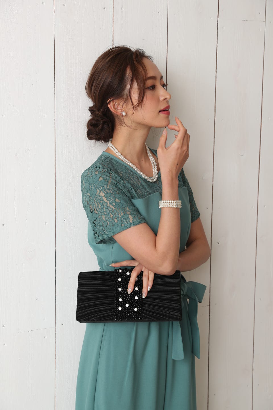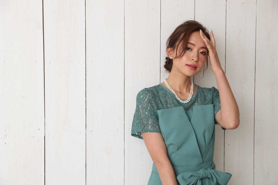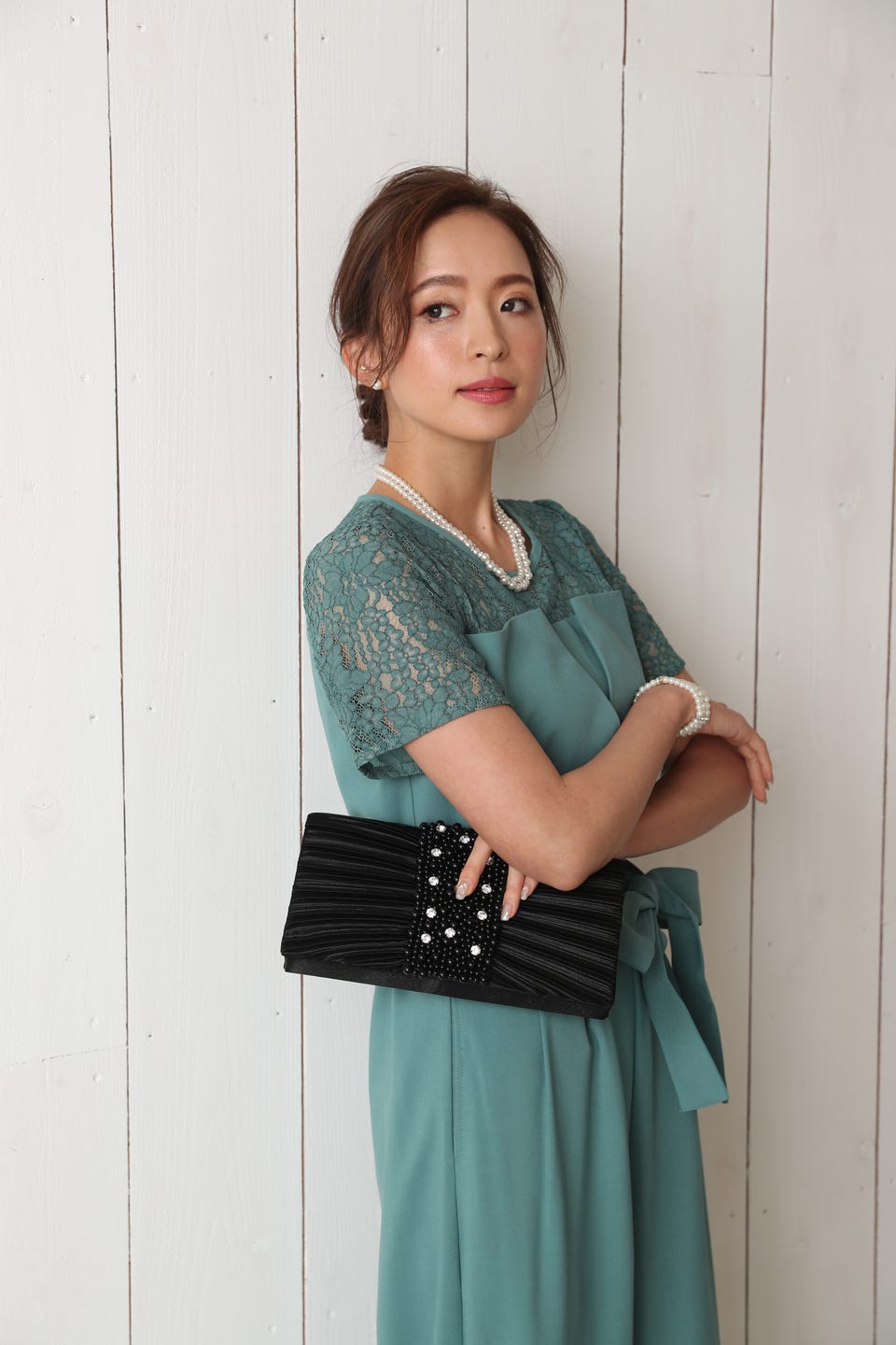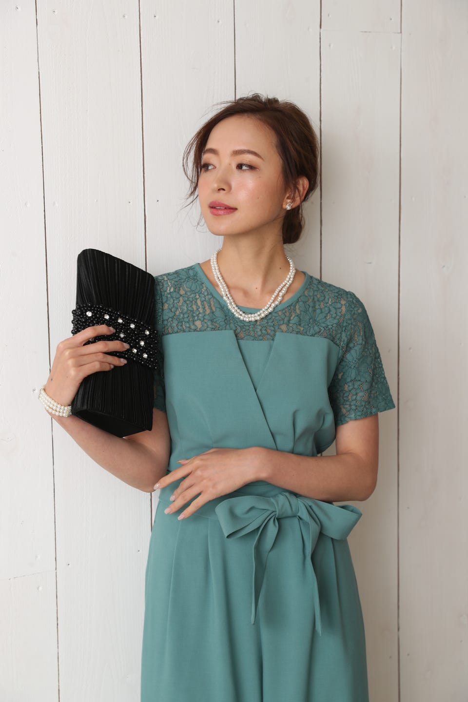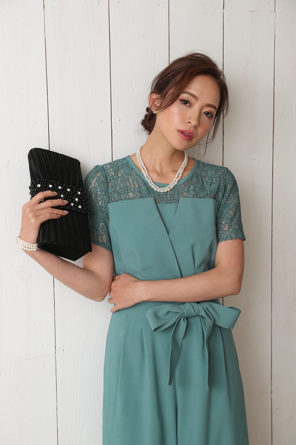 胸元のレースの透け感により、スッキリ感を演出し袖のレースで二の腕もカバー