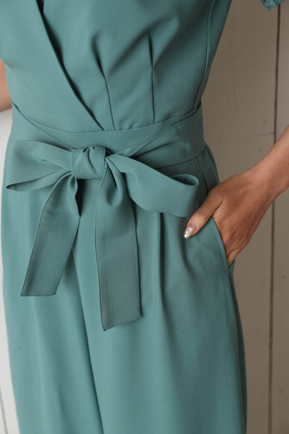 BELINDA DE CAPRIS 袖付きタックテーパード オールインワン パンツドレス ミント Lサイズ