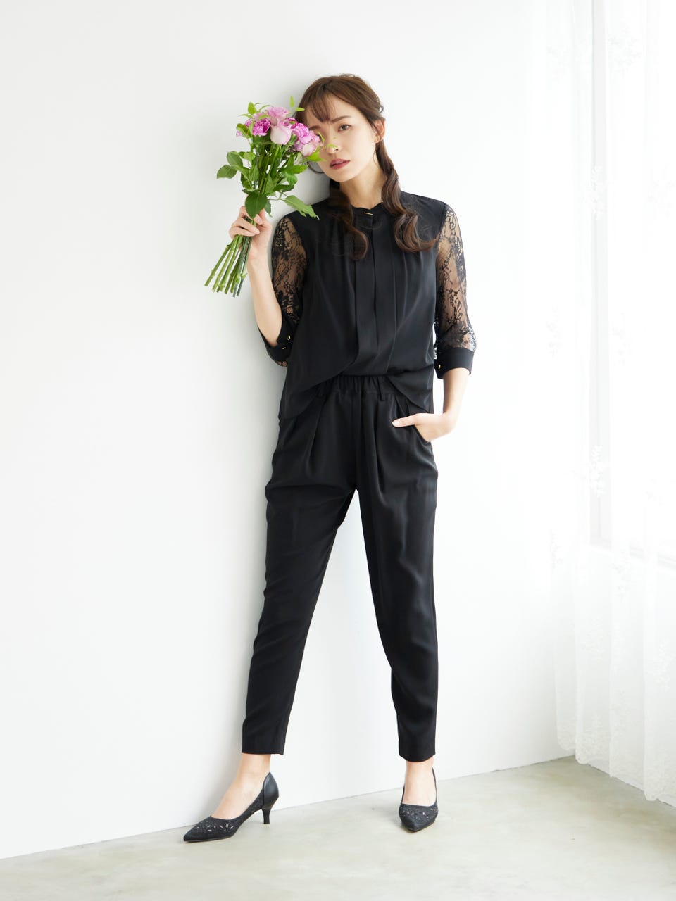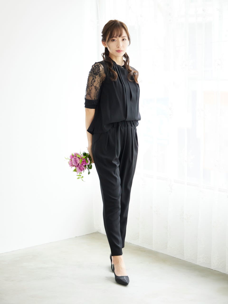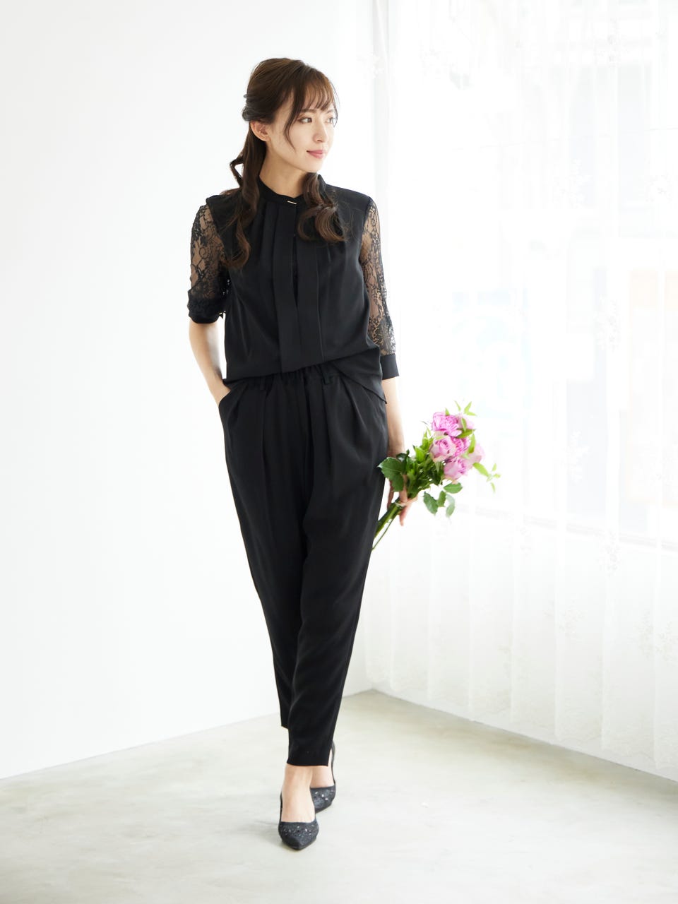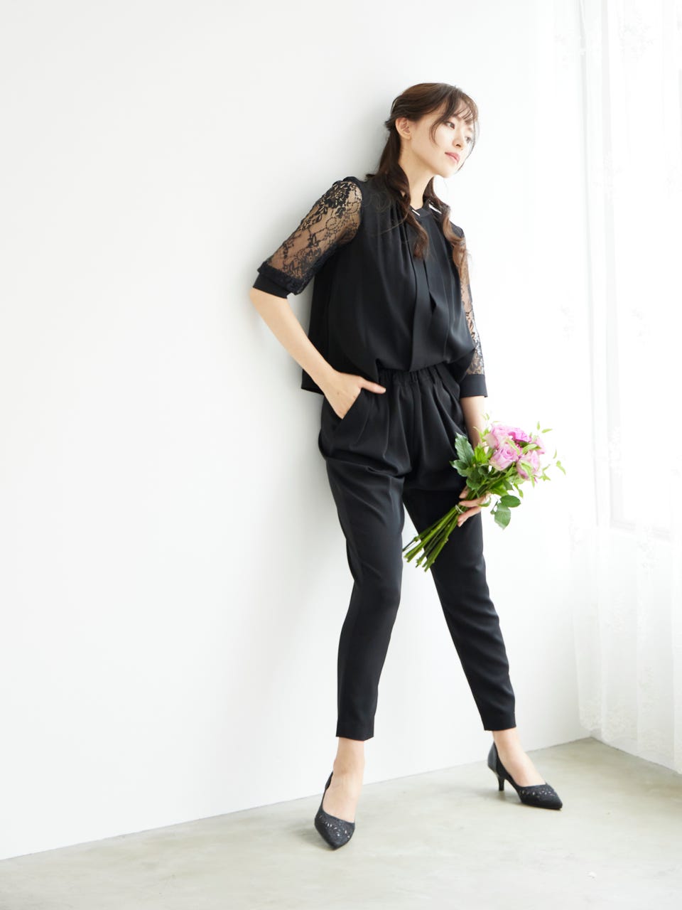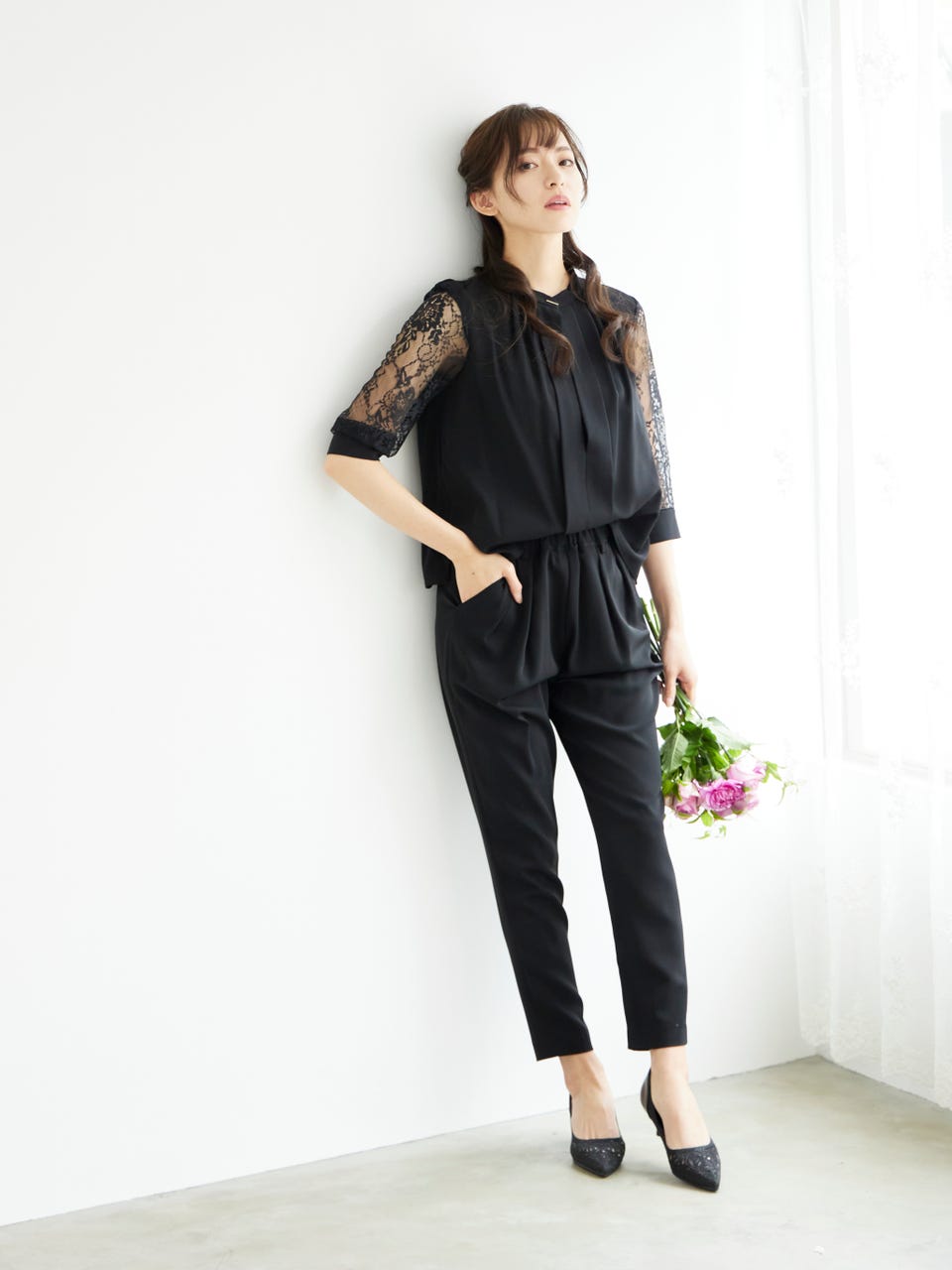 透け感のあるレース袖が魅力のパンツドレス