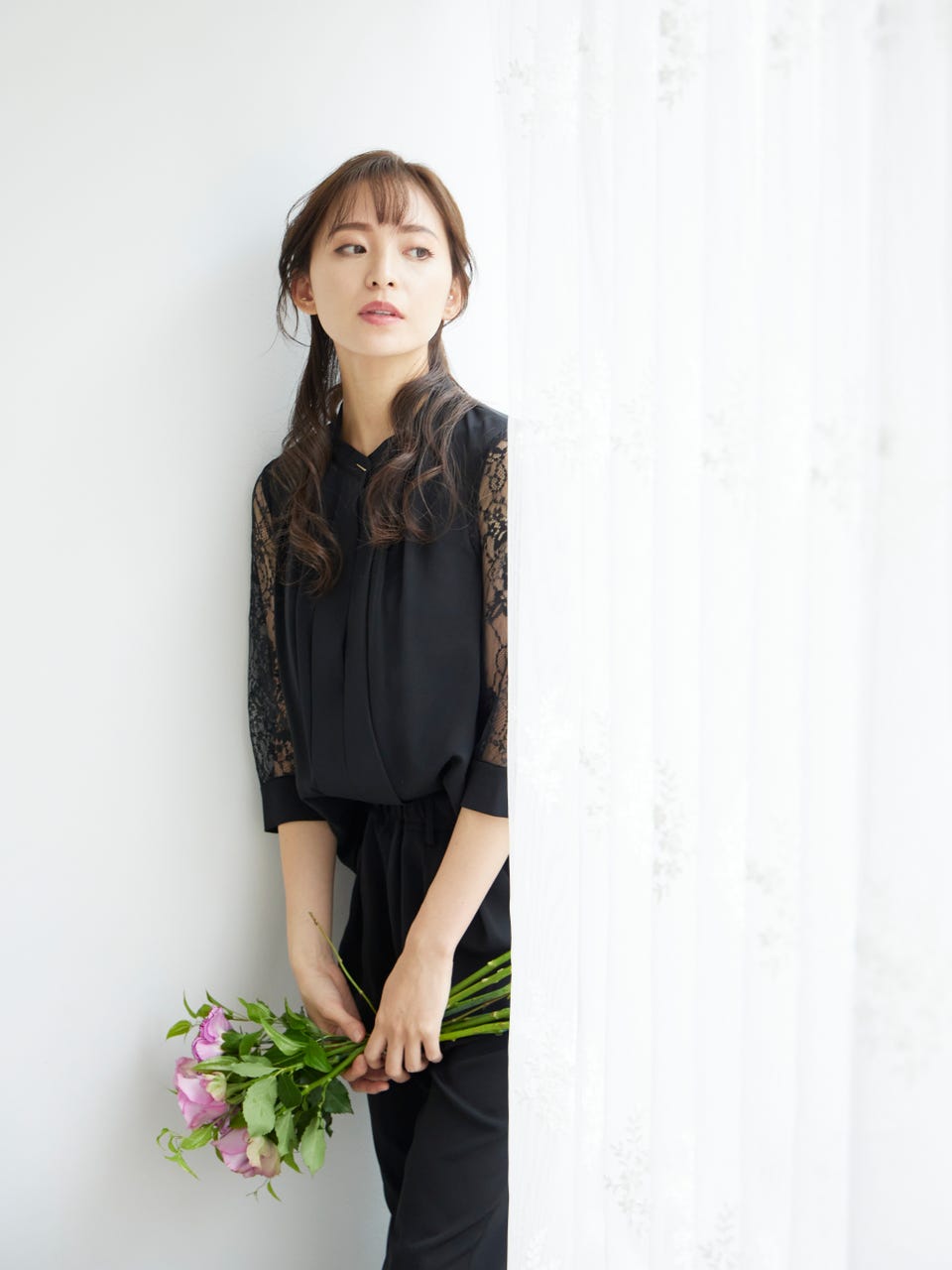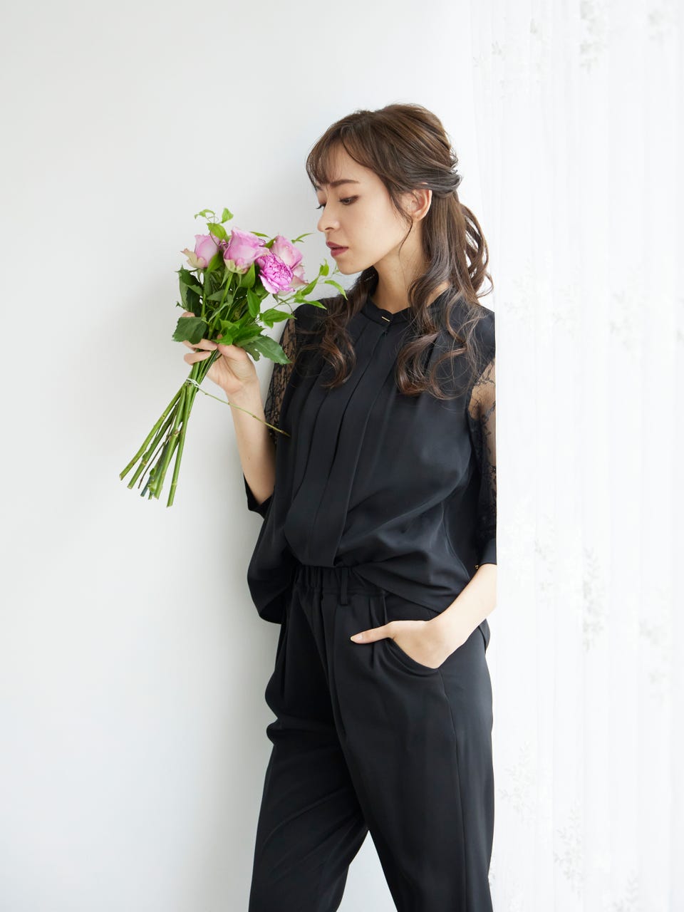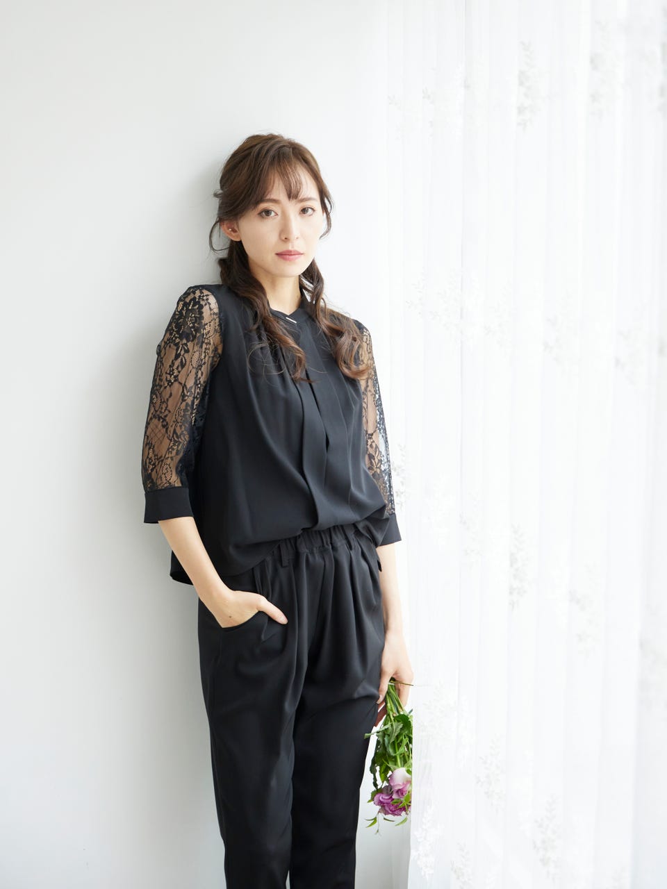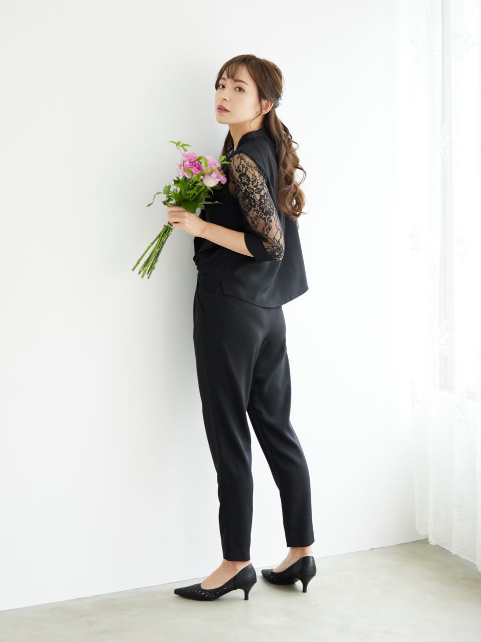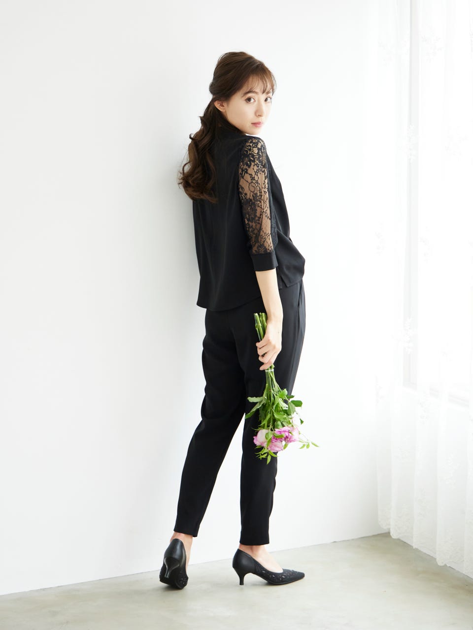 透け感のあるレース袖が魅力のパンツドレス