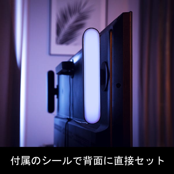 付属のクリップと両面テープを使用して Philips Hue Play スマート ライト バーをご使用の画面の背面に取り付けます。すぐに好みの色でお洒落な間接照明を楽しむことができます。