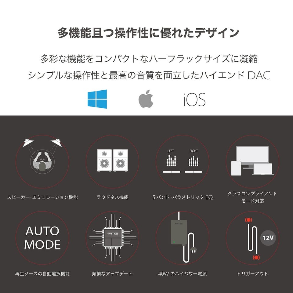 - CoreAudio、WDM、ASIOに完全対応、クラス・コンプライアント・モード対応