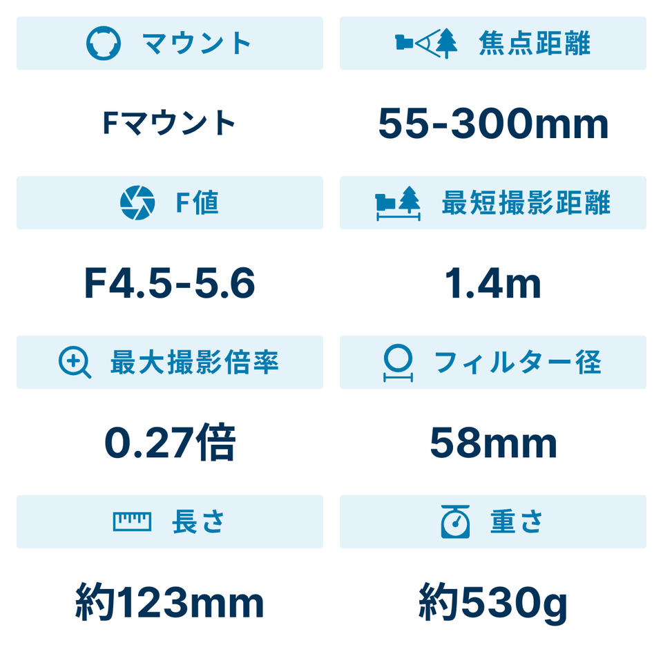 | 最大絞り | 焦点距離55mm時:f/4.5 焦点距離300mm時:f/5.6 |