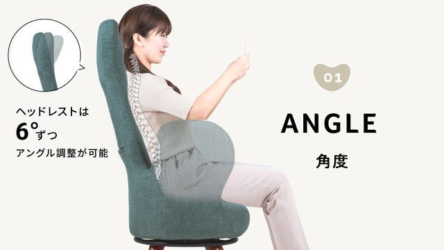 圧迫感なく座れて、安らぎながら自然なS字カーブを保ちやすくする背もたれの角度にし、アームレストの高さとのコンビネーションでうつむかない姿勢を保ちます。