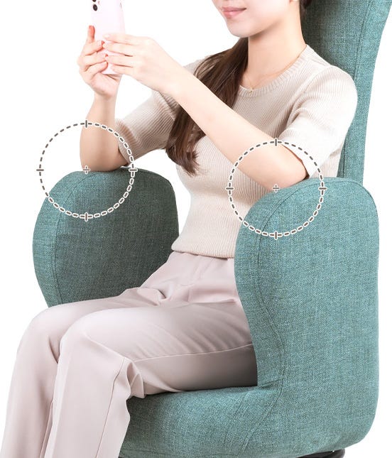 なぜうつむいてしまうのか。それは腕の支えがないからです。人体計測値に基づいて導き出した高さのアームレストがスマホや本・ゲーム機を持つ腕を高い位置で支えてくれるので、目線が前を向き、首・腰が曲がらずに済むのです。