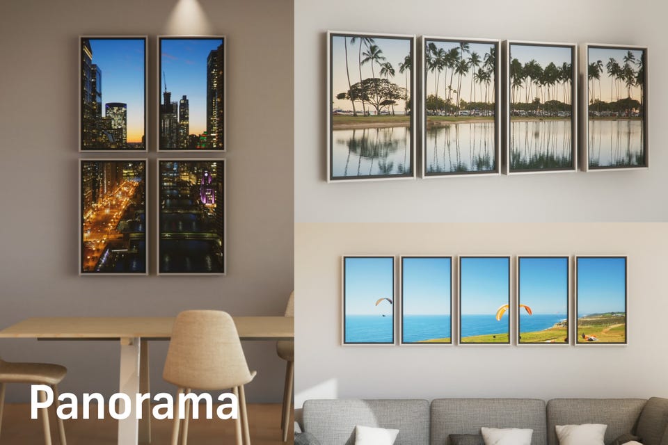 窓を縦や横につなげることで、よりワイドに迫力のある風景を楽しめます。最大5台まで、横に一列、さらには上下に2台ずつの設置に対応し、様々な大きさの壁にもフィット。海中の魚たちが窓から窓へと悠々と泳ぎ回る様子や、窓から窓に渡って広がる、カリブ海のリゾート地。目の前に広がる風景で、圧倒的な没入感を体験できます。