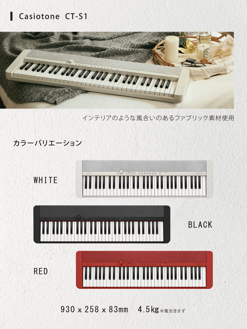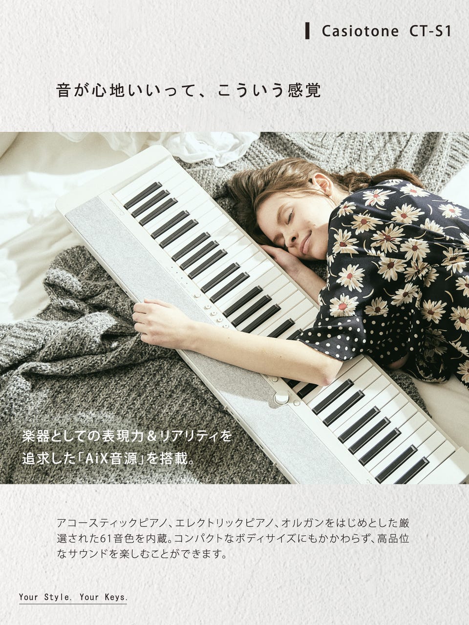 鍵盤、スピーカー、最低限のボタンのみで構成されたシンプルな デザインは、ミニマルでありながら鍵盤楽器らしい美しさを併せ持っています。その軽やかな見た目は、どんな気分にもさりげなく 寄り添います。