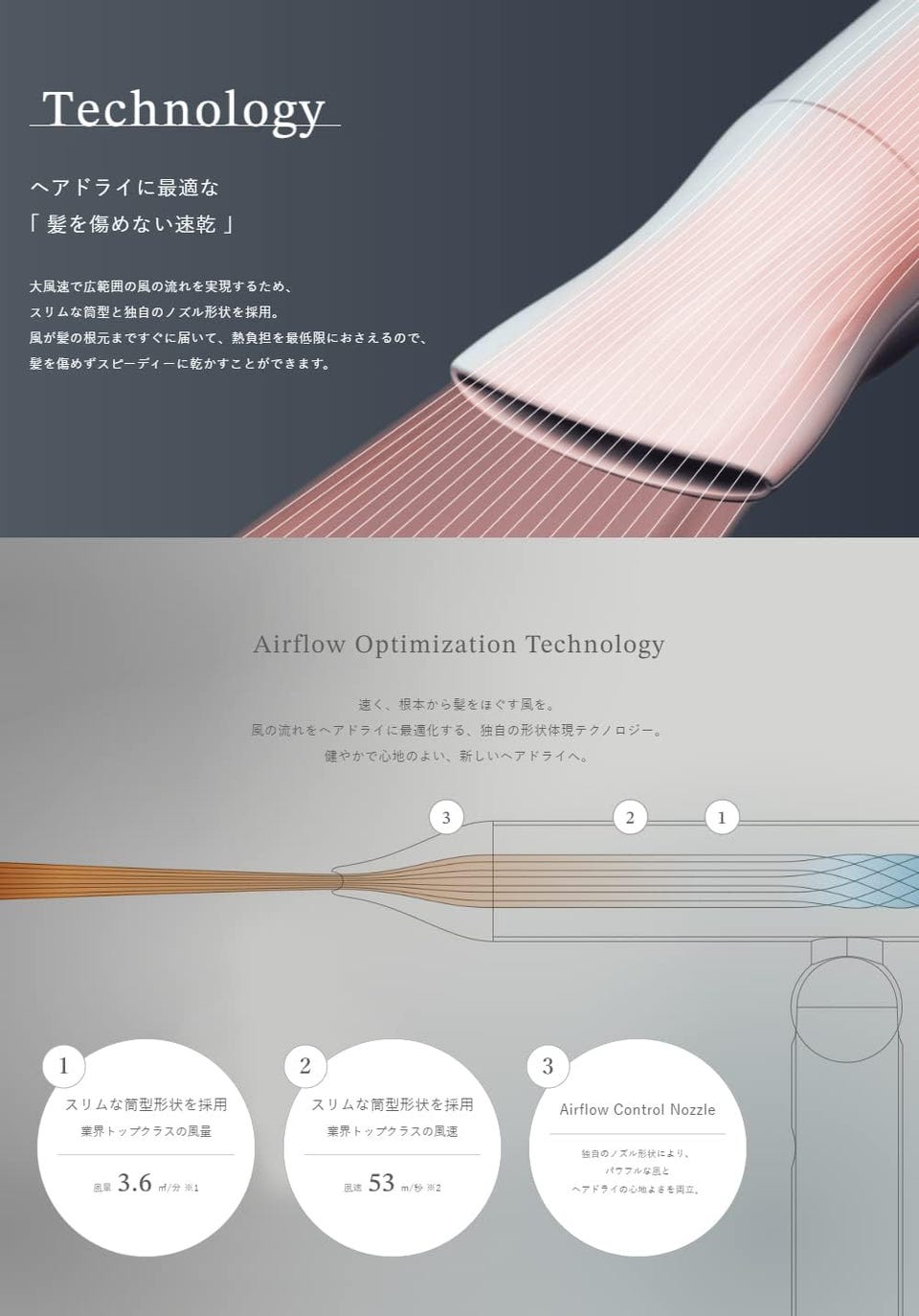 風量 3.6㎥/分(ノズルありの場合)、風速 53m/秒(ノズルなしの場合)
