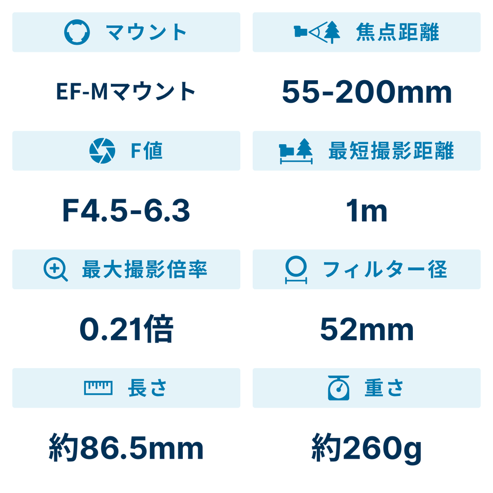全長86.5mm、重量約260gと、ミラーレスEOSの魅力を損なわないコンパクトサイズで、いつでも持ち運べる望遠のスナップズームとして活躍します。